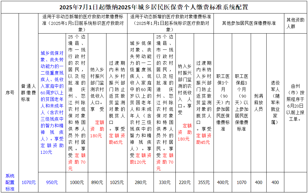 注:动态新增医疗救助对象、刑满释放人员、退役军人及随军家属等特殊人员限1年内享受上述缴费政策。
