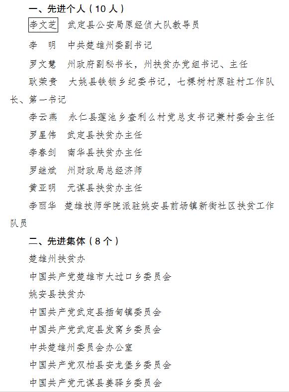 楚雄州全国脱贫攻坚先进个人和先进集体拟推荐对象名单(18名)