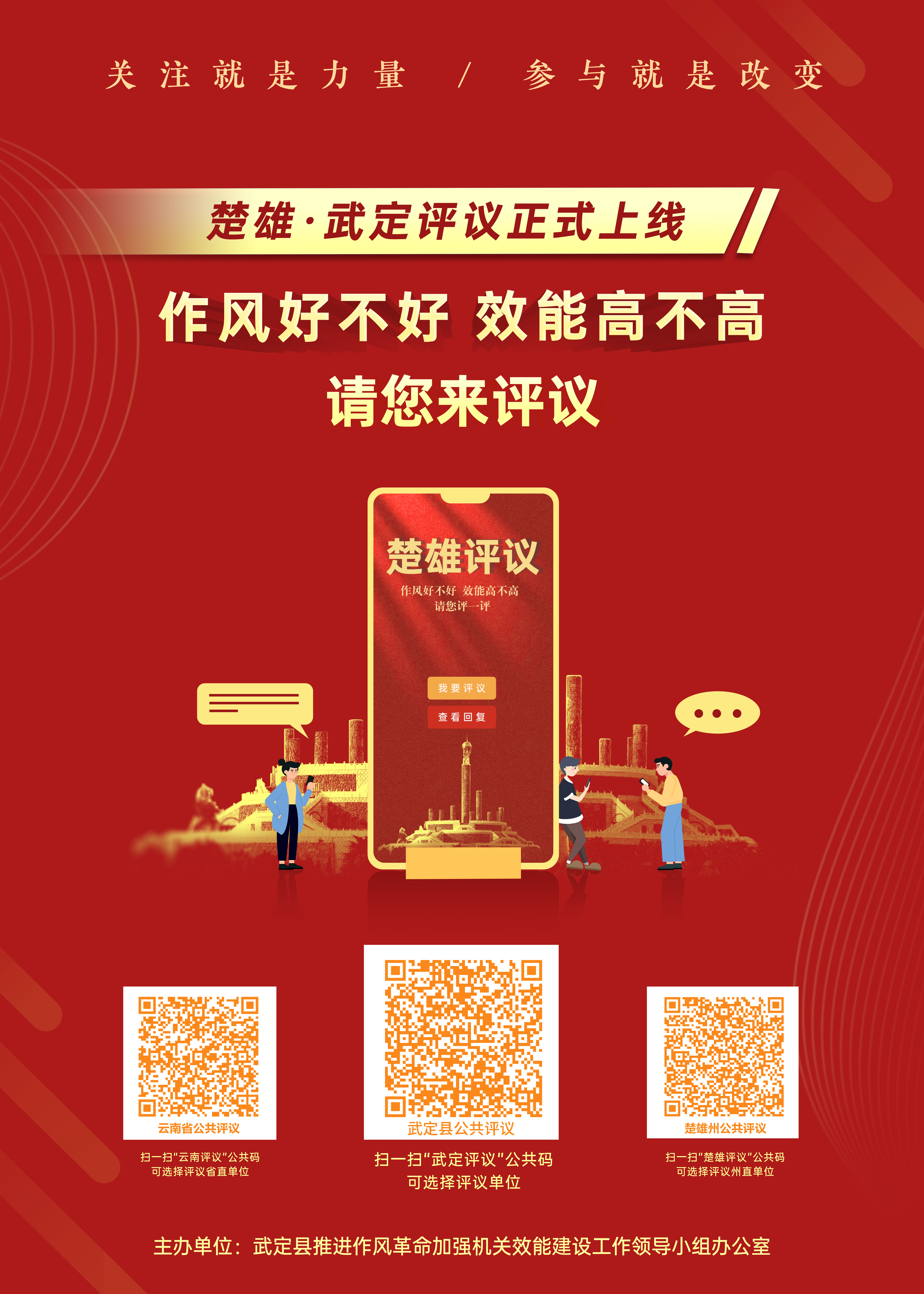 为深入贯彻落实党的二十大关于全面从严治党的战略部署、习近平总书记考察云南重要讲话精神以及省州县党委关于推进作风革命效能革命的工作要求,推进打造一流营商环境,更好地服务群众、服务基层、服务企业,武定县群众评议机关作风活动于2024年5月启动,60个单位列入作风评议范围,欢迎社会各界群众对武定县机关作风进行评议(名单附后)。您可登录武定县人民政府门户网站或在各单位办公楼、办事服务大厅、办事窗口扫描“楚雄·武定评议”二维码,对机关作风满意度进行评价。如您对作风评议的单位有意见和建议,可通过来信、来电、传真、电子邮件等方式反馈。