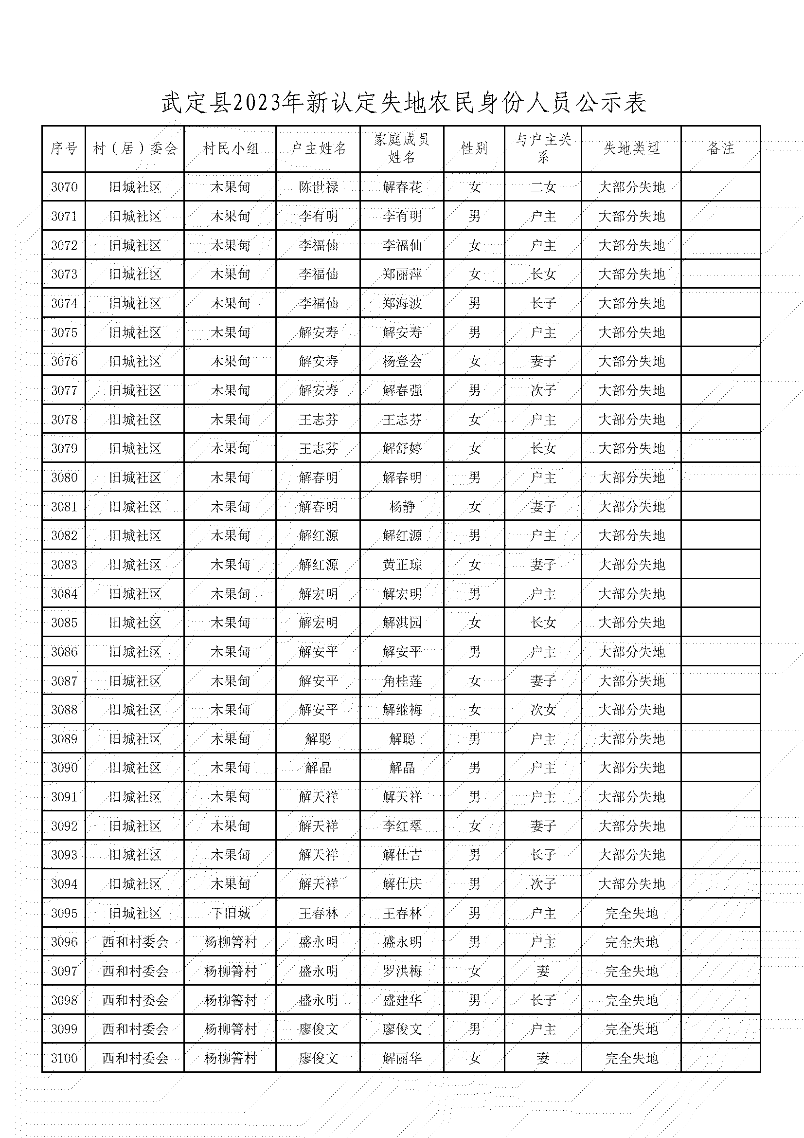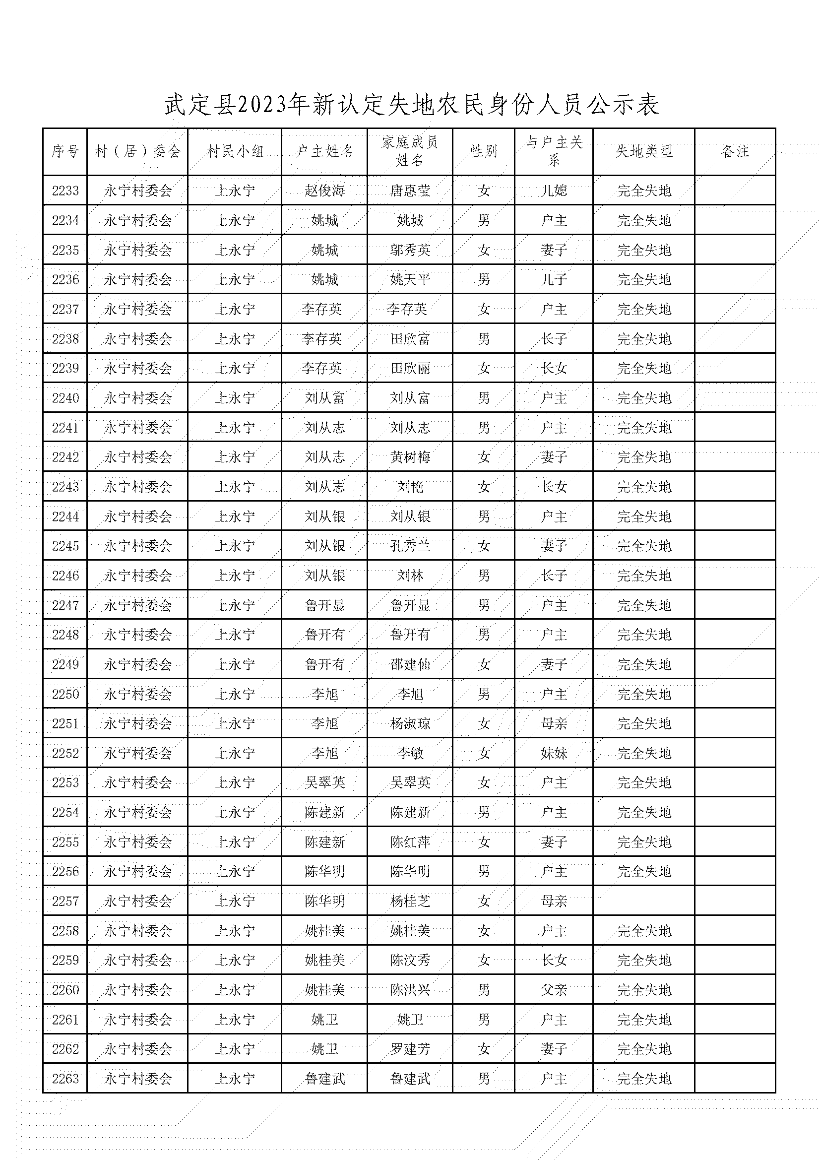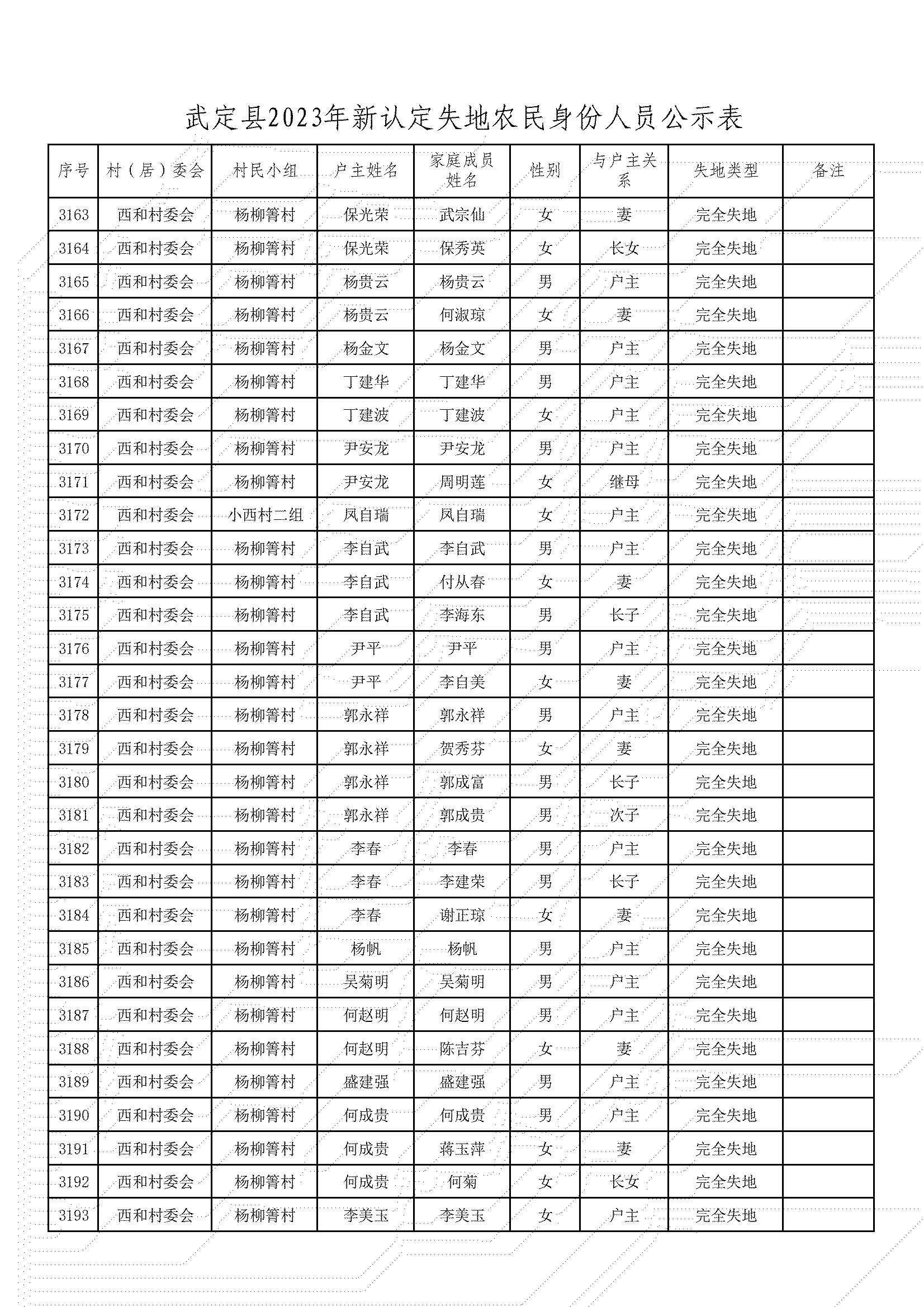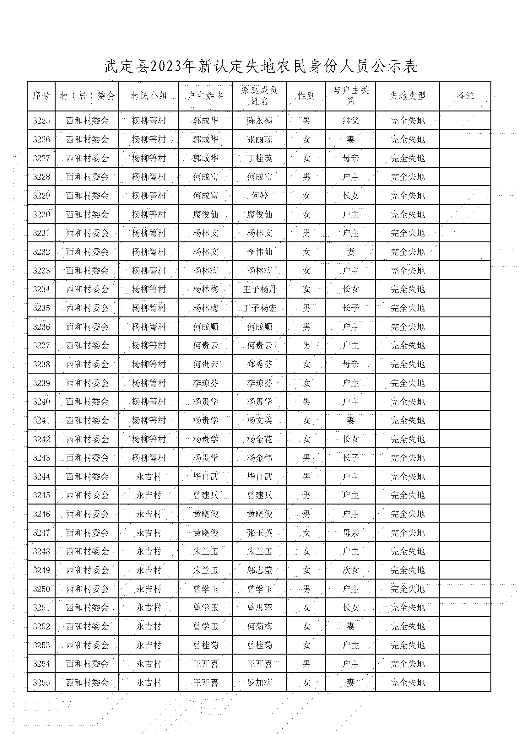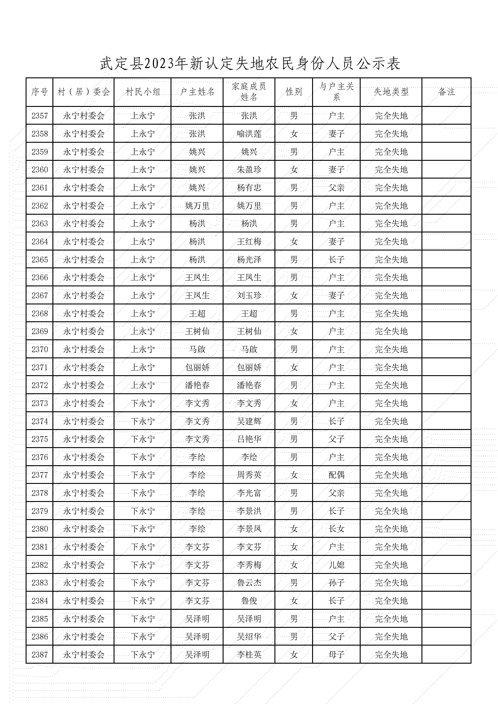 根据《武定县人民政府办公室印发武定县改革完善被征地农民基本养老保障工作实施办法的通知》(武政办发〔2020〕6号)文件精神,经村(居)委会、狮山镇、县公安局、县自然资源局、县农业农村局、县人社局对被征地农民土地征收、户籍人口、参加基本养老保险等情况进行审核,现将2023年符合认定为被征地农民身份的人员予以公示,接受社会监督。公示期从2023年12月18日至2023年12月22日,共5天。公示期间,如对公示对象有异议,请向武定县人力资源和社会保障局社会保险中心反映。
