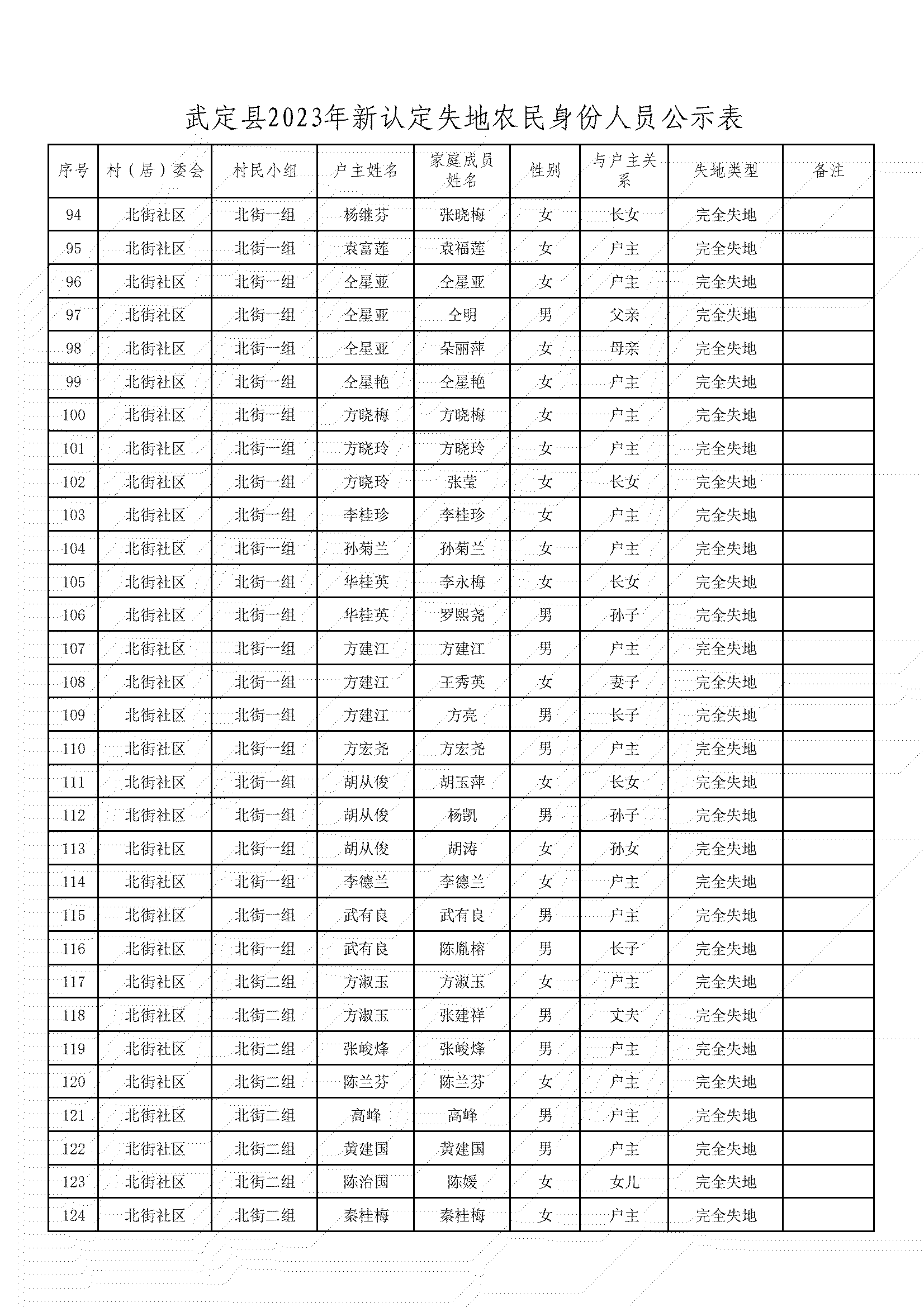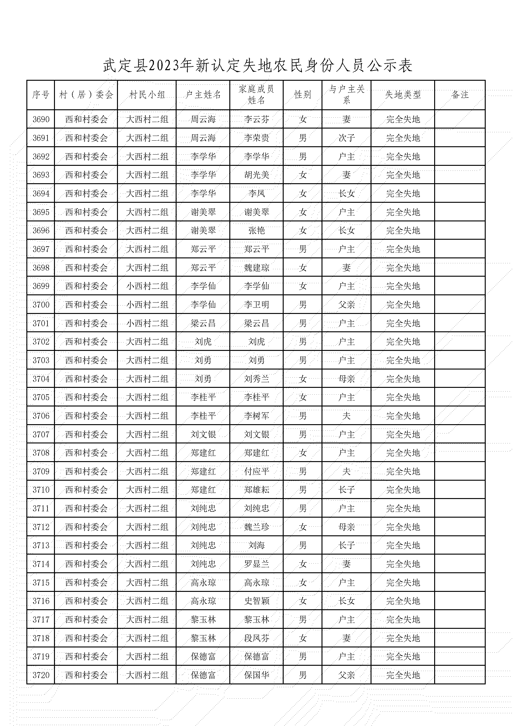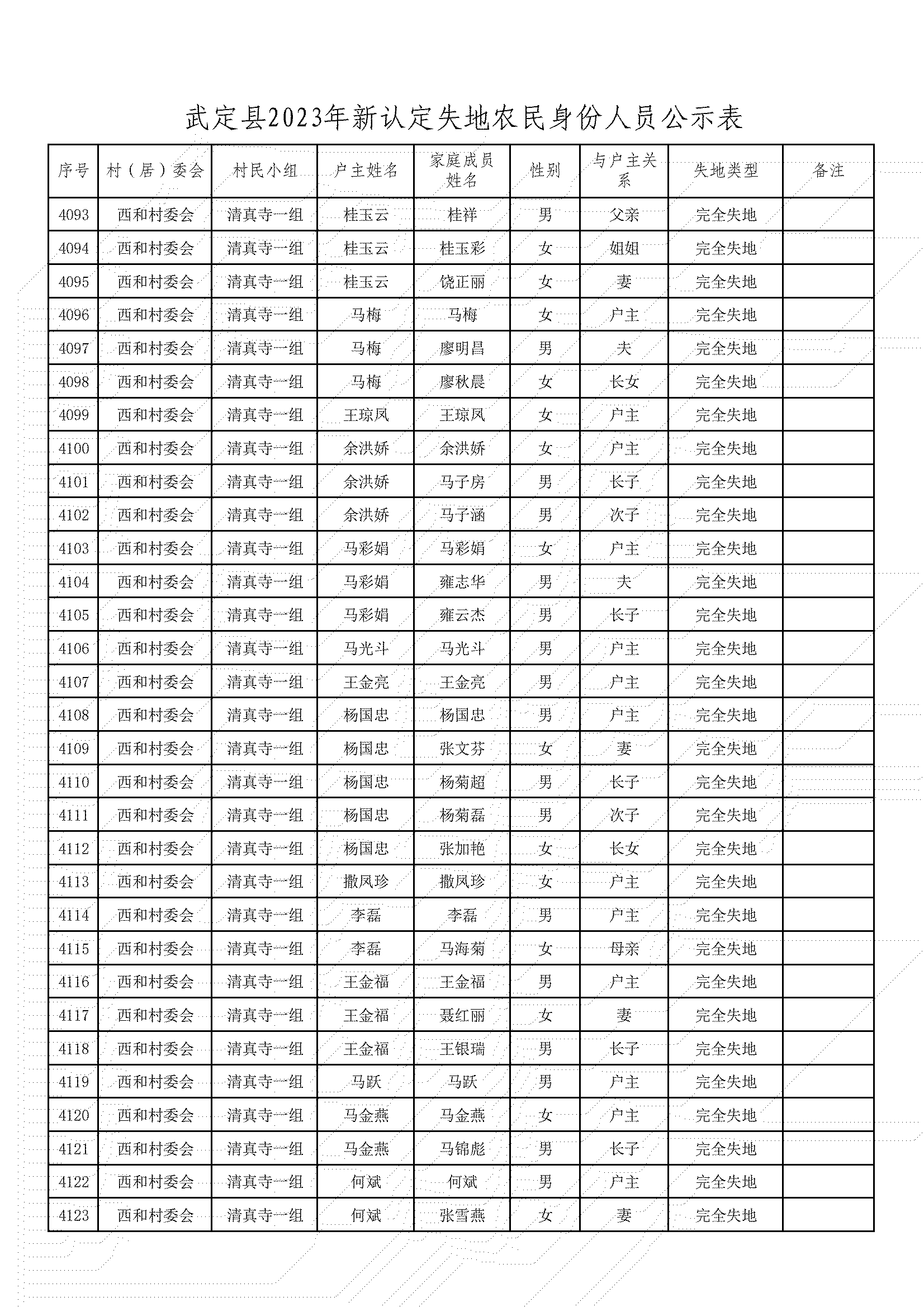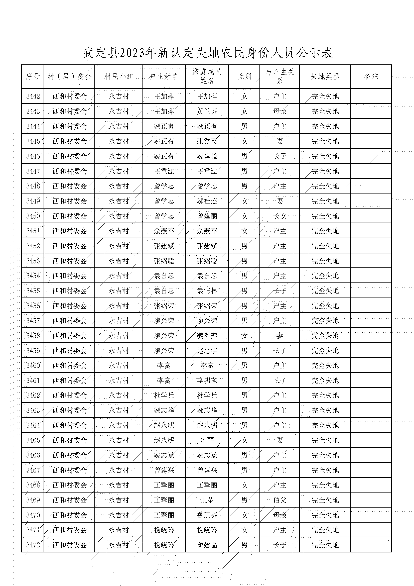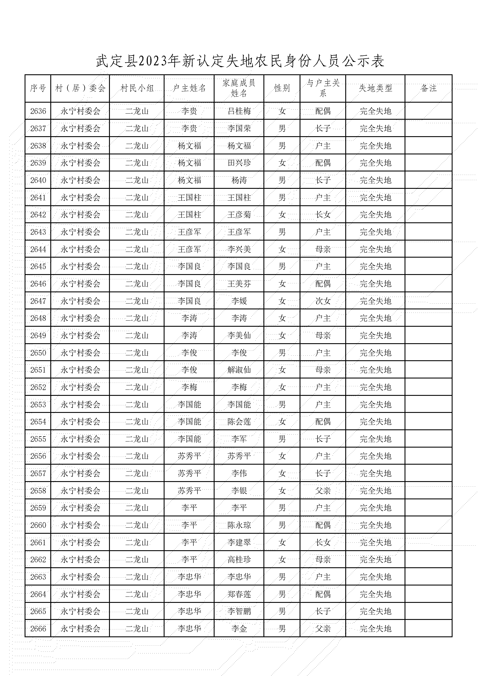 根据《武定县人民政府办公室印发武定县改革完善被征地农民基本养老保障工作实施办法的通知》(武政办发〔2020〕6号)文件精神,经村(居)委会、狮山镇、县公安局、县自然资源局、县农业农村局、县人社局对被征地农民土地征收、户籍人口、参加基本养老保险等情况进行审核,现将2023年符合认定为被征地农民身份的人员予以公示,接受社会监督。公示期从2023年12月18日至2023年12月22日,共5天。公示期间,如对公示对象有异议,请向武定县人力资源和社会保障局社会保险中心反映。