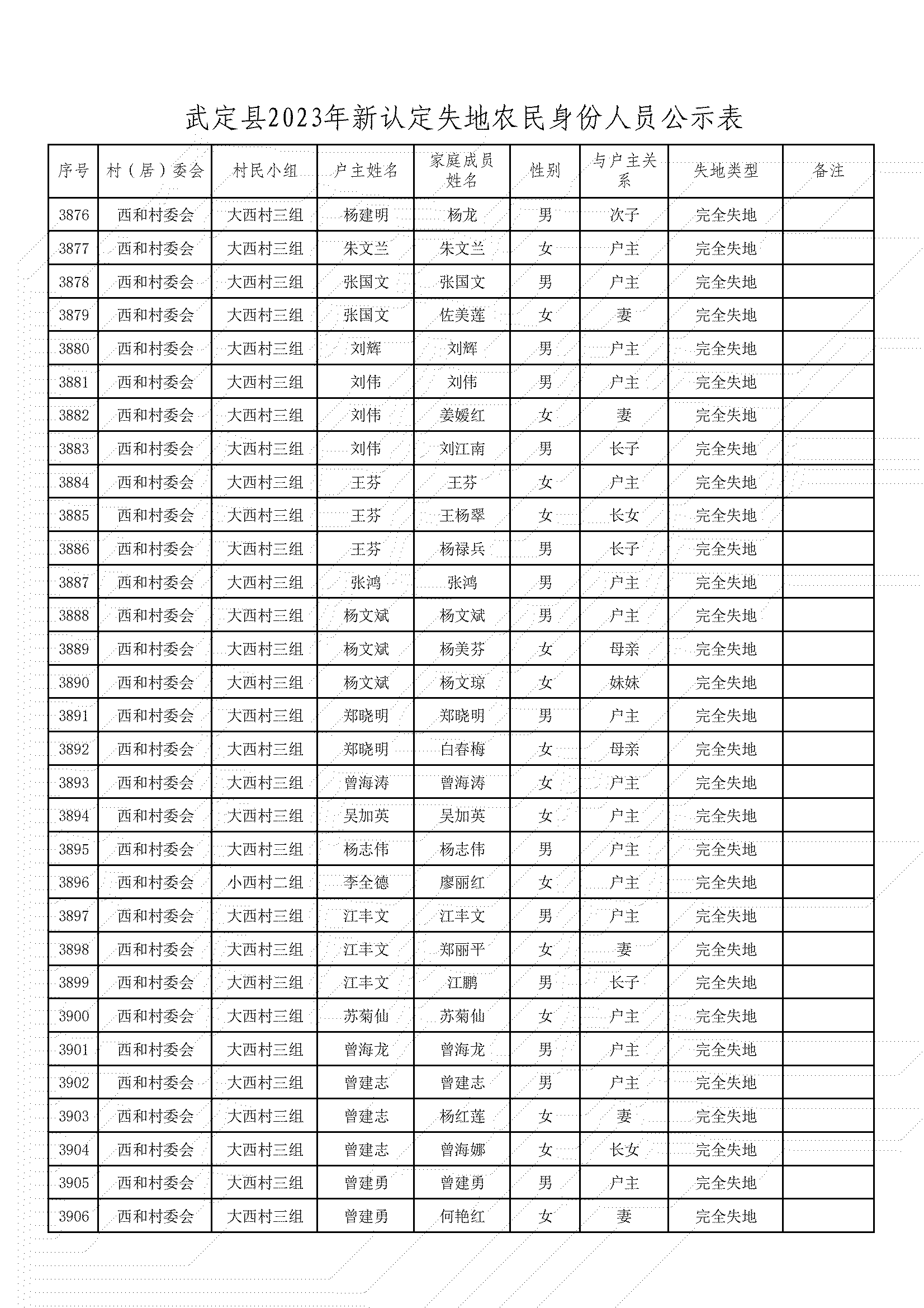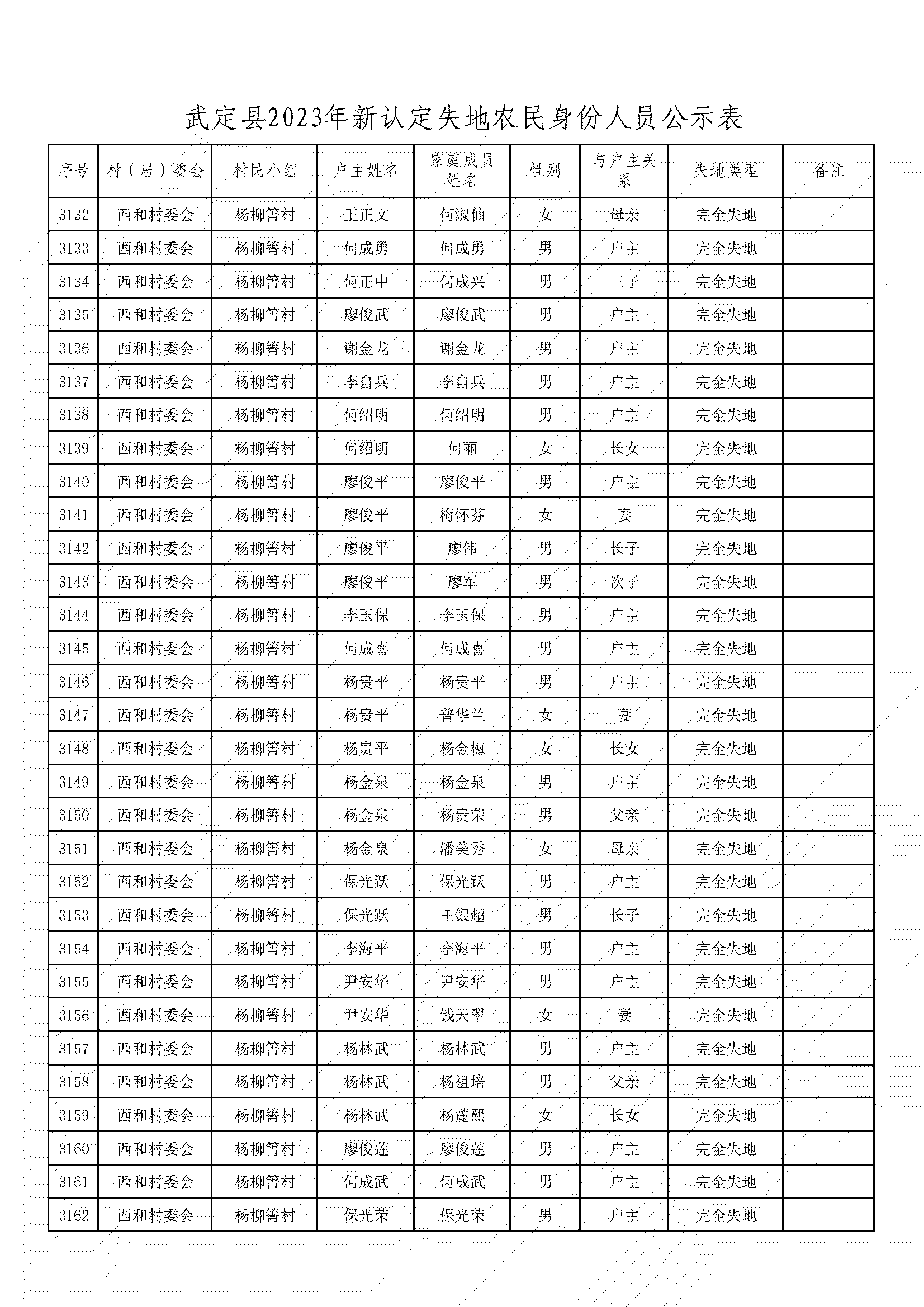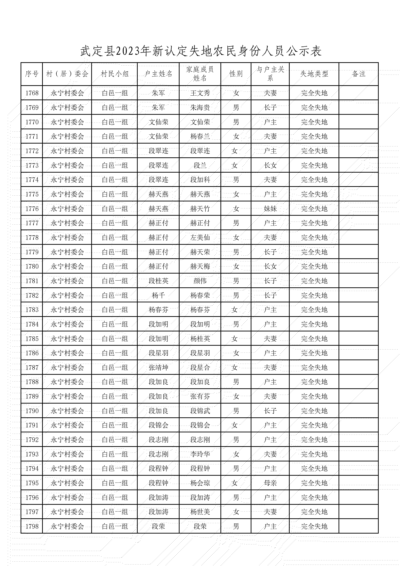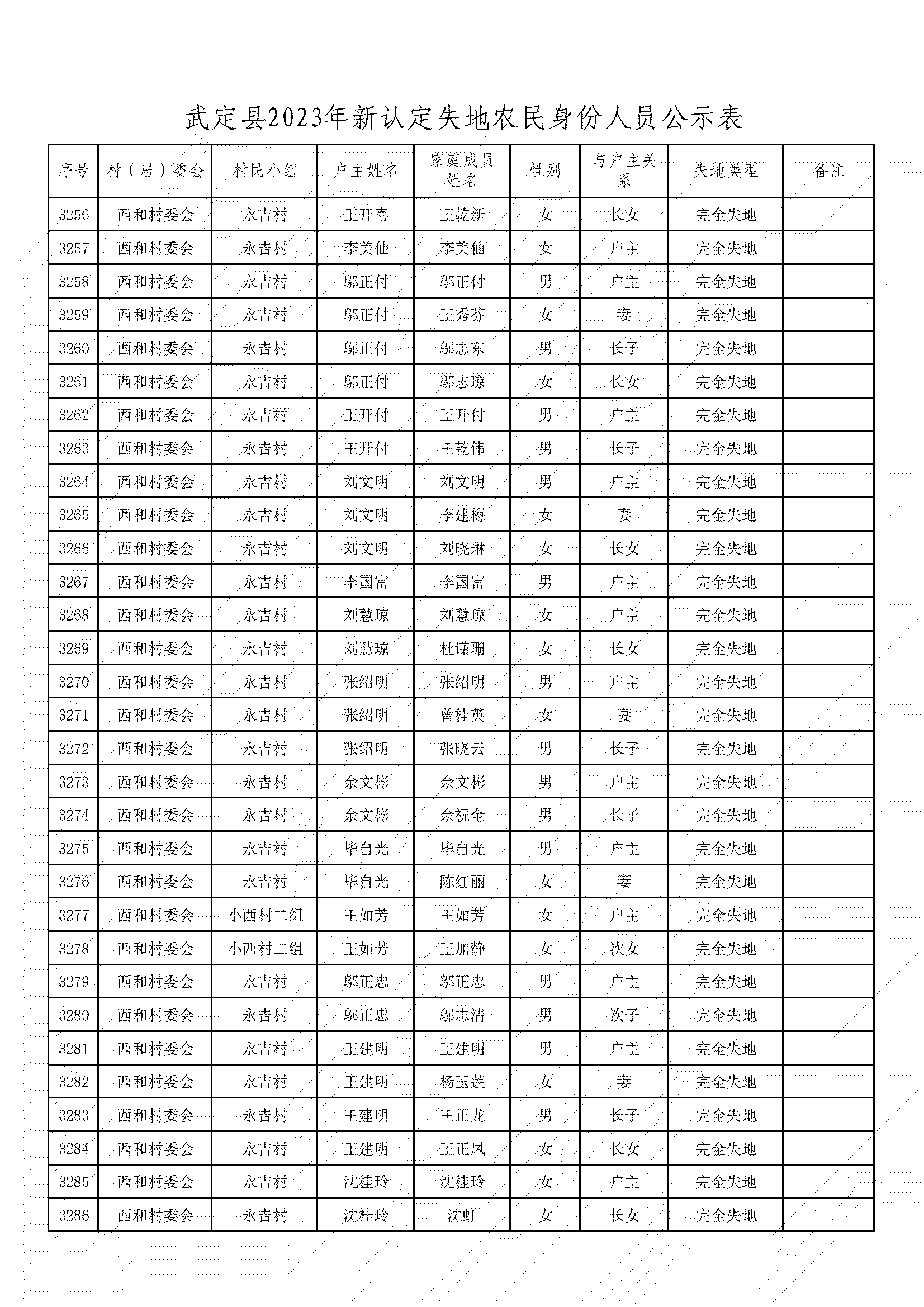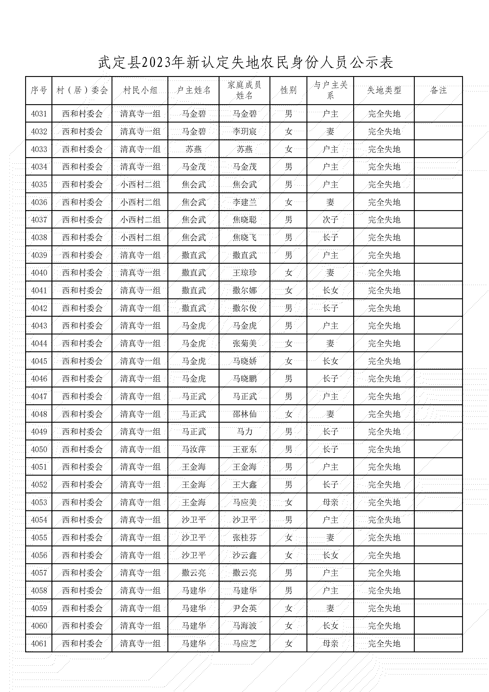 根据《武定县人民政府办公室印发武定县改革完善被征地农民基本养老保障工作实施办法的通知》(武政办发〔2020〕6号)文件精神,经村(居)委会、狮山镇、县公安局、县自然资源局、县农业农村局、县人社局对被征地农民土地征收、户籍人口、参加基本养老保险等情况进行审核,现将2023年符合认定为被征地农民身份的人员予以公示,接受社会监督。公示期从2023年12月18日至2023年12月22日,共5天。公示期间,如对公示对象有异议,请向武定县人力资源和社会保障局社会保险中心反映。