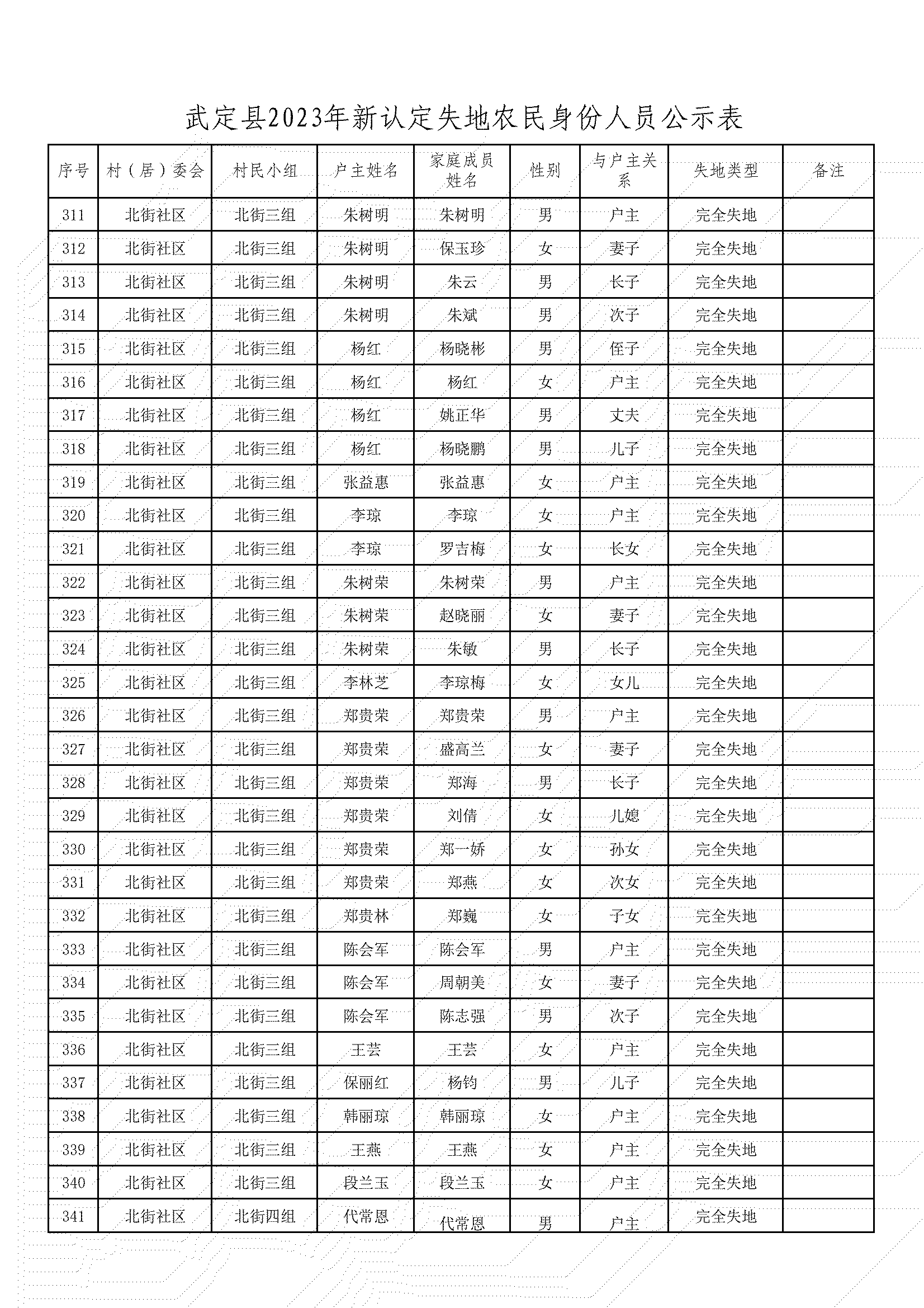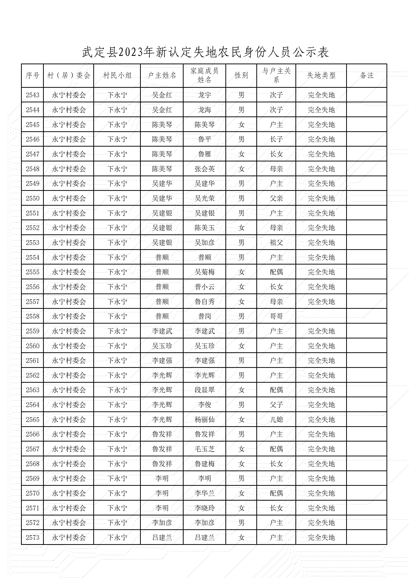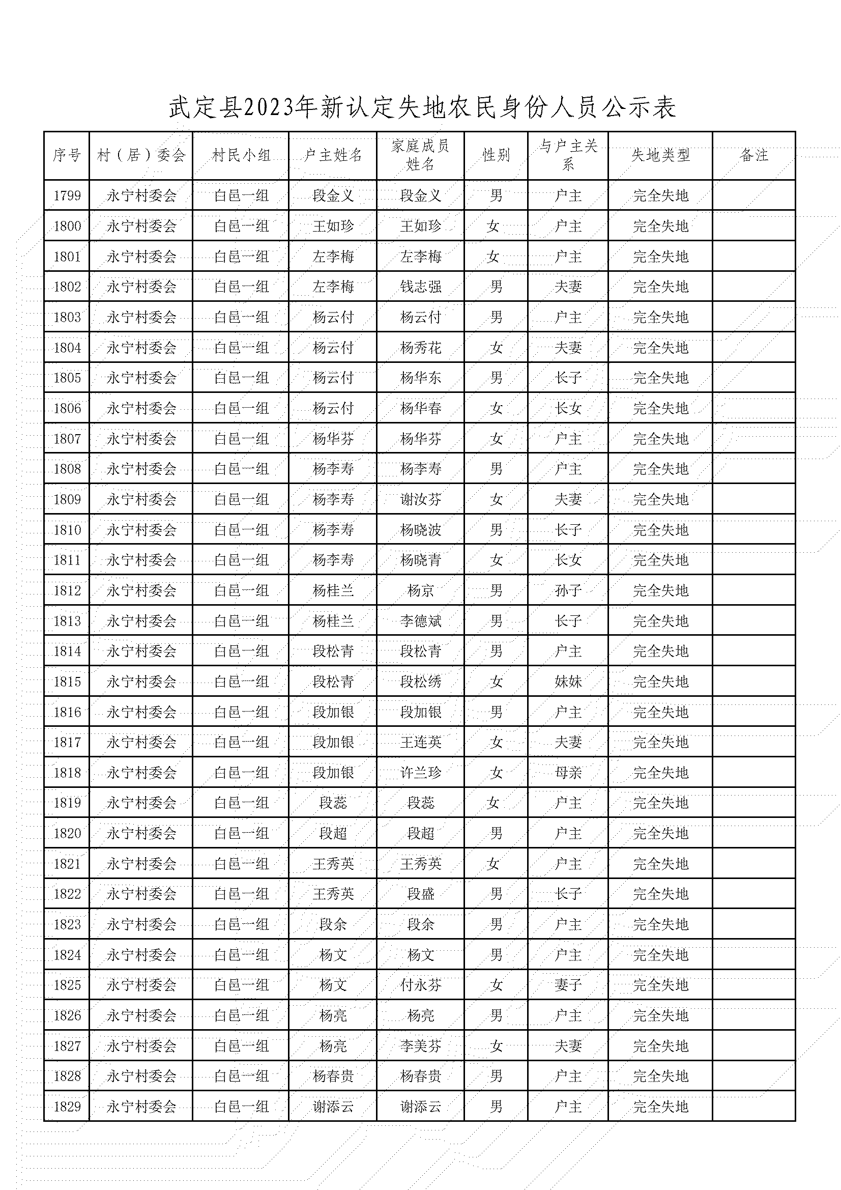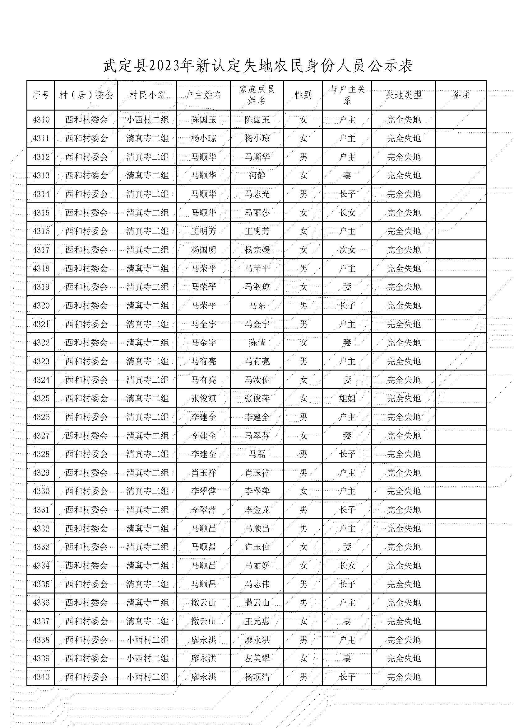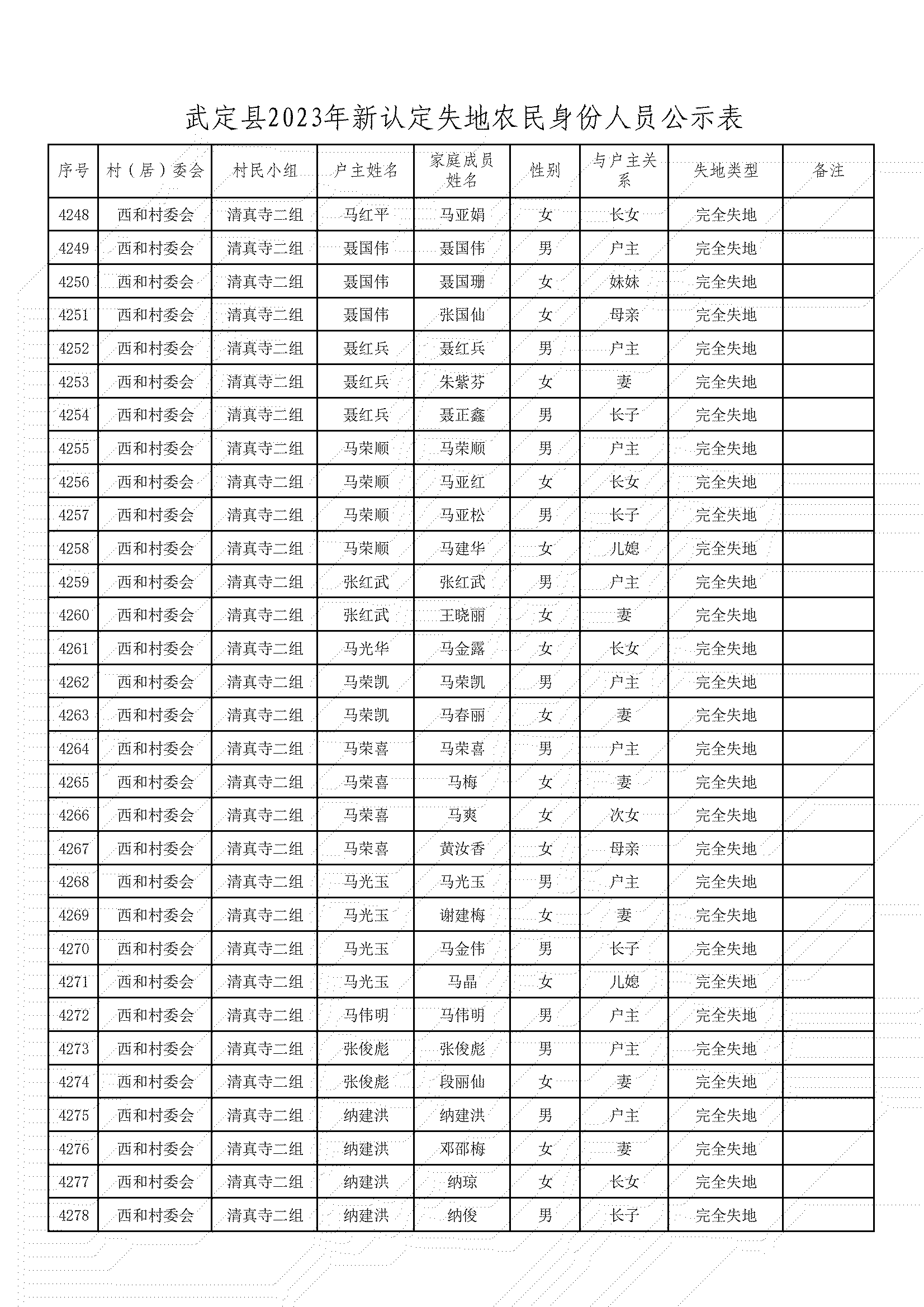 根据《武定县人民政府办公室印发武定县改革完善被征地农民基本养老保障工作实施办法的通知》(武政办发〔2020〕6号)文件精神,经村(居)委会、狮山镇、县公安局、县自然资源局、县农业农村局、县人社局对被征地农民土地征收、户籍人口、参加基本养老保险等情况进行审核,现将2023年符合认定为被征地农民身份的人员予以公示,接受社会监督。公示期从2023年12月18日至2023年12月22日,共5天。公示期间,如对公示对象有异议,请向武定县人力资源和社会保障局社会保险中心反映。