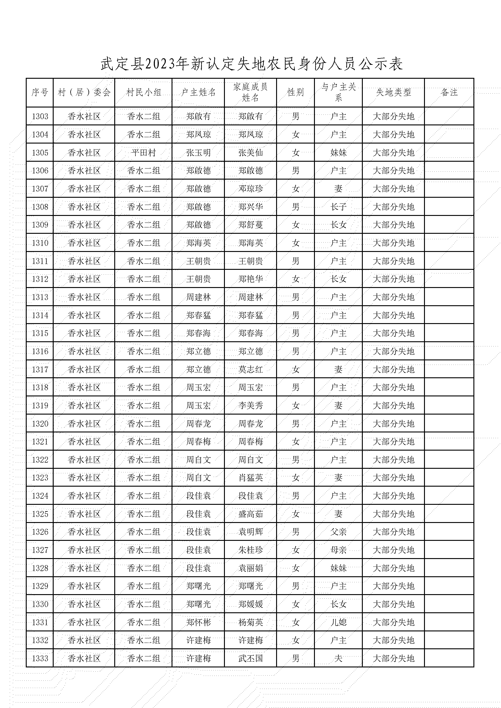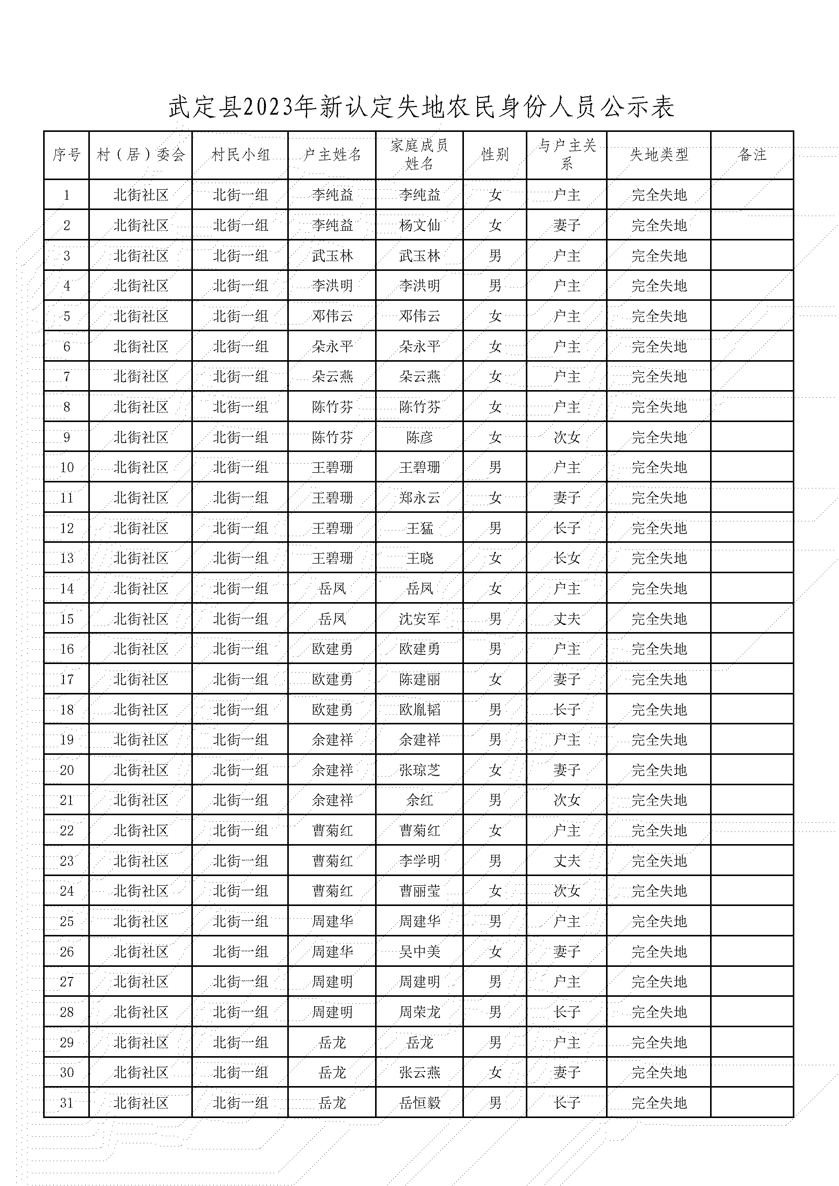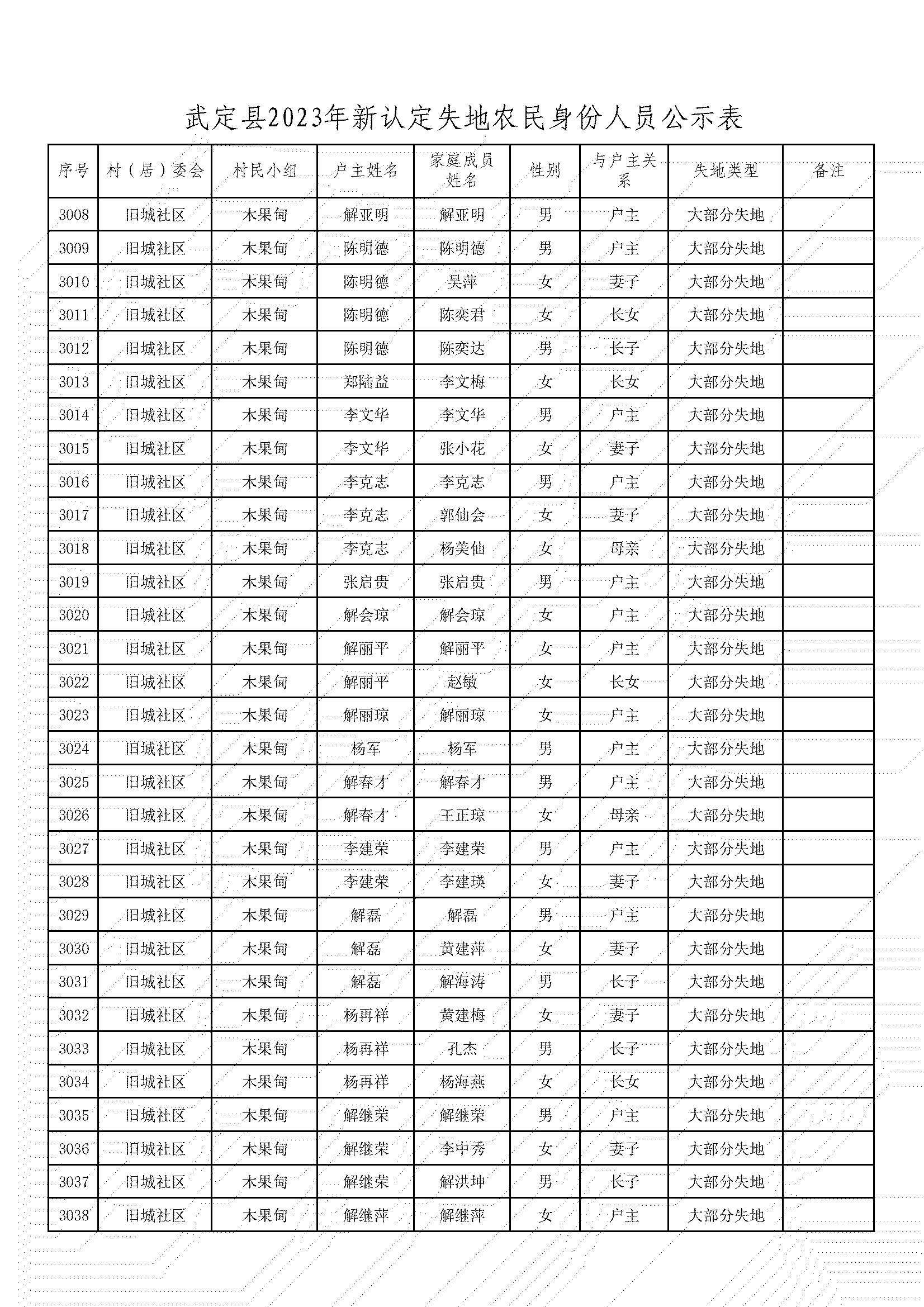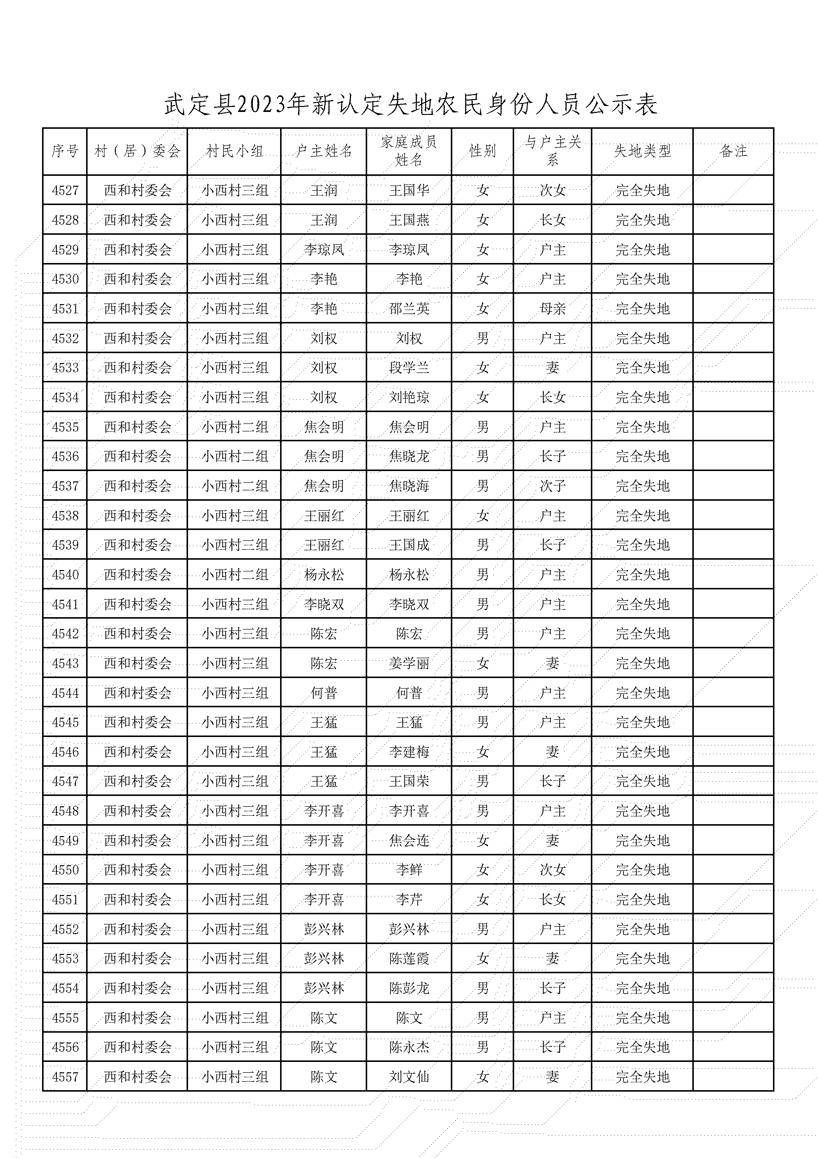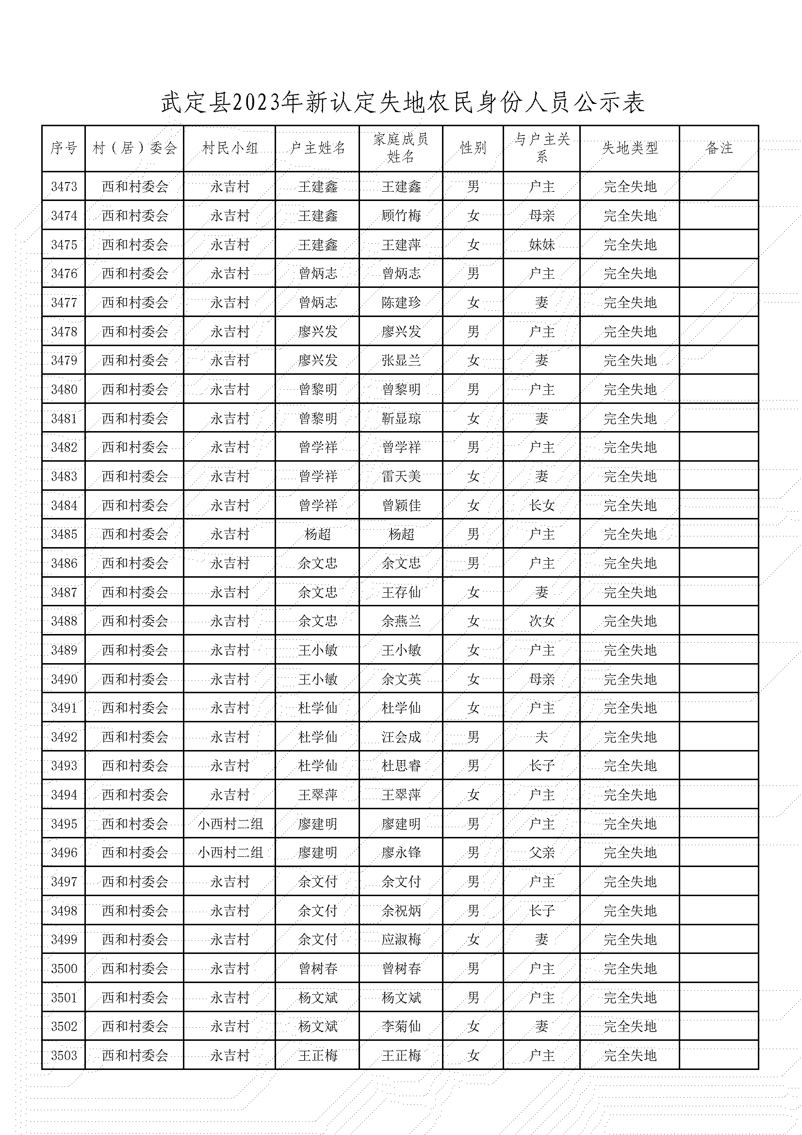 根据《武定县人民政府办公室印发武定县改革完善被征地农民基本养老保障工作实施办法的通知》(武政办发〔2020〕6号)文件精神,经村(居)委会、狮山镇、县公安局、县自然资源局、县农业农村局、县人社局对被征地农民土地征收、户籍人口、参加基本养老保险等情况进行审核,现将2023年符合认定为被征地农民身份的人员予以公示,接受社会监督。公示期从2023年12月18日至2023年12月22日,共5天。公示期间,如对公示对象有异议,请向武定县人力资源和社会保障局社会保险中心反映。