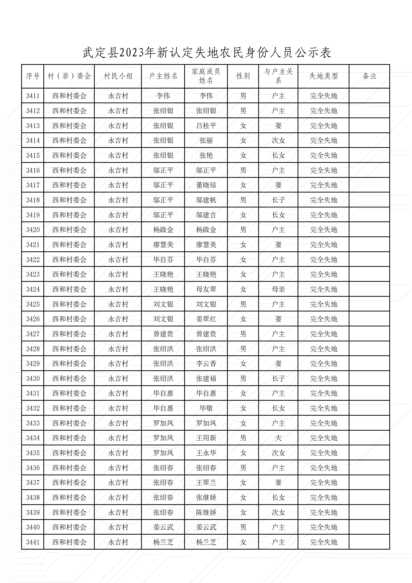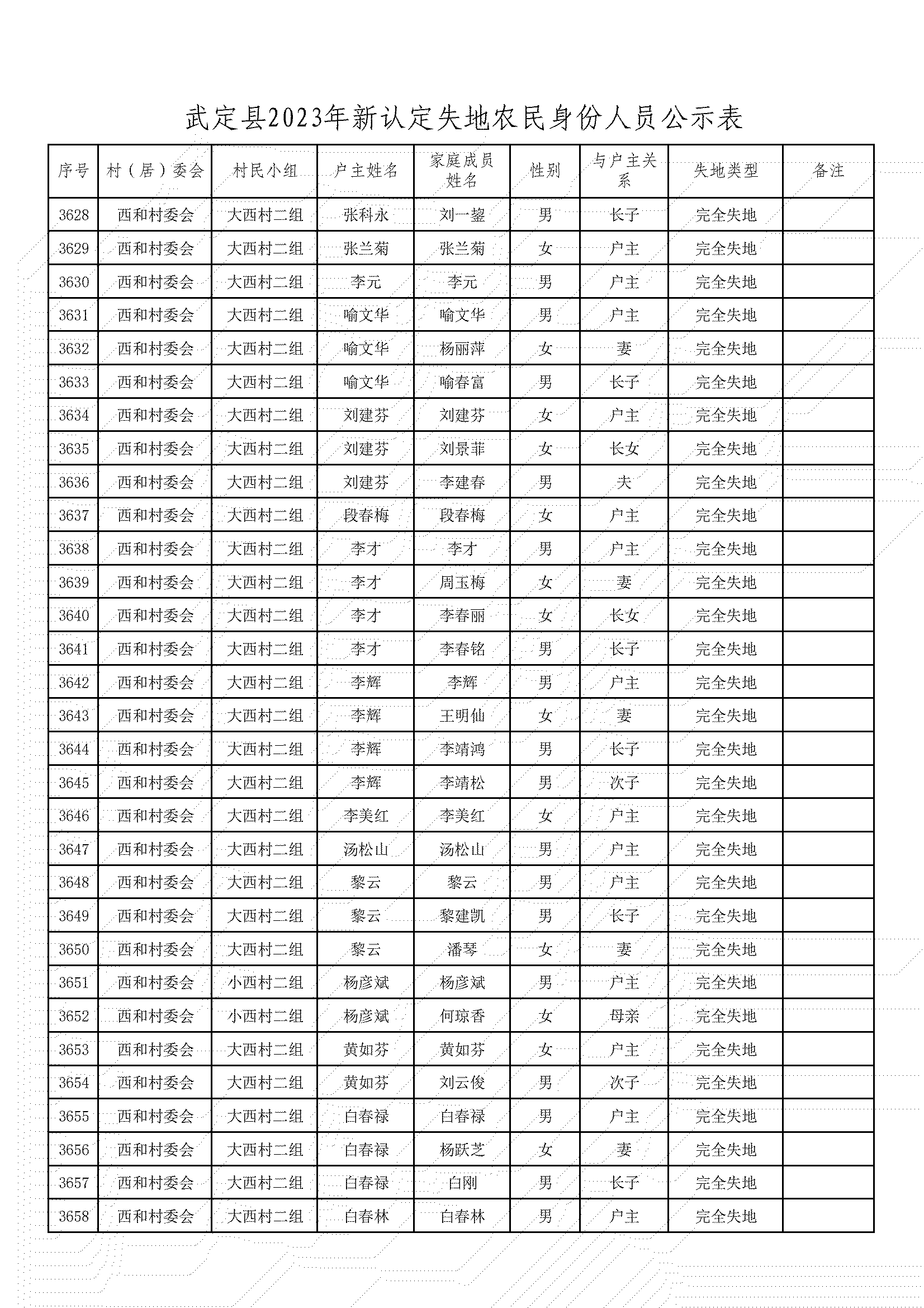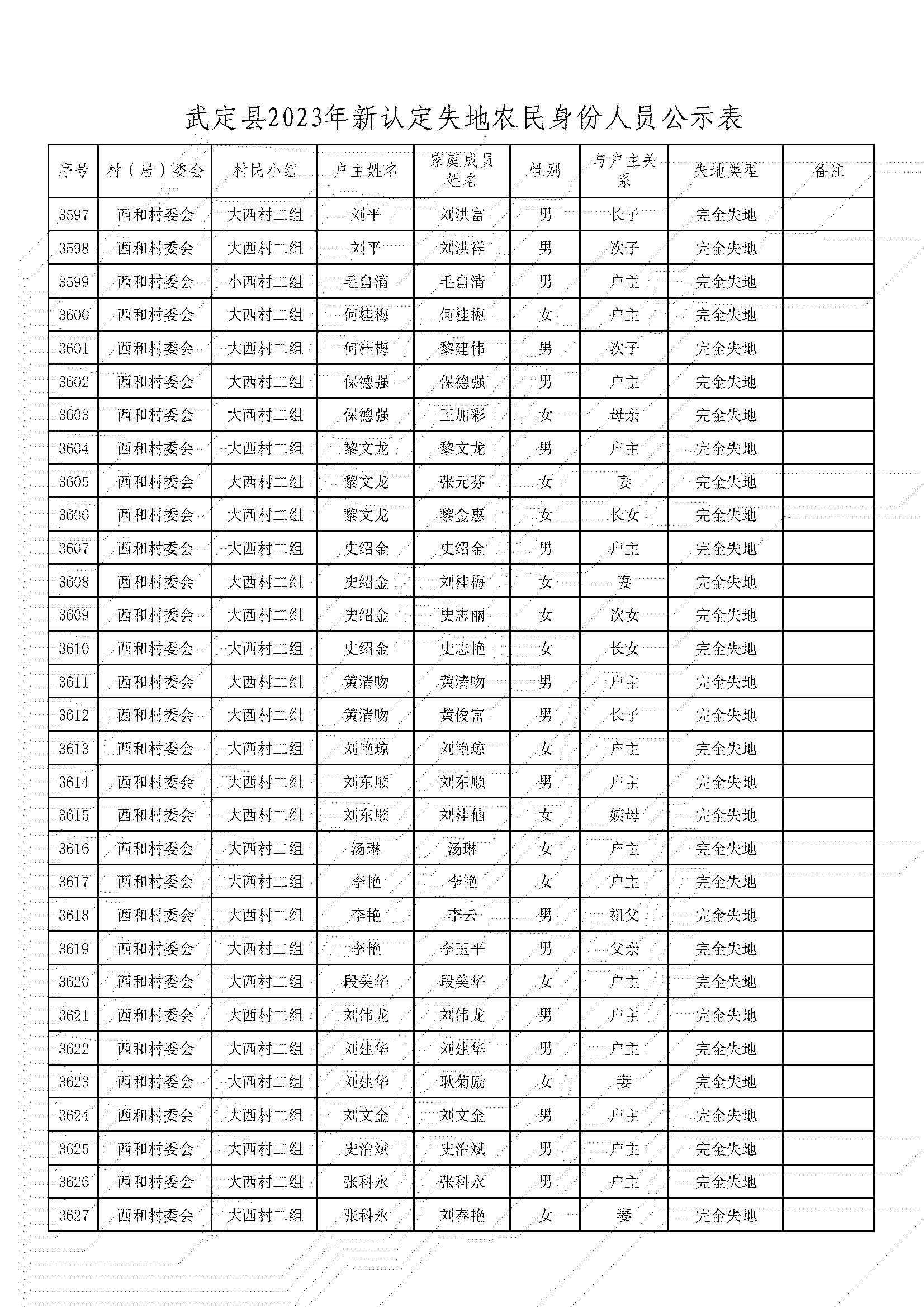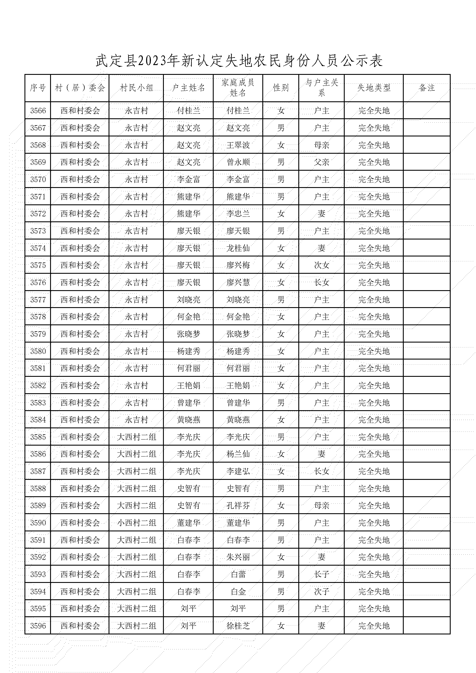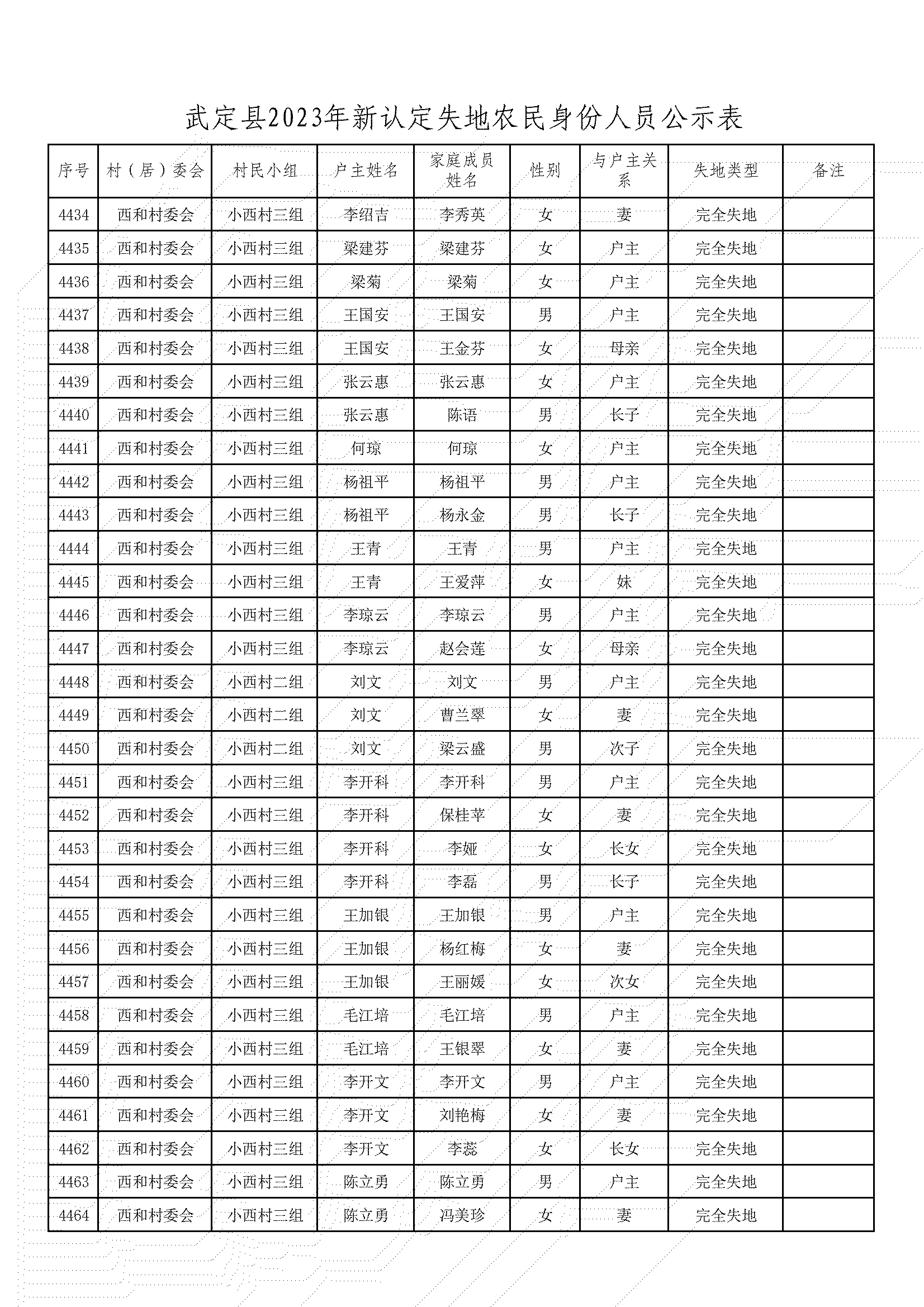 根据《武定县人民政府办公室印发武定县改革完善被征地农民基本养老保障工作实施办法的通知》(武政办发〔2020〕6号)文件精神,经村(居)委会、狮山镇、县公安局、县自然资源局、县农业农村局、县人社局对被征地农民土地征收、户籍人口、参加基本养老保险等情况进行审核,现将2023年符合认定为被征地农民身份的人员予以公示,接受社会监督。公示期从2023年12月18日至2023年12月22日,共5天。公示期间,如对公示对象有异议,请向武定县人力资源和社会保障局社会保险中心反映。