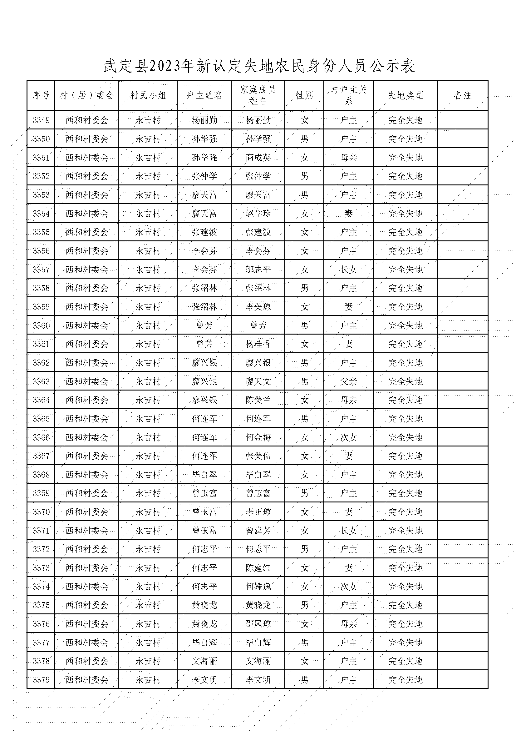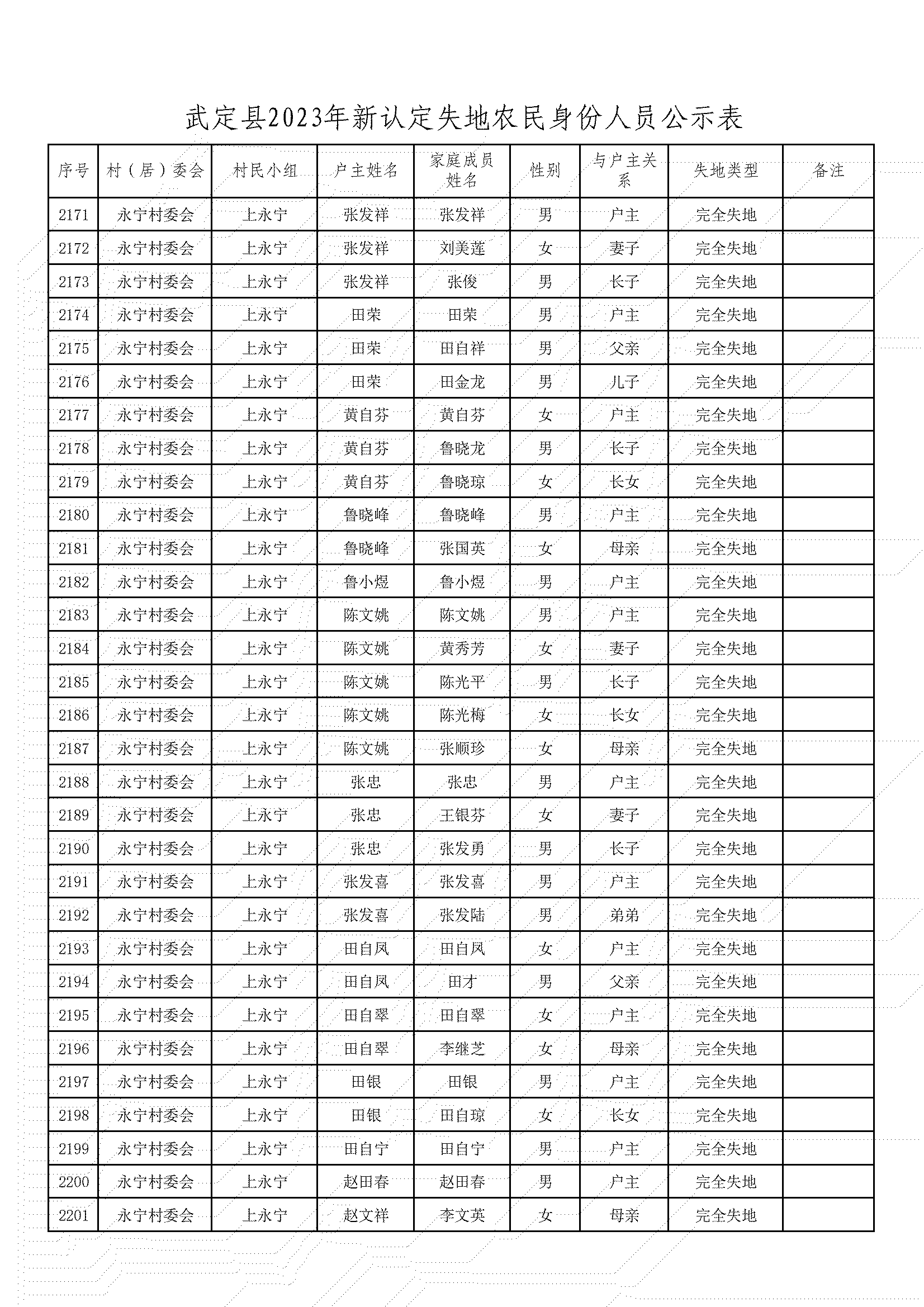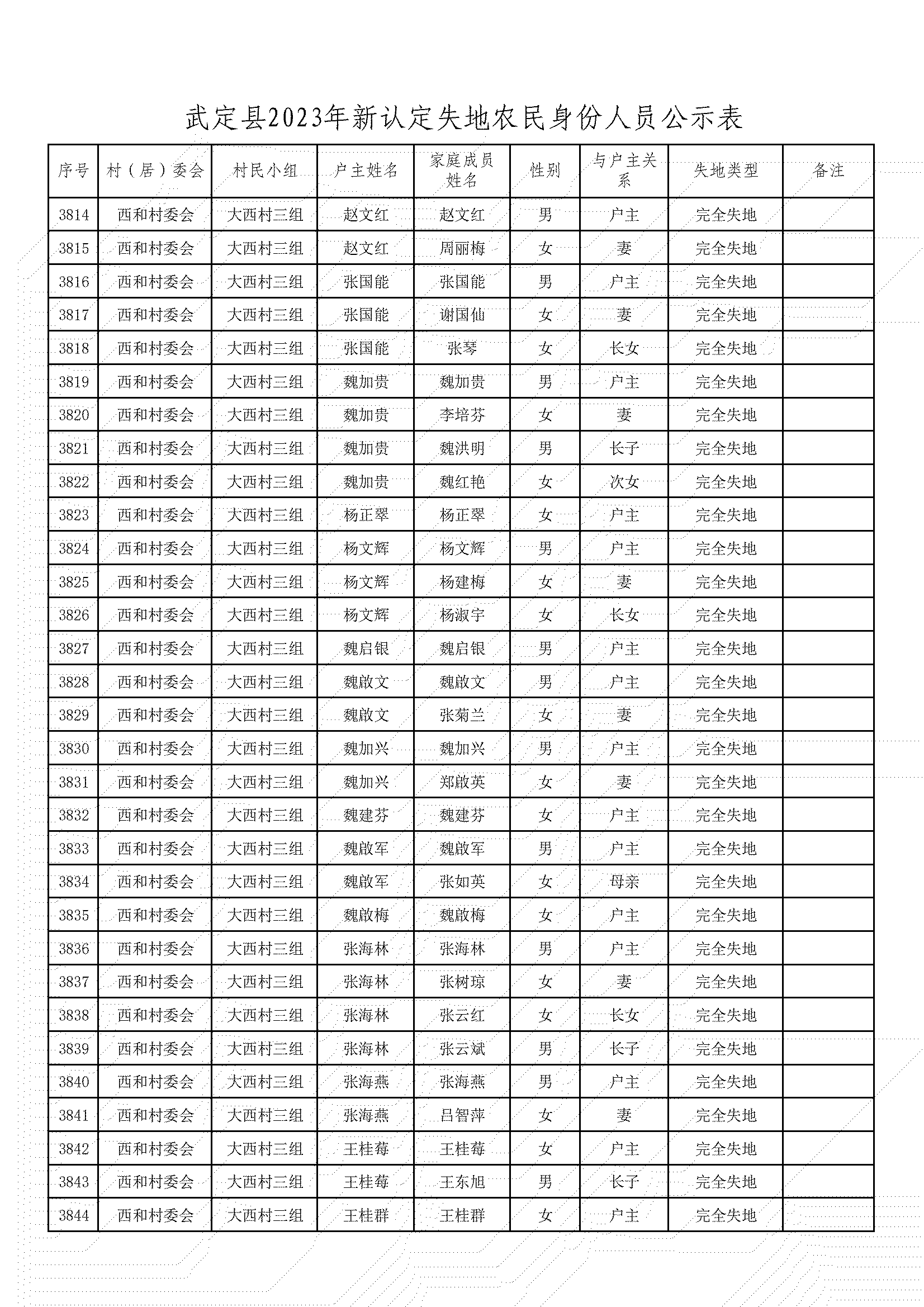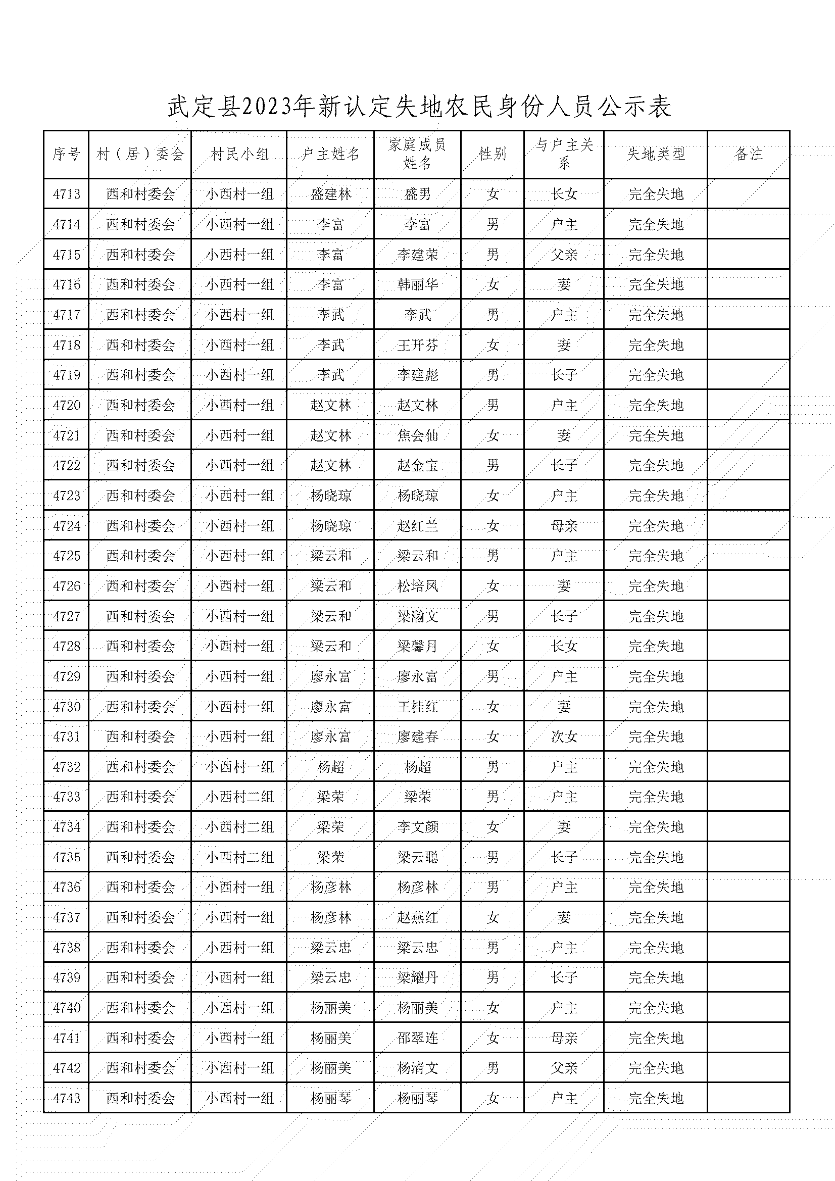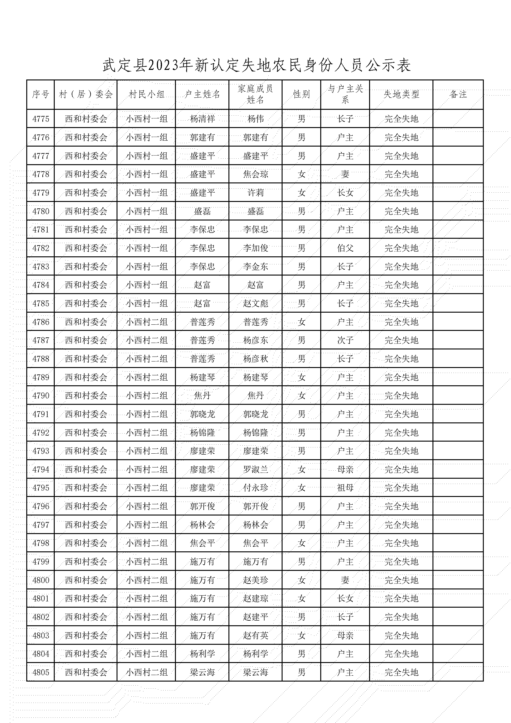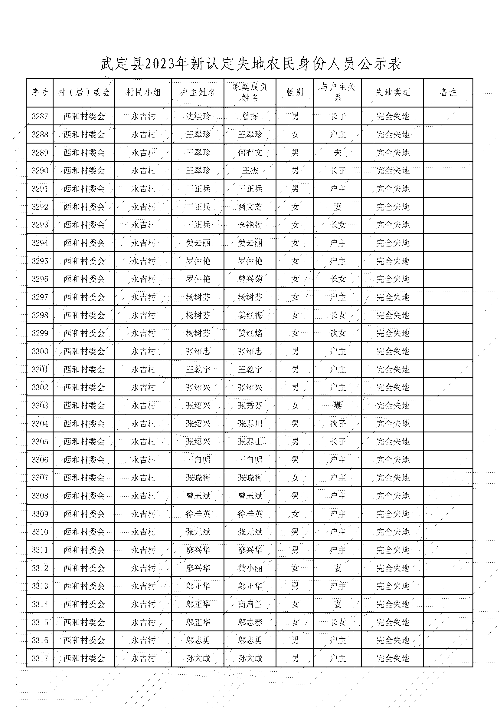 根据《武定县人民政府办公室印发武定县改革完善被征地农民基本养老保障工作实施办法的通知》(武政办发〔2020〕6号)文件精神,经村(居)委会、狮山镇、县公安局、县自然资源局、县农业农村局、县人社局对被征地农民土地征收、户籍人口、参加基本养老保险等情况进行审核,现将2023年符合认定为被征地农民身份的人员予以公示,接受社会监督。公示期从2023年12月18日至2023年12月22日,共5天。公示期间,如对公示对象有异议,请向武定县人力资源和社会保障局社会保险中心反映。