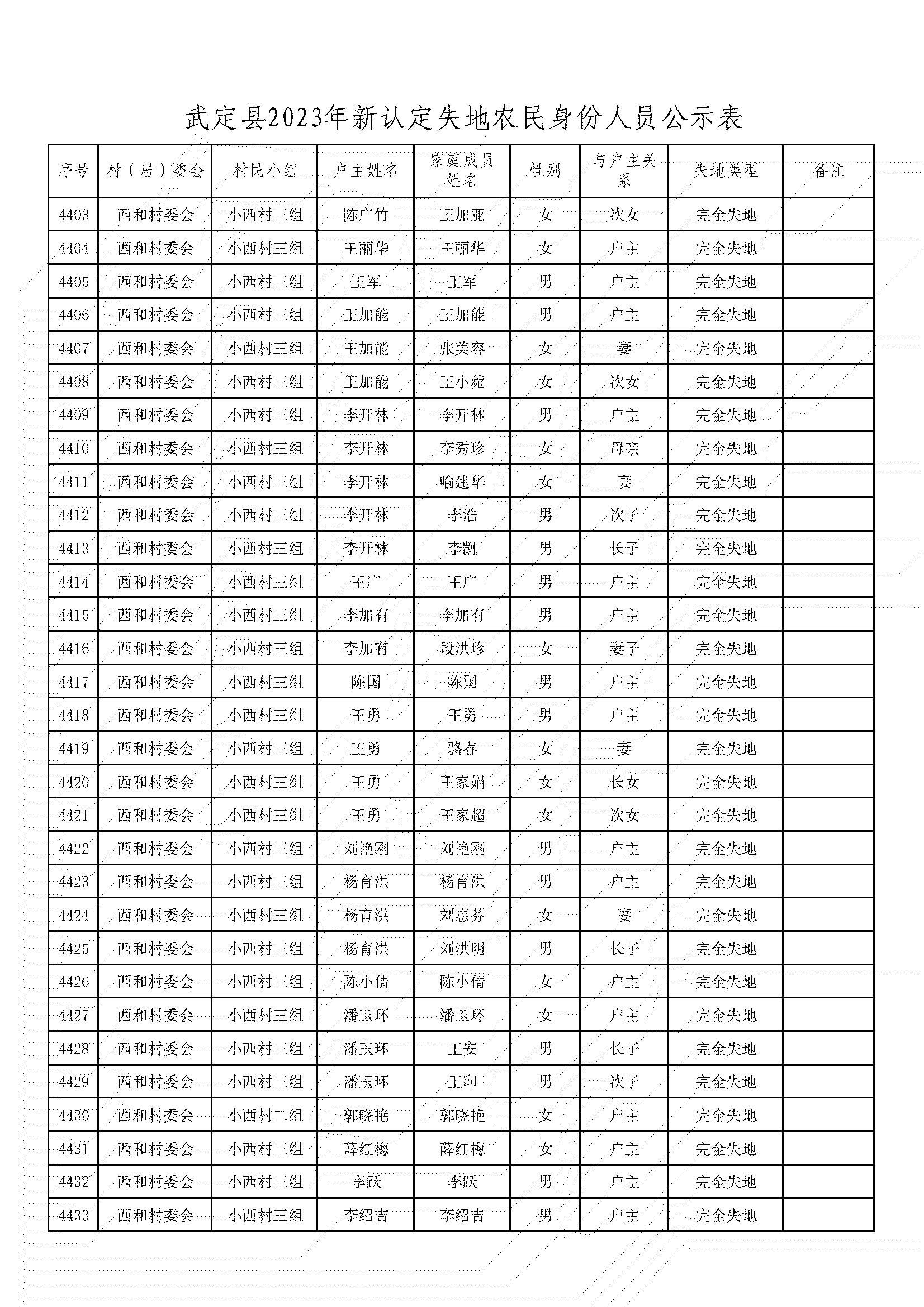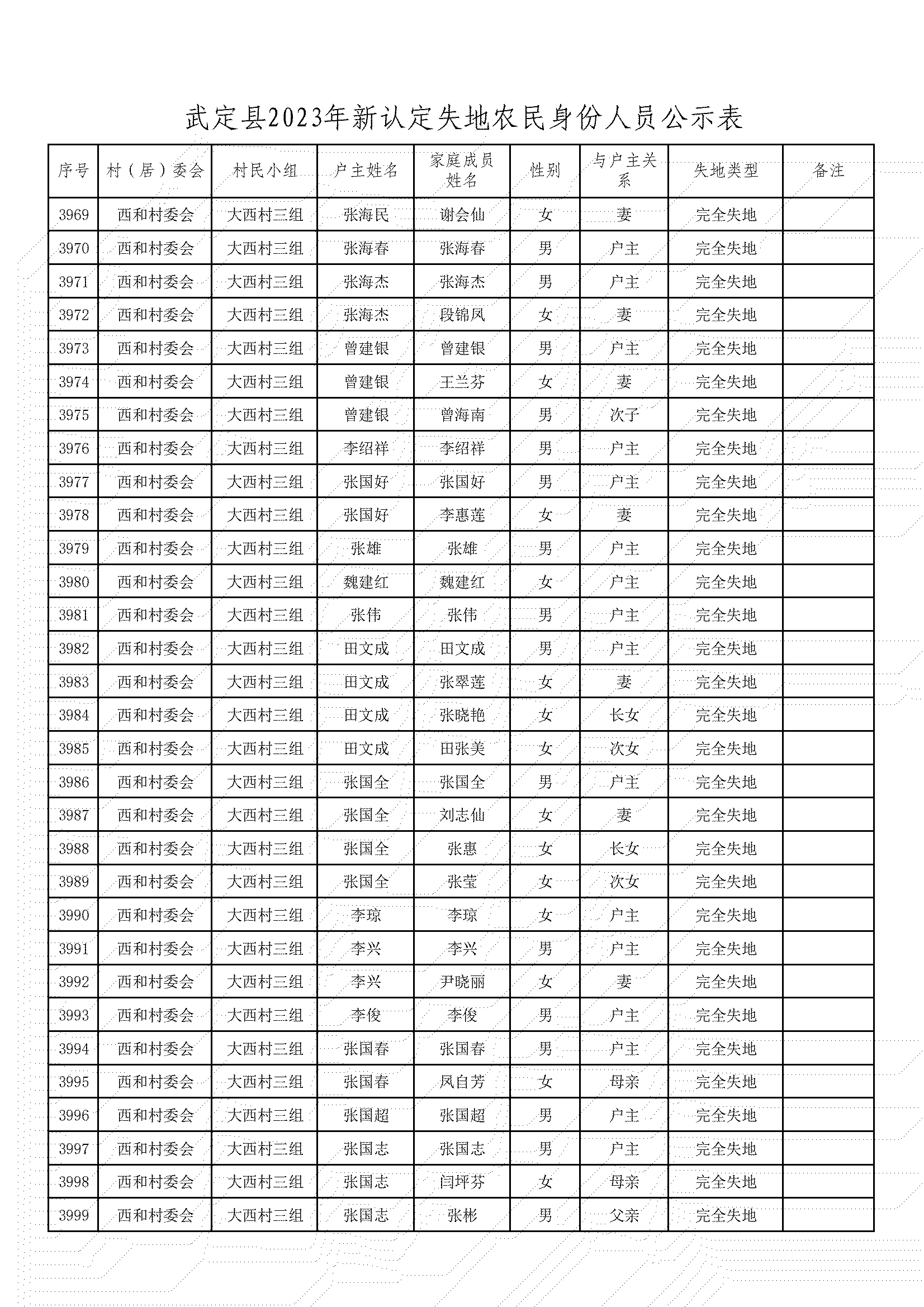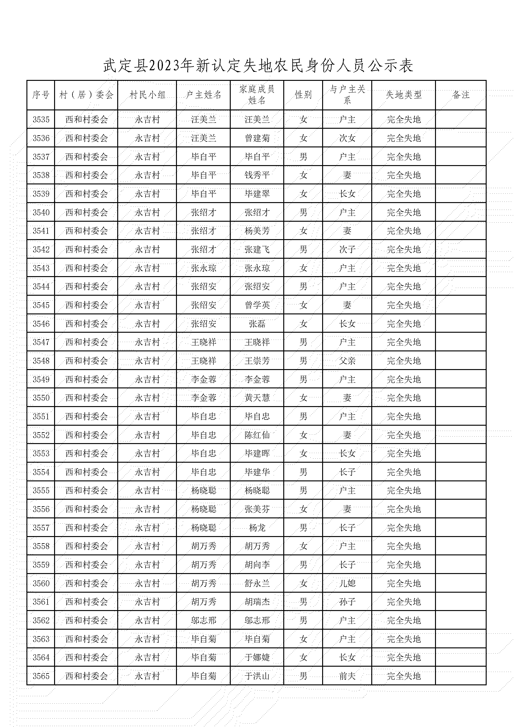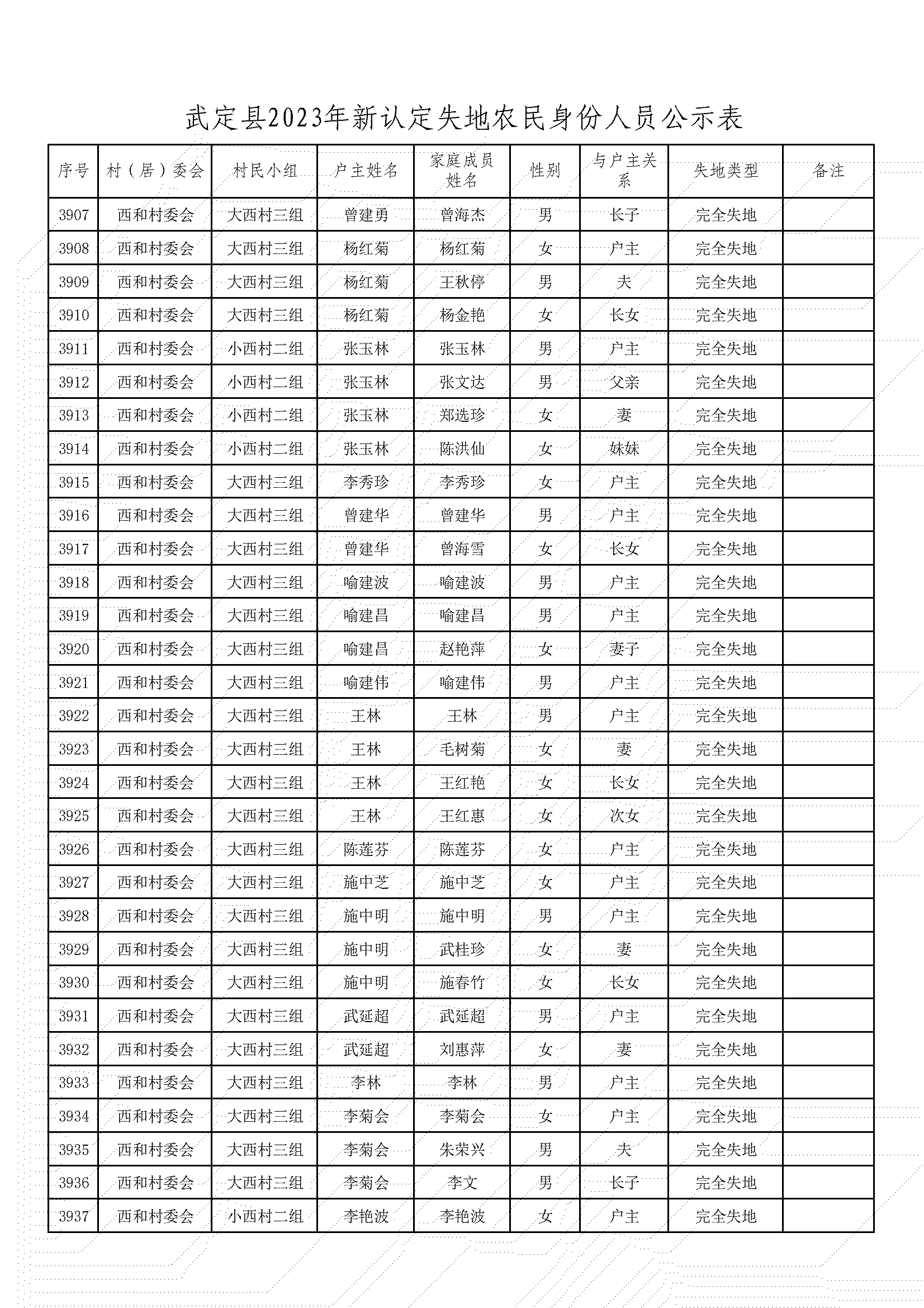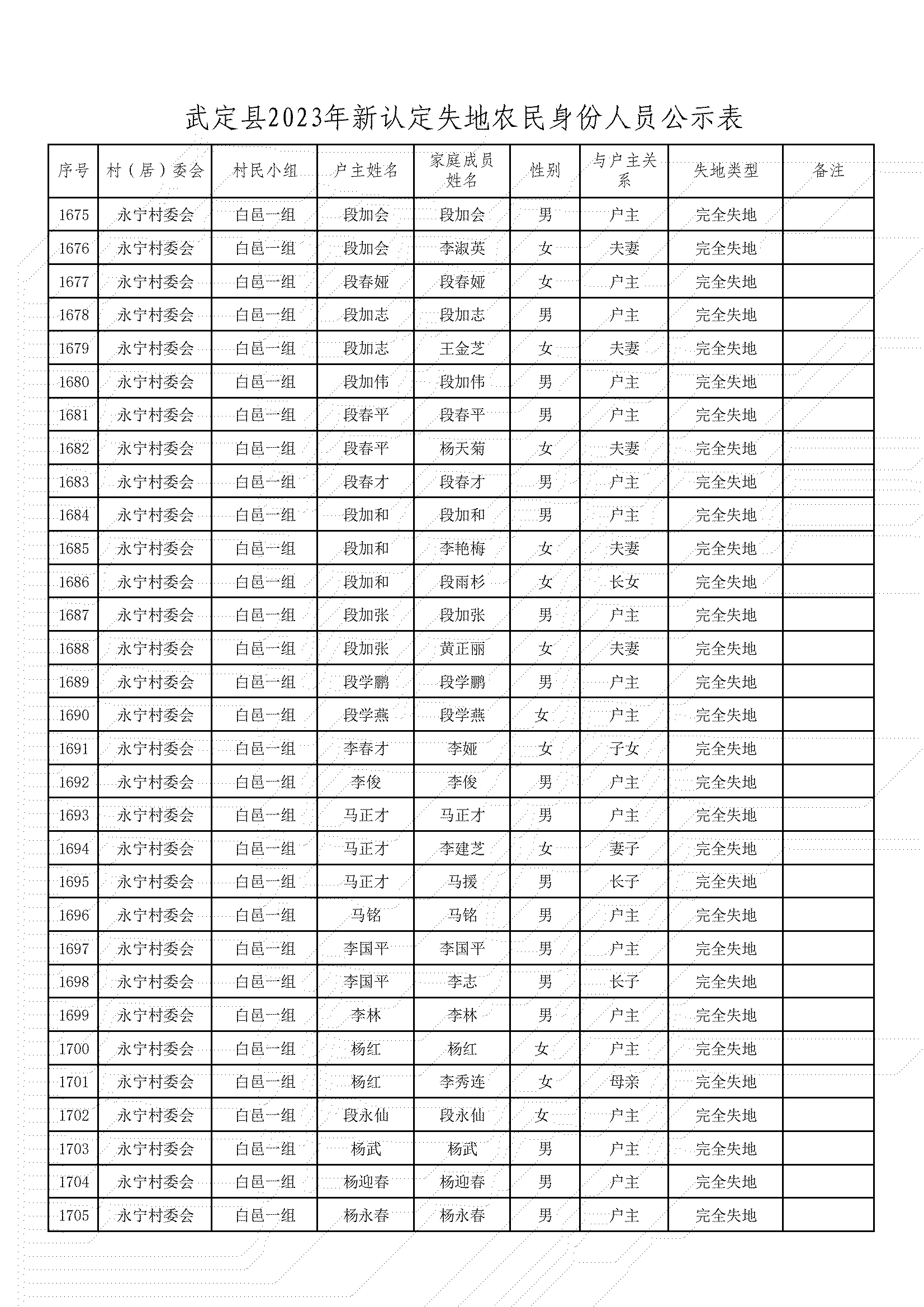 根据《武定县人民政府办公室印发武定县改革完善被征地农民基本养老保障工作实施办法的通知》(武政办发〔2020〕6号)文件精神,经村(居)委会、狮山镇、县公安局、县自然资源局、县农业农村局、县人社局对被征地农民土地征收、户籍人口、参加基本养老保险等情况进行审核,现将2023年符合认定为被征地农民身份的人员予以公示,接受社会监督。公示期从2023年12月18日至2023年12月22日,共5天。公示期间,如对公示对象有异议,请向武定县人力资源和社会保障局社会保险中心反映。