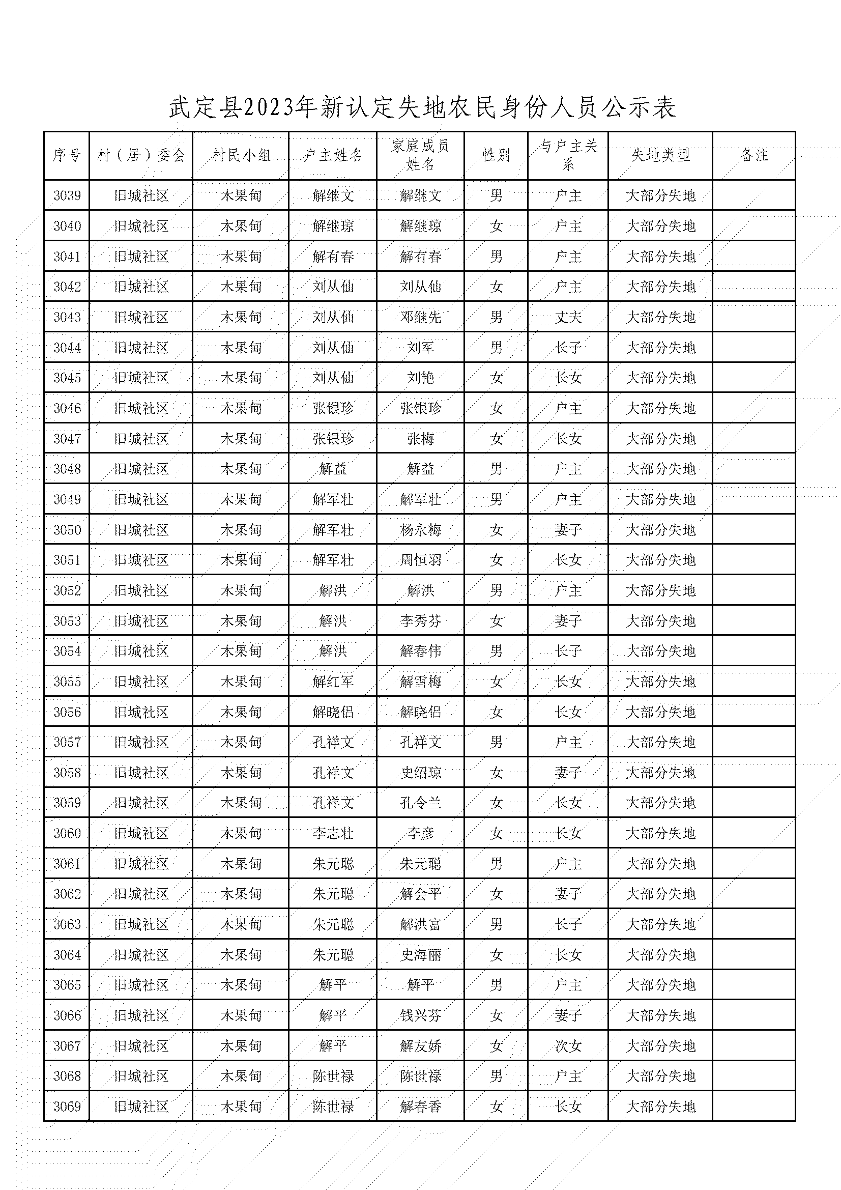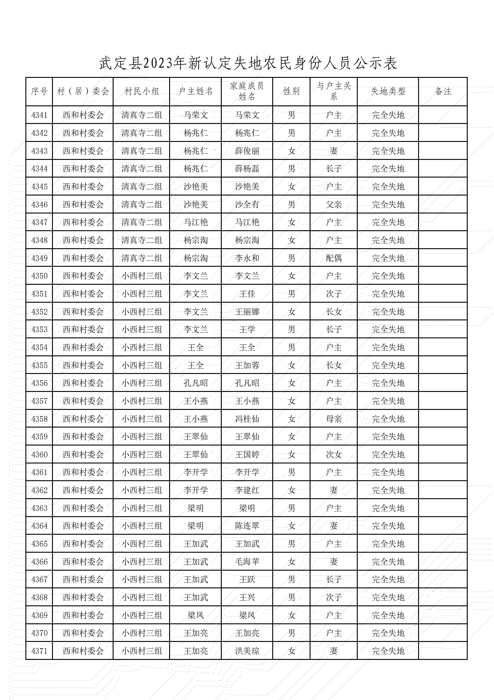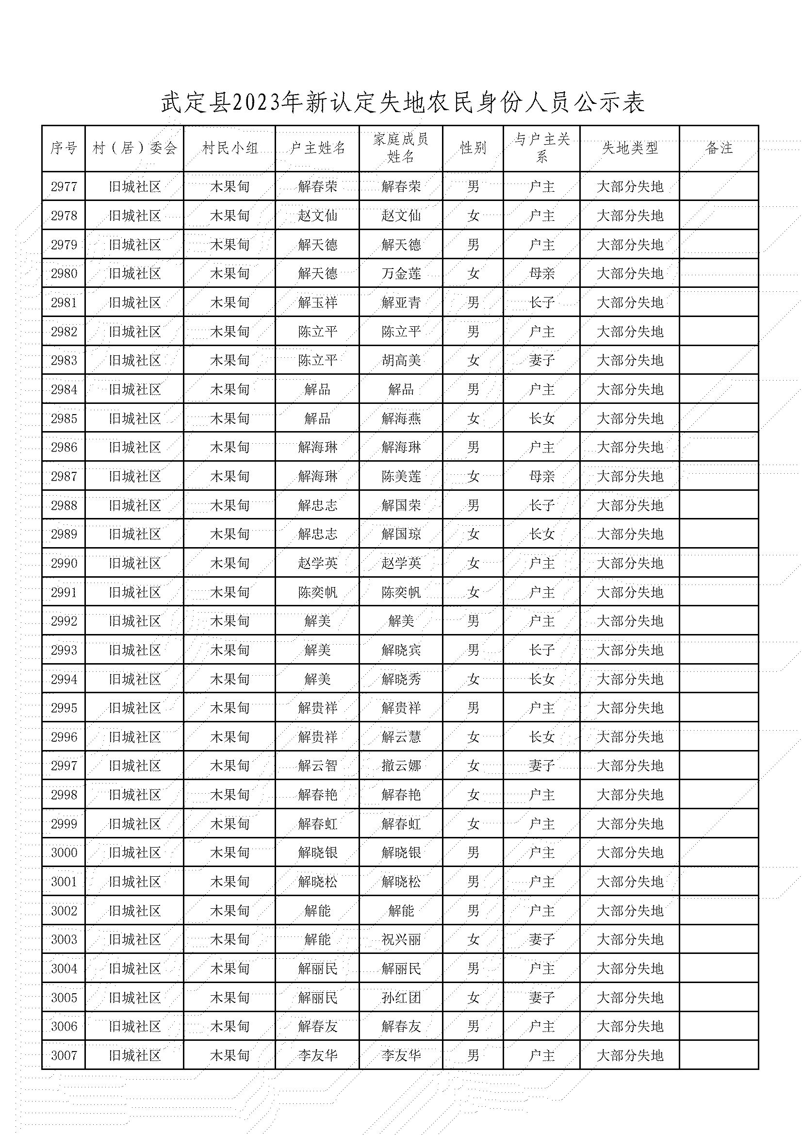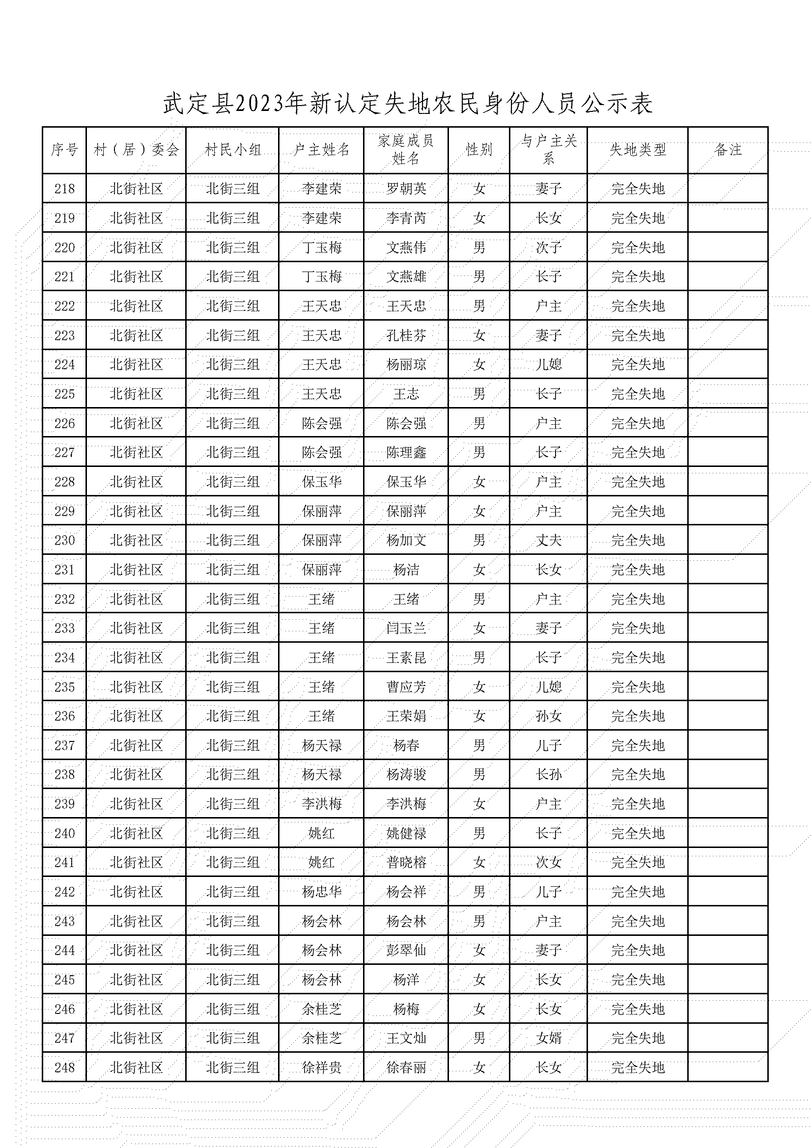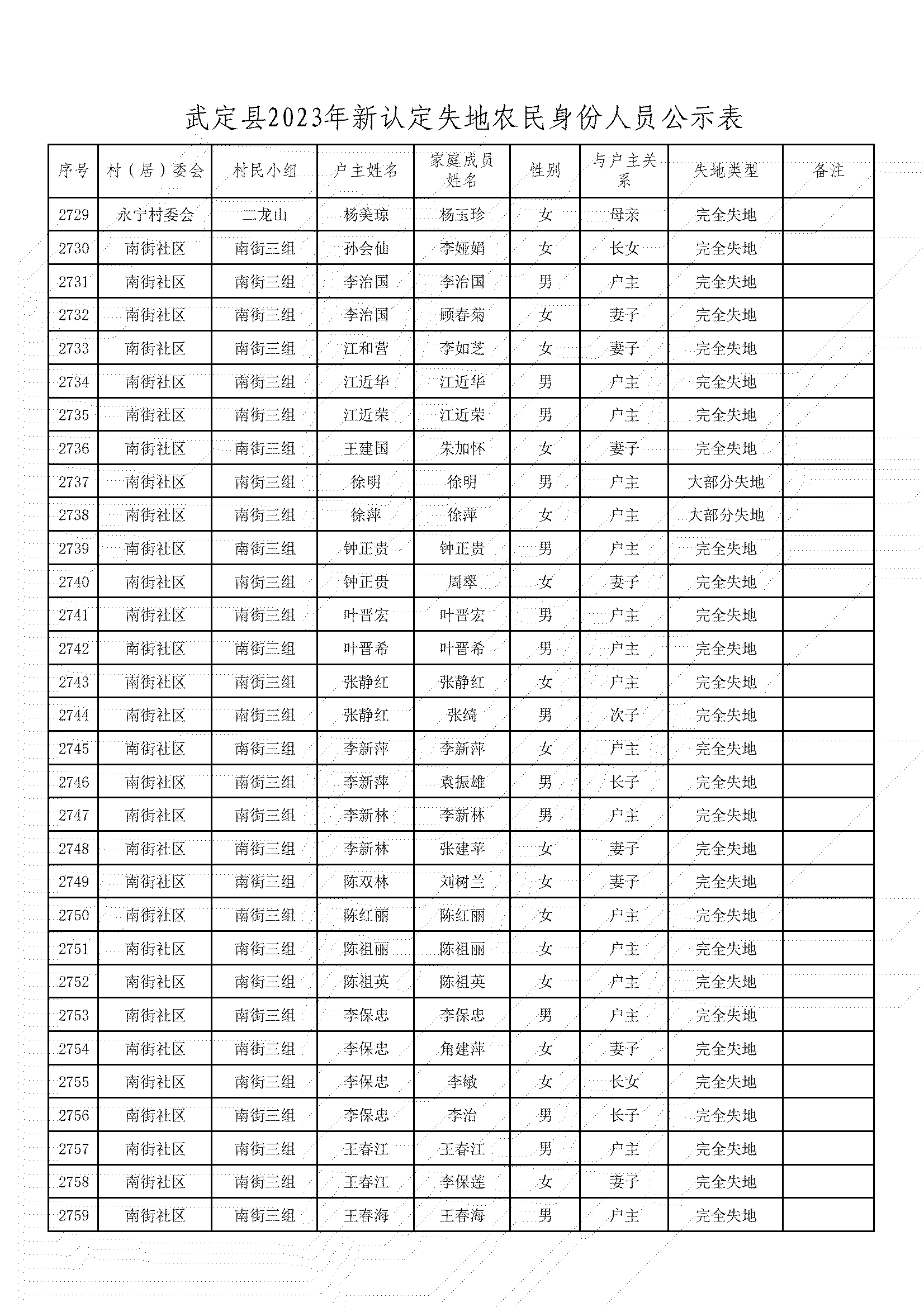 根据《武定县人民政府办公室印发武定县改革完善被征地农民基本养老保障工作实施办法的通知》(武政办发〔2020〕6号)文件精神,经村(居)委会、狮山镇、县公安局、县自然资源局、县农业农村局、县人社局对被征地农民土地征收、户籍人口、参加基本养老保险等情况进行审核,现将2023年符合认定为被征地农民身份的人员予以公示,接受社会监督。公示期从2023年12月18日至2023年12月22日,共5天。公示期间,如对公示对象有异议,请向武定县人力资源和社会保障局社会保险中心反映。