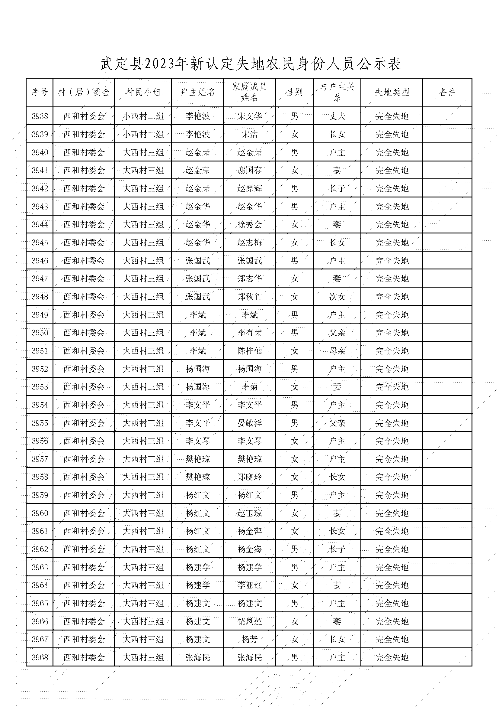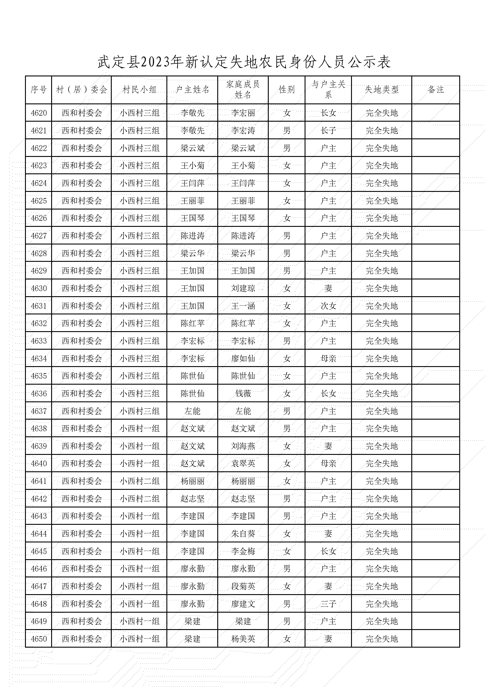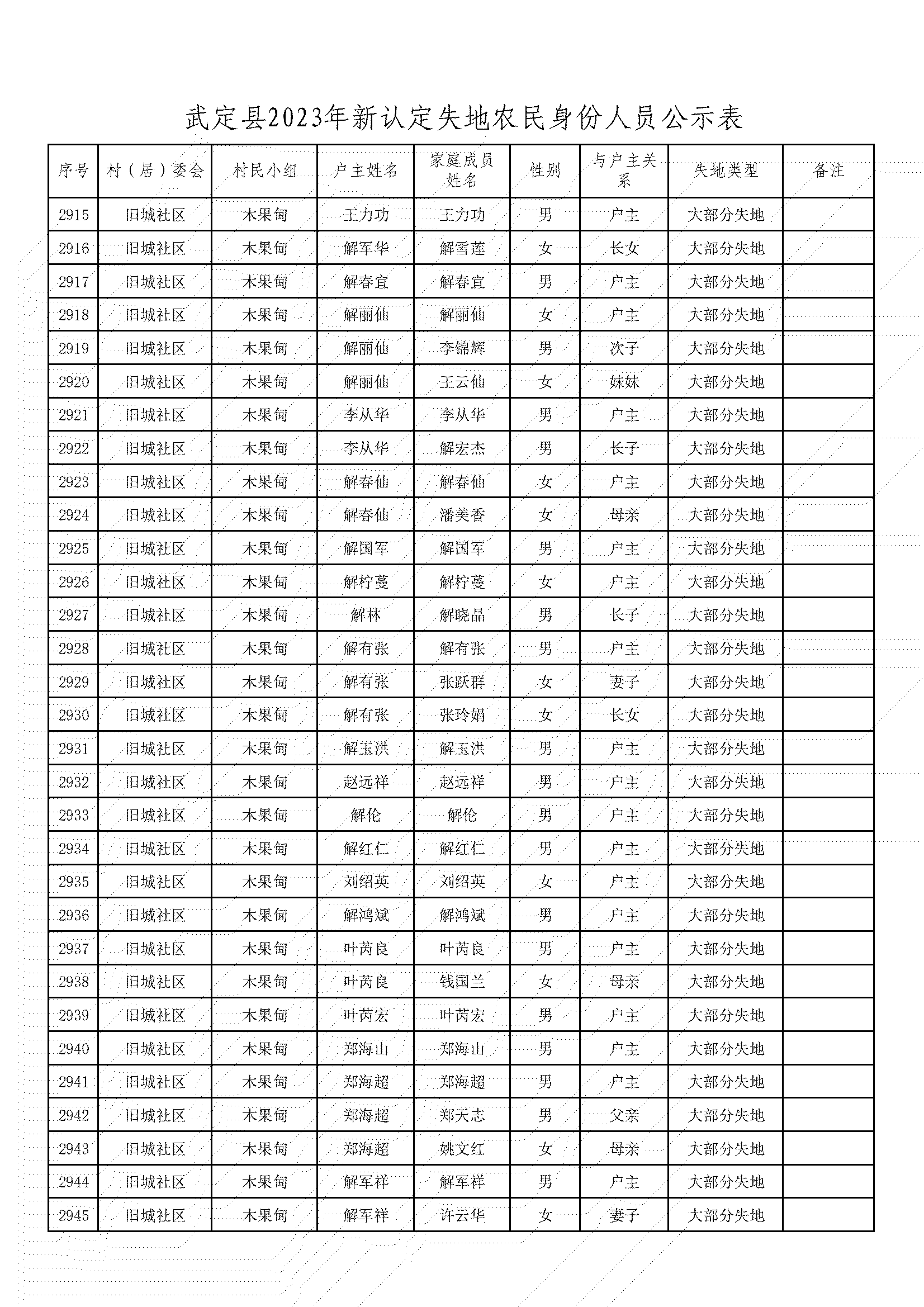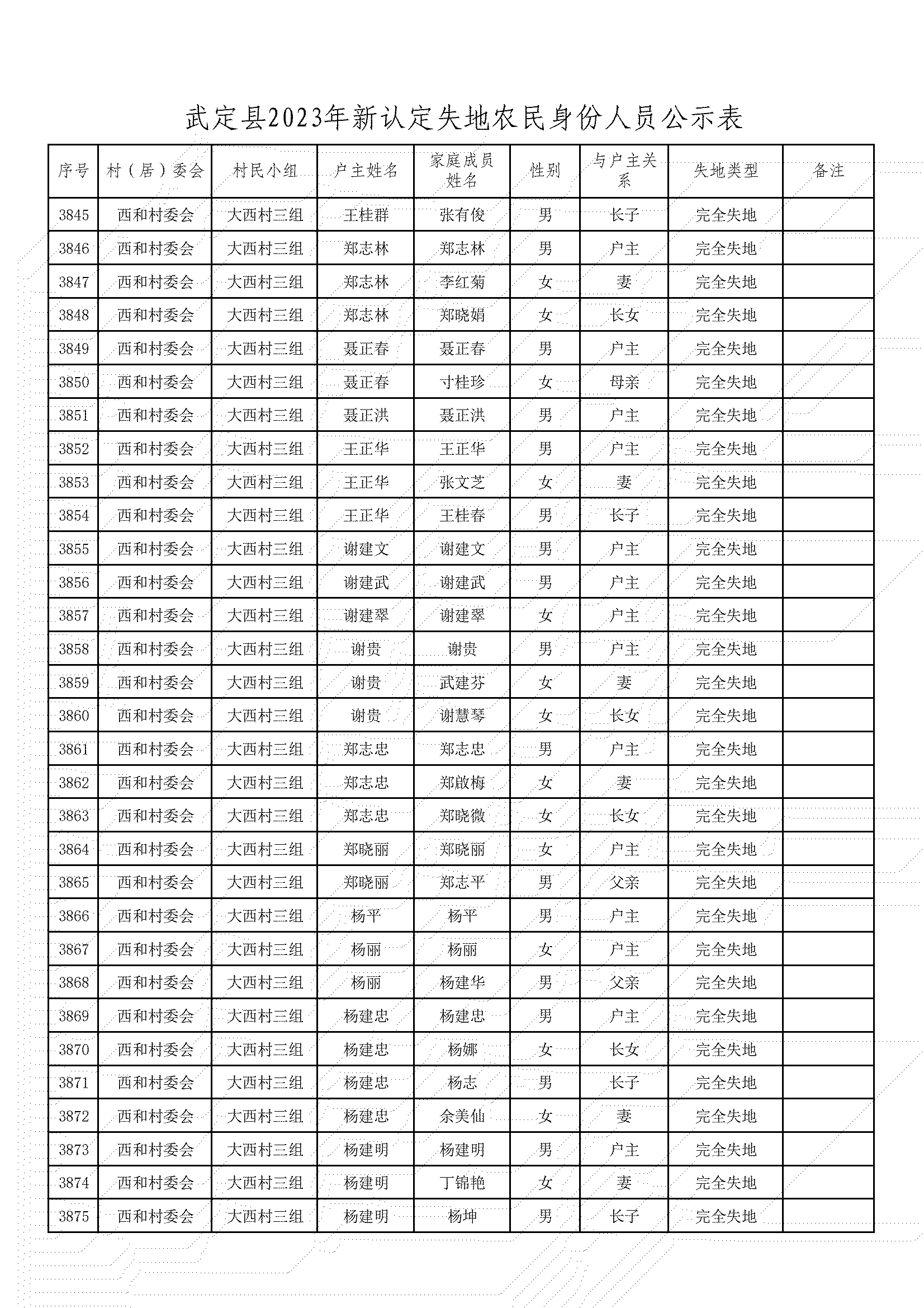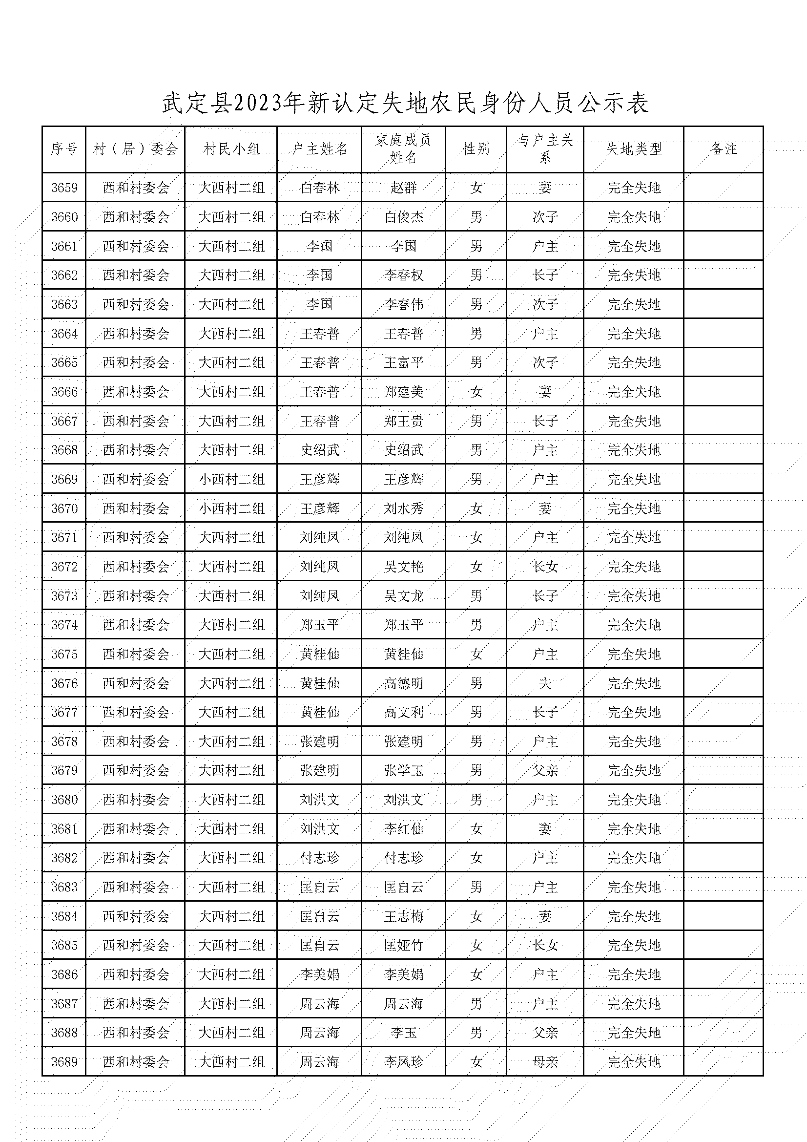 根据《武定县人民政府办公室印发武定县改革完善被征地农民基本养老保障工作实施办法的通知》(武政办发〔2020〕6号)文件精神,经村(居)委会、狮山镇、县公安局、县自然资源局、县农业农村局、县人社局对被征地农民土地征收、户籍人口、参加基本养老保险等情况进行审核,现将2023年符合认定为被征地农民身份的人员予以公示,接受社会监督。公示期从2023年12月18日至2023年12月22日,共5天。公示期间,如对公示对象有异议,请向武定县人力资源和社会保障局社会保险中心反映。