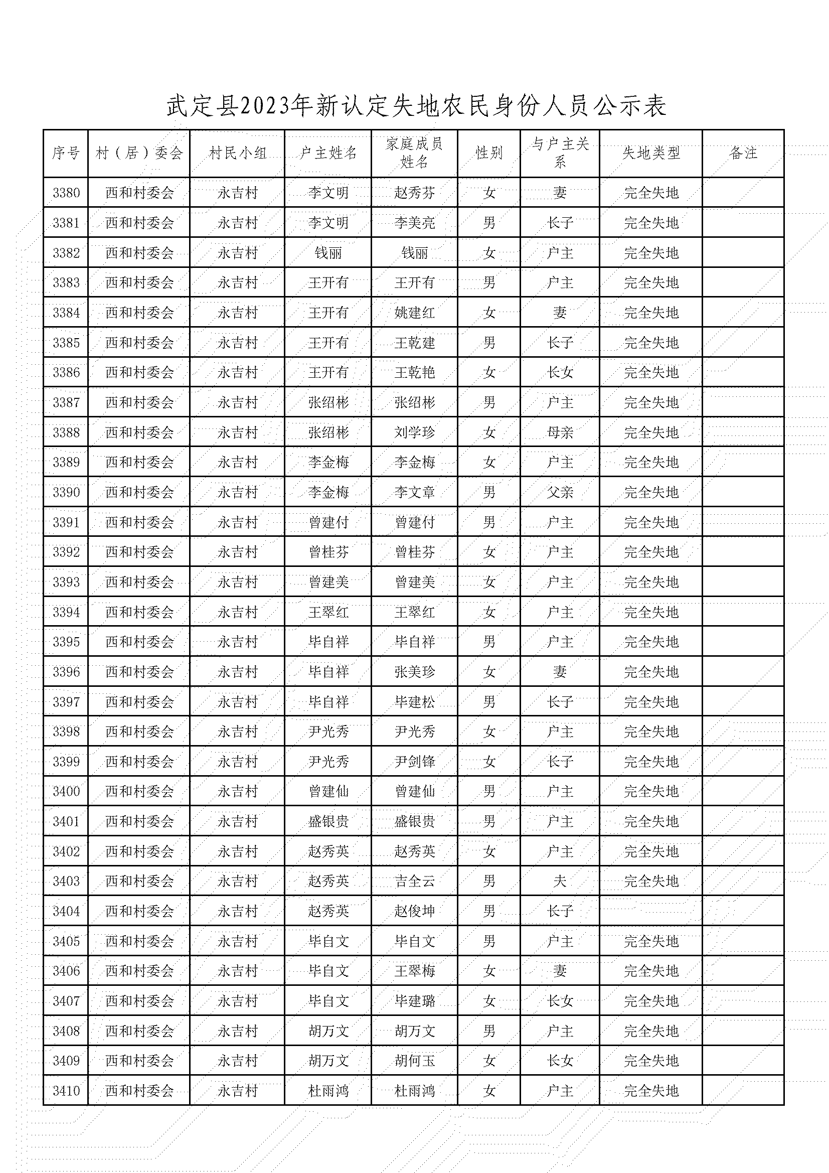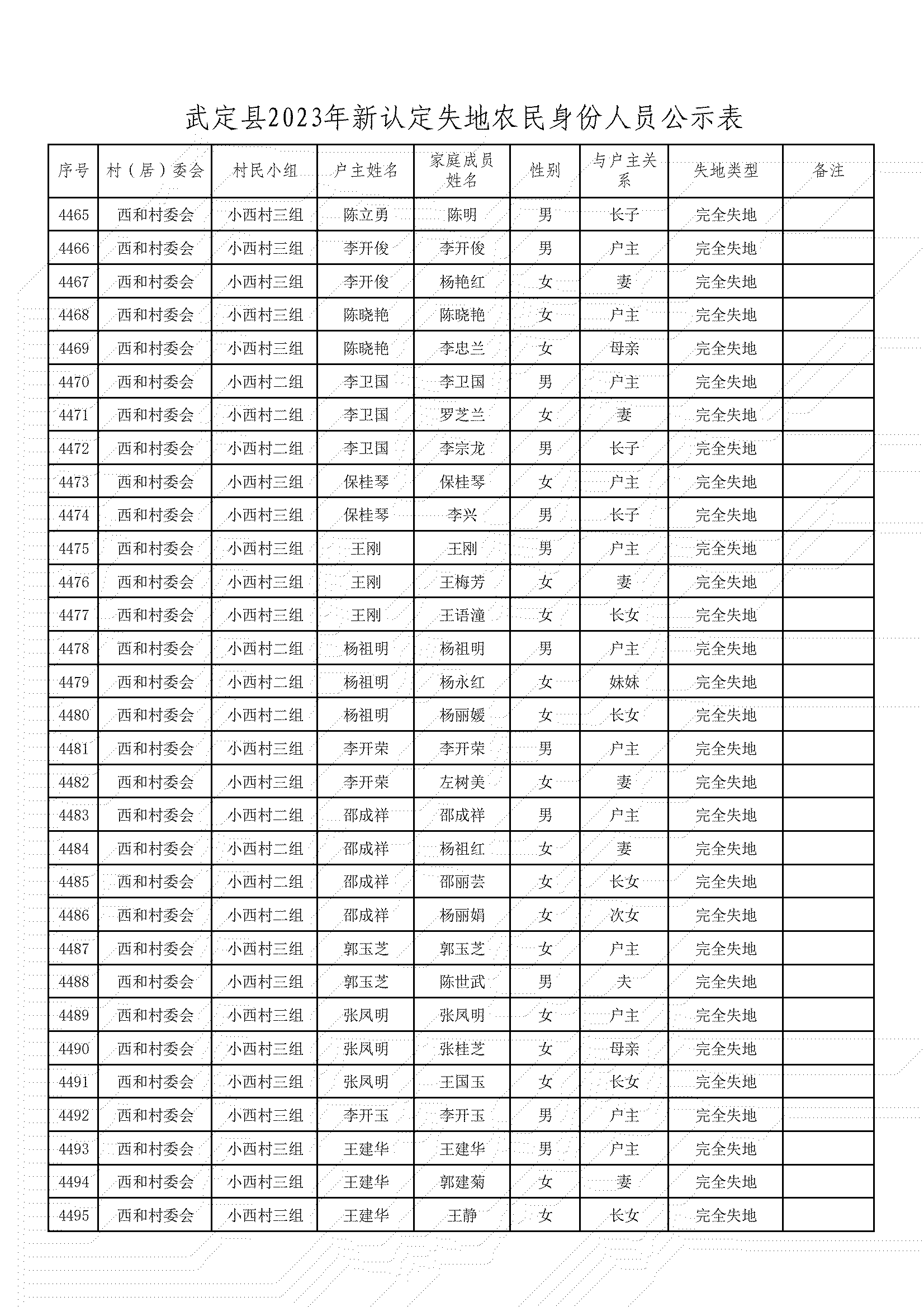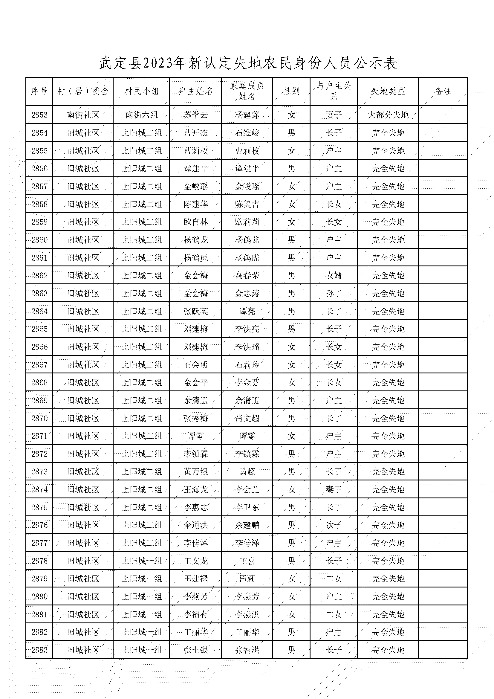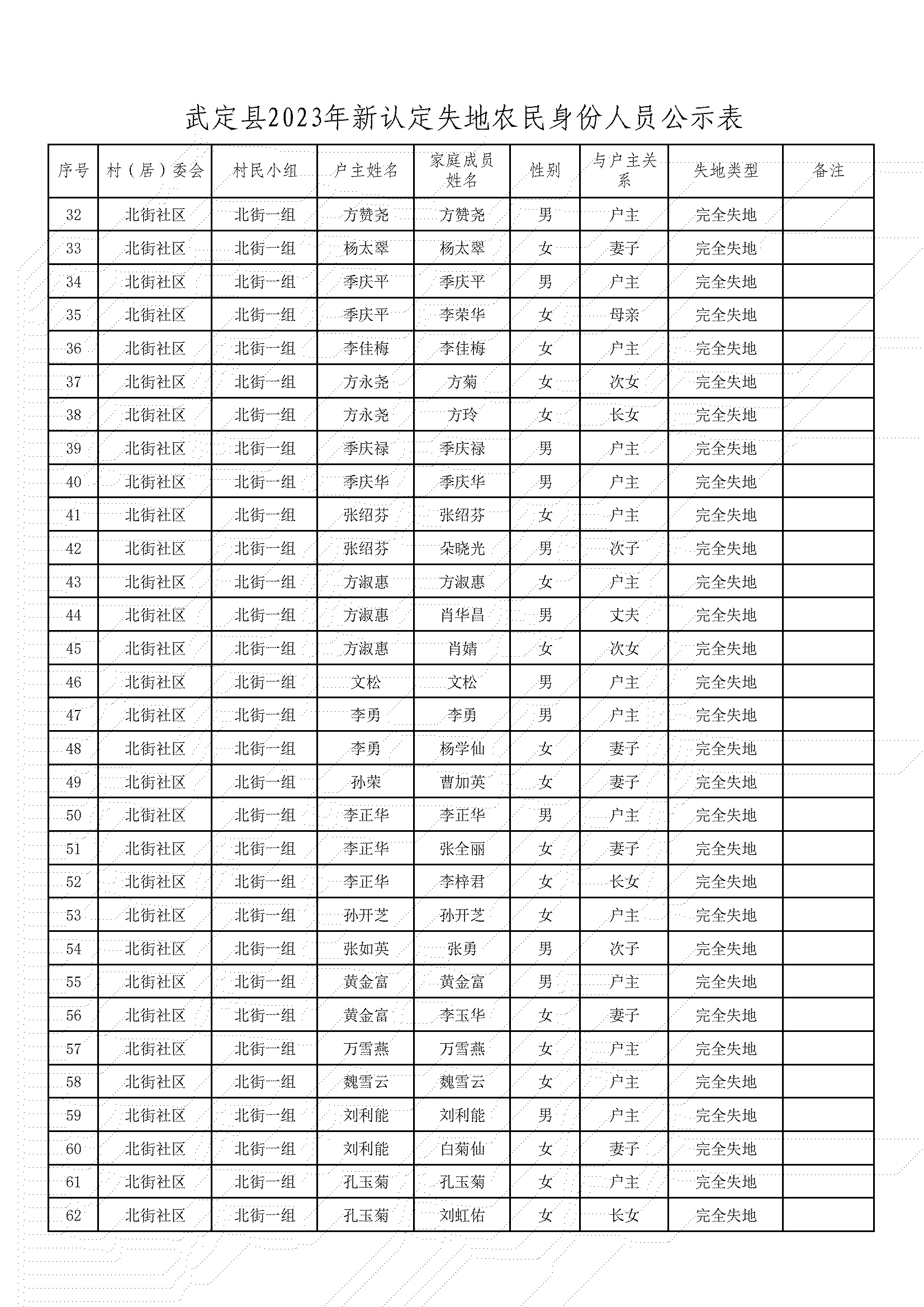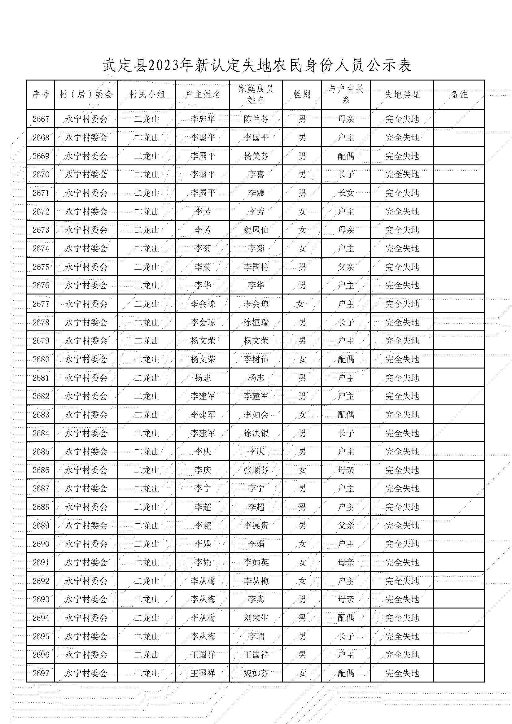根据《武定县人民政府办公室印发武定县改革完善被征地农民基本养老保障工作实施办法的通知》(武政办发〔2020〕6号)文件精神,经村(居)委会、狮山镇、县公安局、县自然资源局、县农业农村局、县人社局对被征地农民土地征收、户籍人口、参加基本养老保险等情况进行审核,现将2023年符合认定为被征地农民身份的人员予以公示,接受社会监督。公示期从2023年12月18日至2023年12月22日,共5天。公示期间,如对公示对象有异议,请向武定县人力资源和社会保障局社会保险中心反映。