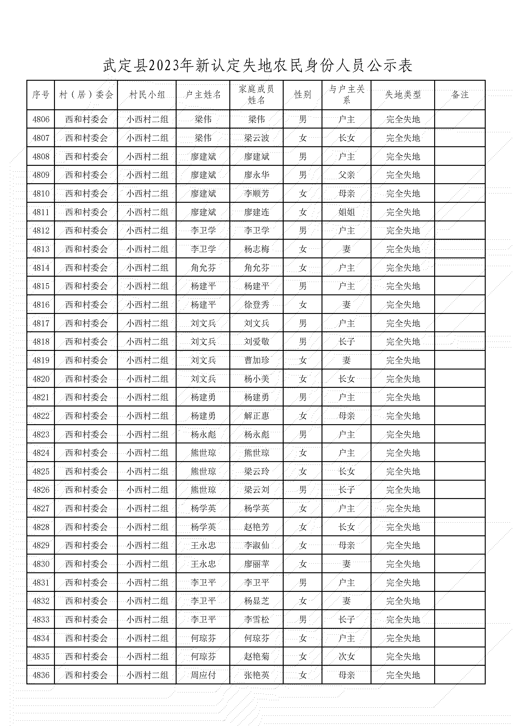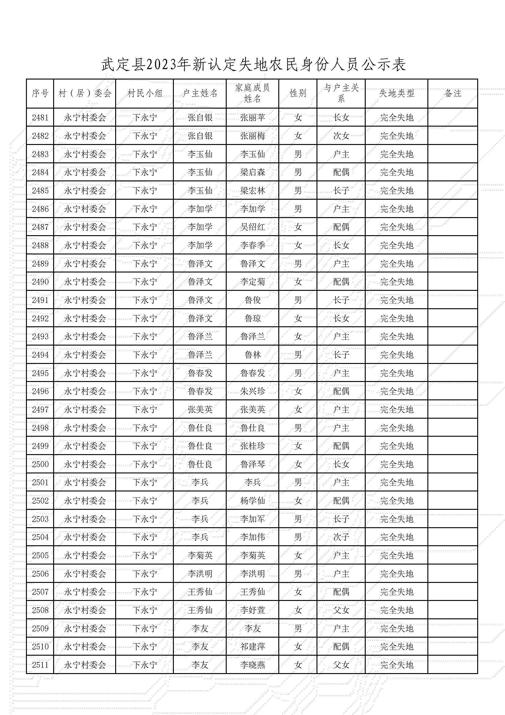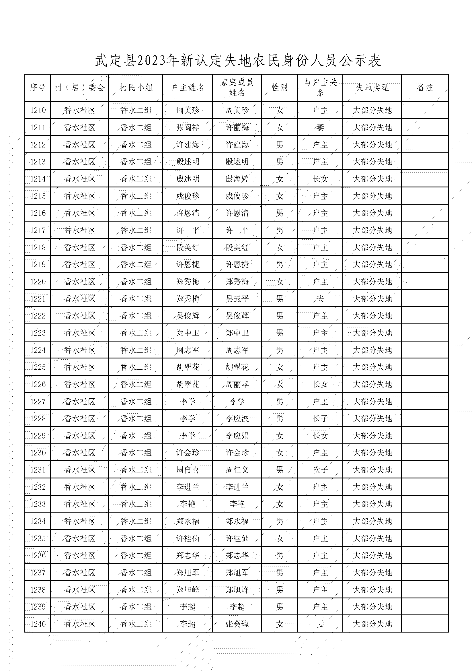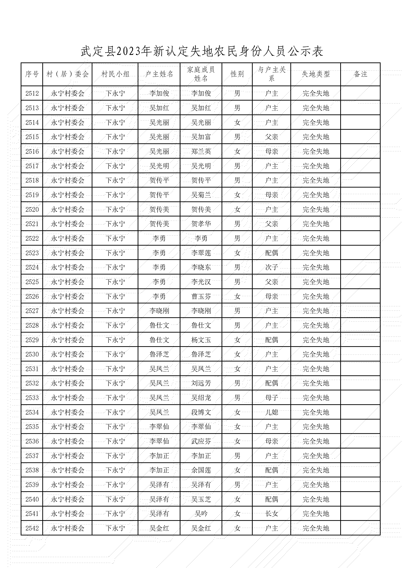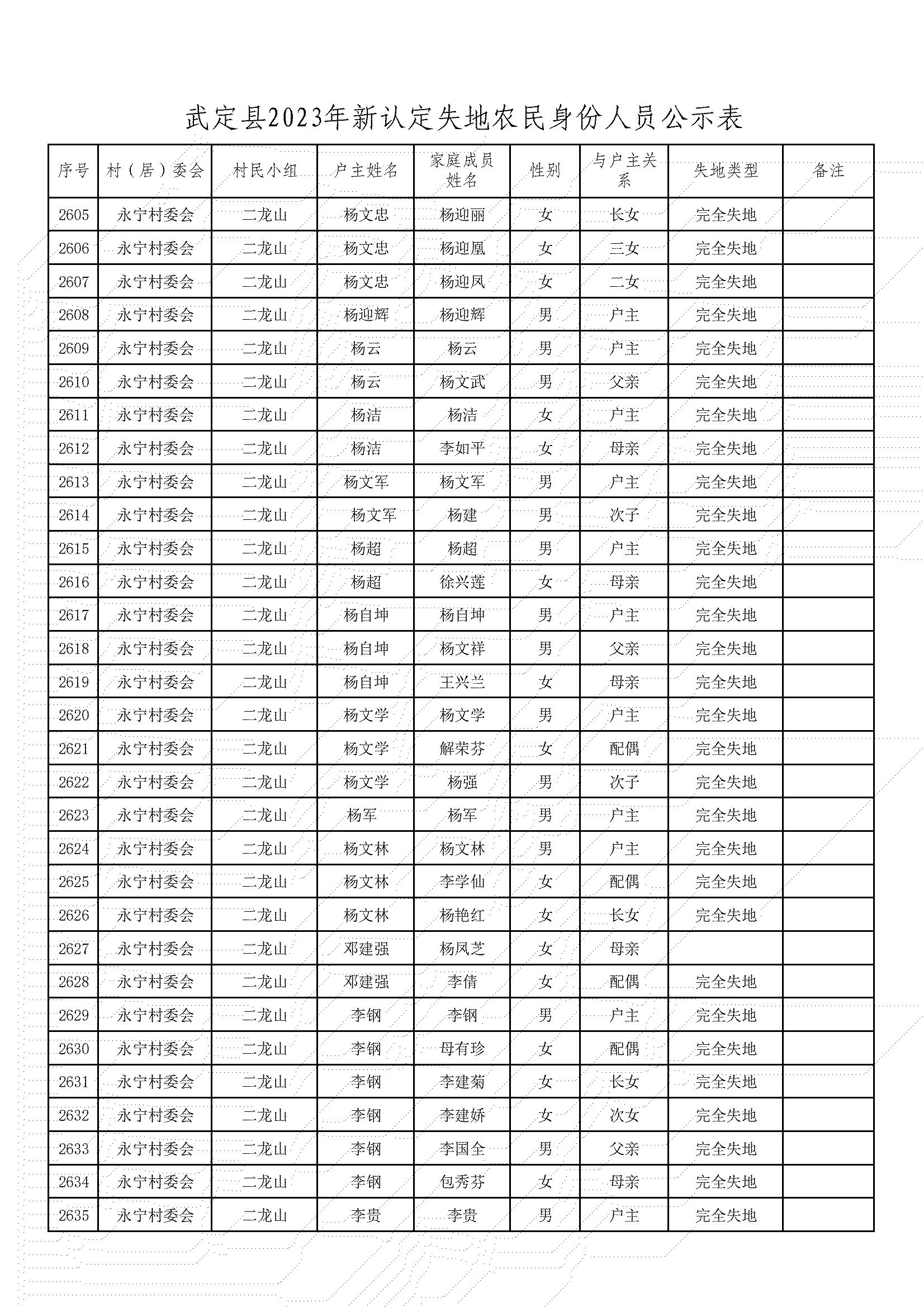 根据《武定县人民政府办公室印发武定县改革完善被征地农民基本养老保障工作实施办法的通知》(武政办发〔2020〕6号)文件精神,经村(居)委会、狮山镇、县公安局、县自然资源局、县农业农村局、县人社局对被征地农民土地征收、户籍人口、参加基本养老保险等情况进行审核,现将2023年符合认定为被征地农民身份的人员予以公示,接受社会监督。公示期从2023年12月18日至2023年12月22日,共5天。公示期间,如对公示对象有异议,请向武定县人力资源和社会保障局社会保险中心反映。
