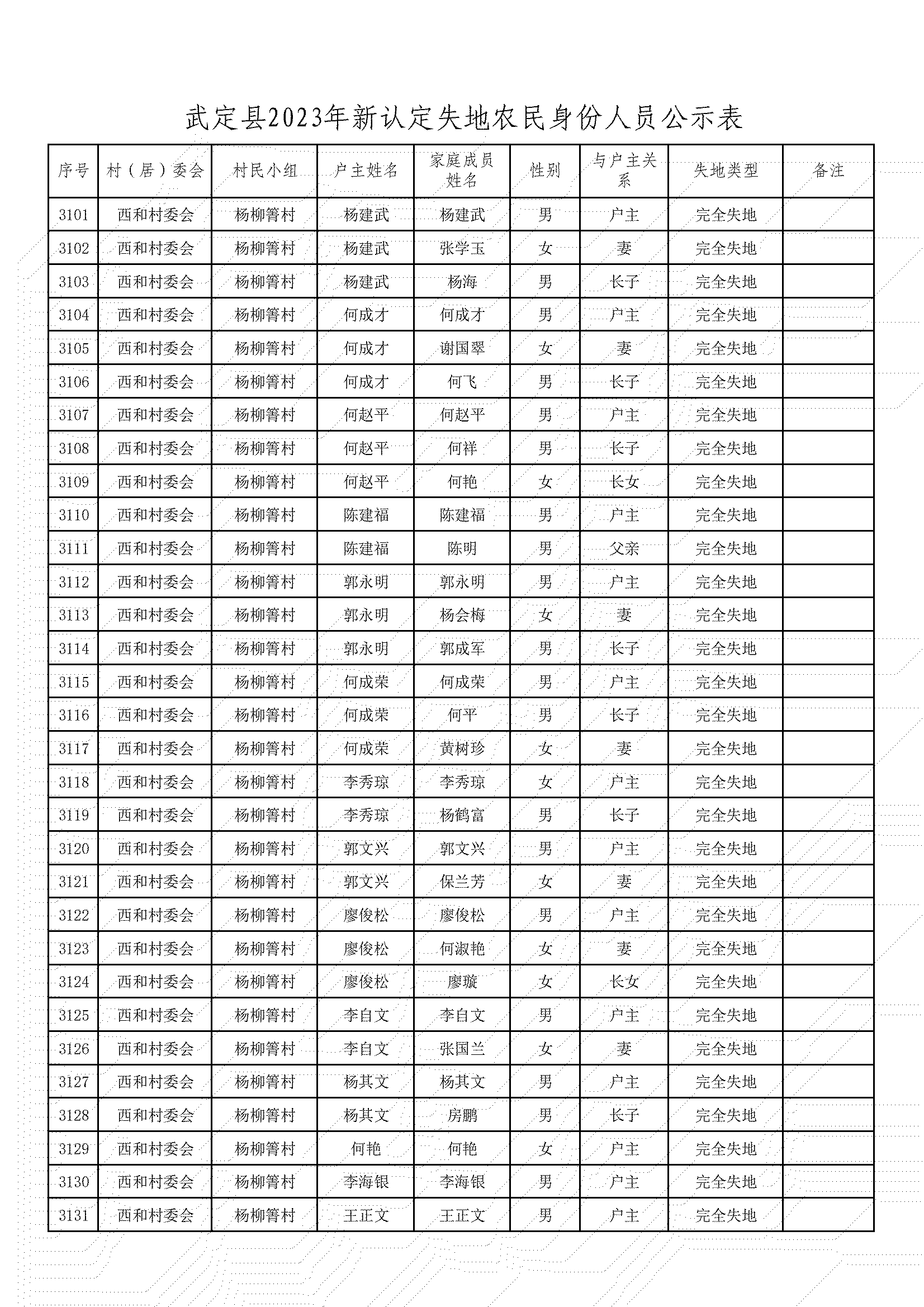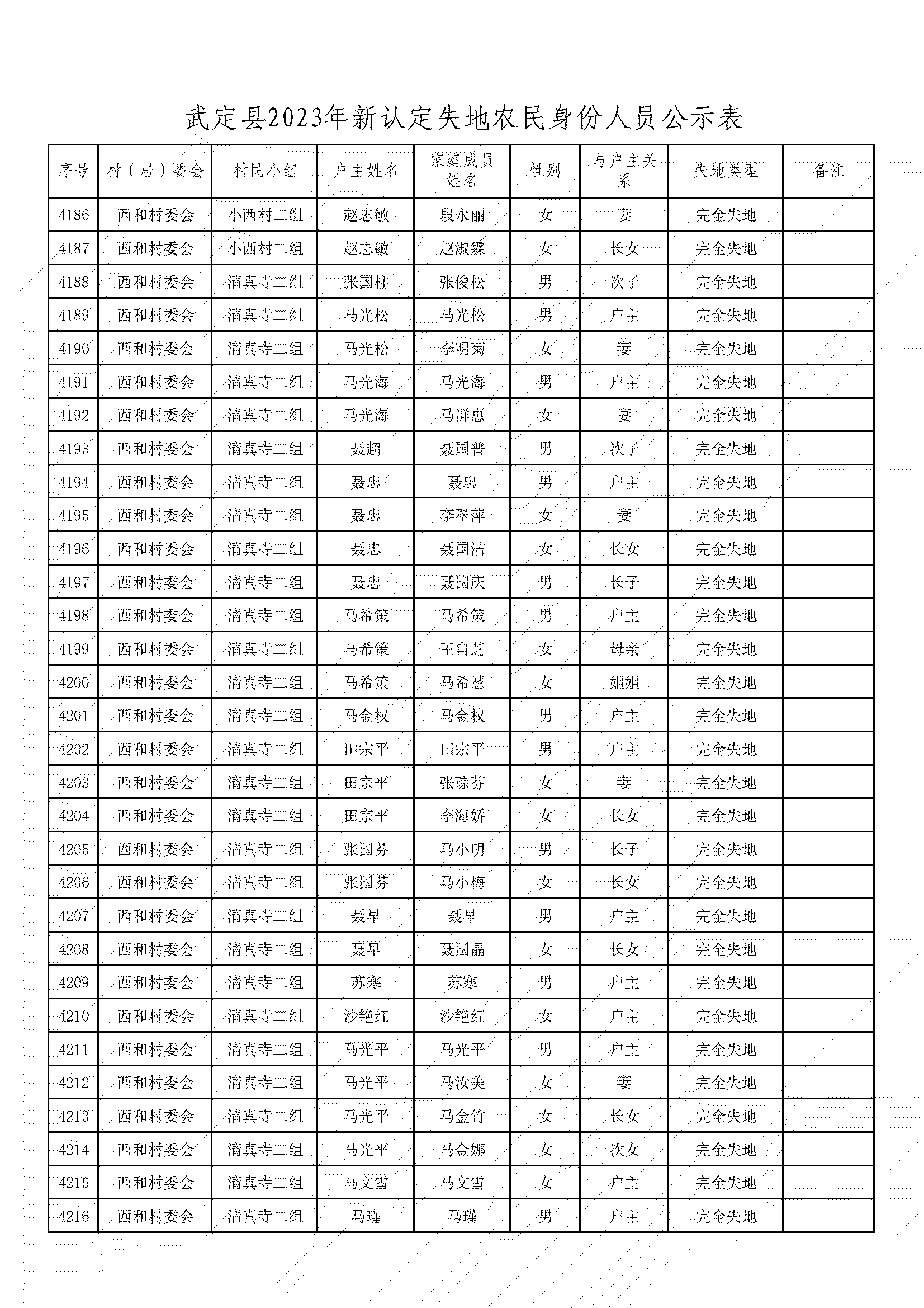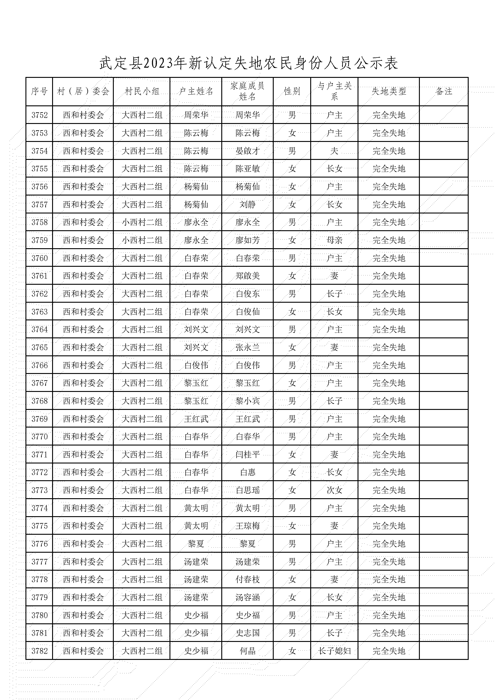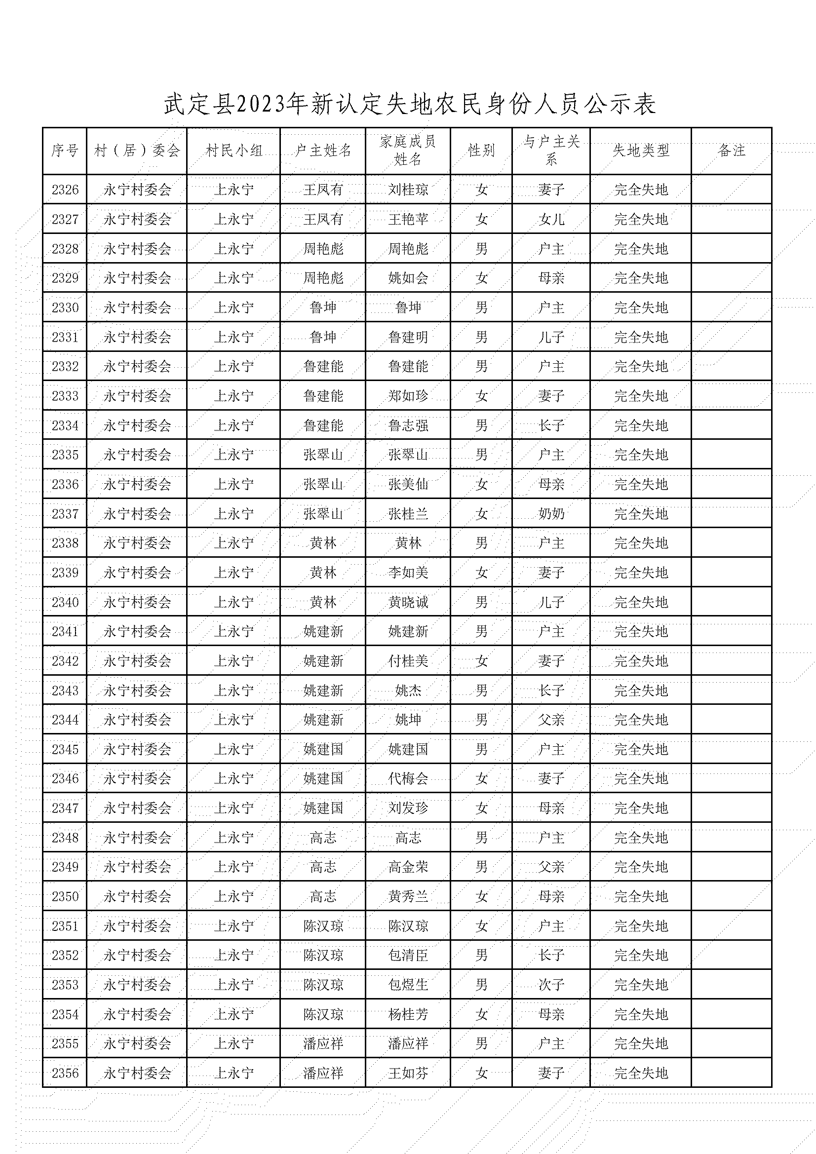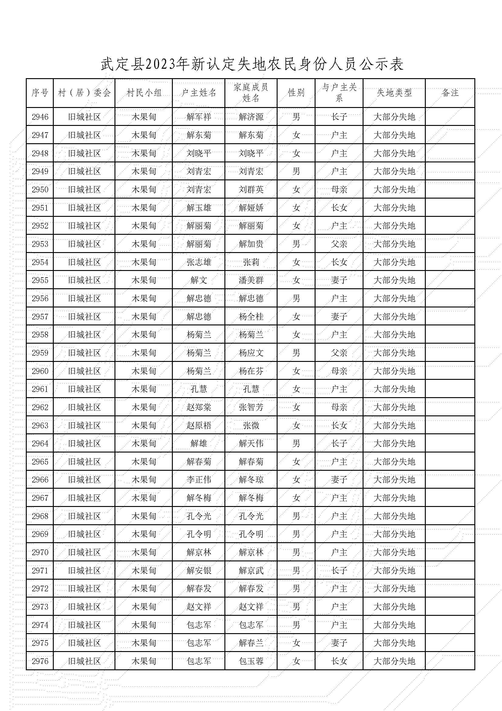 根据《武定县人民政府办公室印发武定县改革完善被征地农民基本养老保障工作实施办法的通知》(武政办发〔2020〕6号)文件精神,经村(居)委会、狮山镇、县公安局、县自然资源局、县农业农村局、县人社局对被征地农民土地征收、户籍人口、参加基本养老保险等情况进行审核,现将2023年符合认定为被征地农民身份的人员予以公示,接受社会监督。公示期从2023年12月18日至2023年12月22日,共5天。公示期间,如对公示对象有异议,请向武定县人力资源和社会保障局社会保险中心反映。
