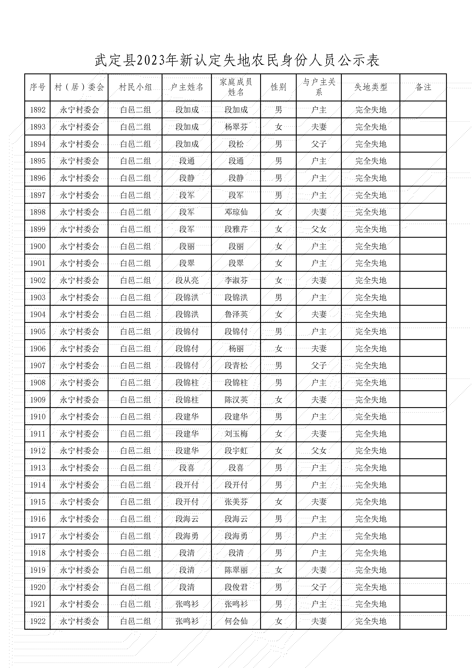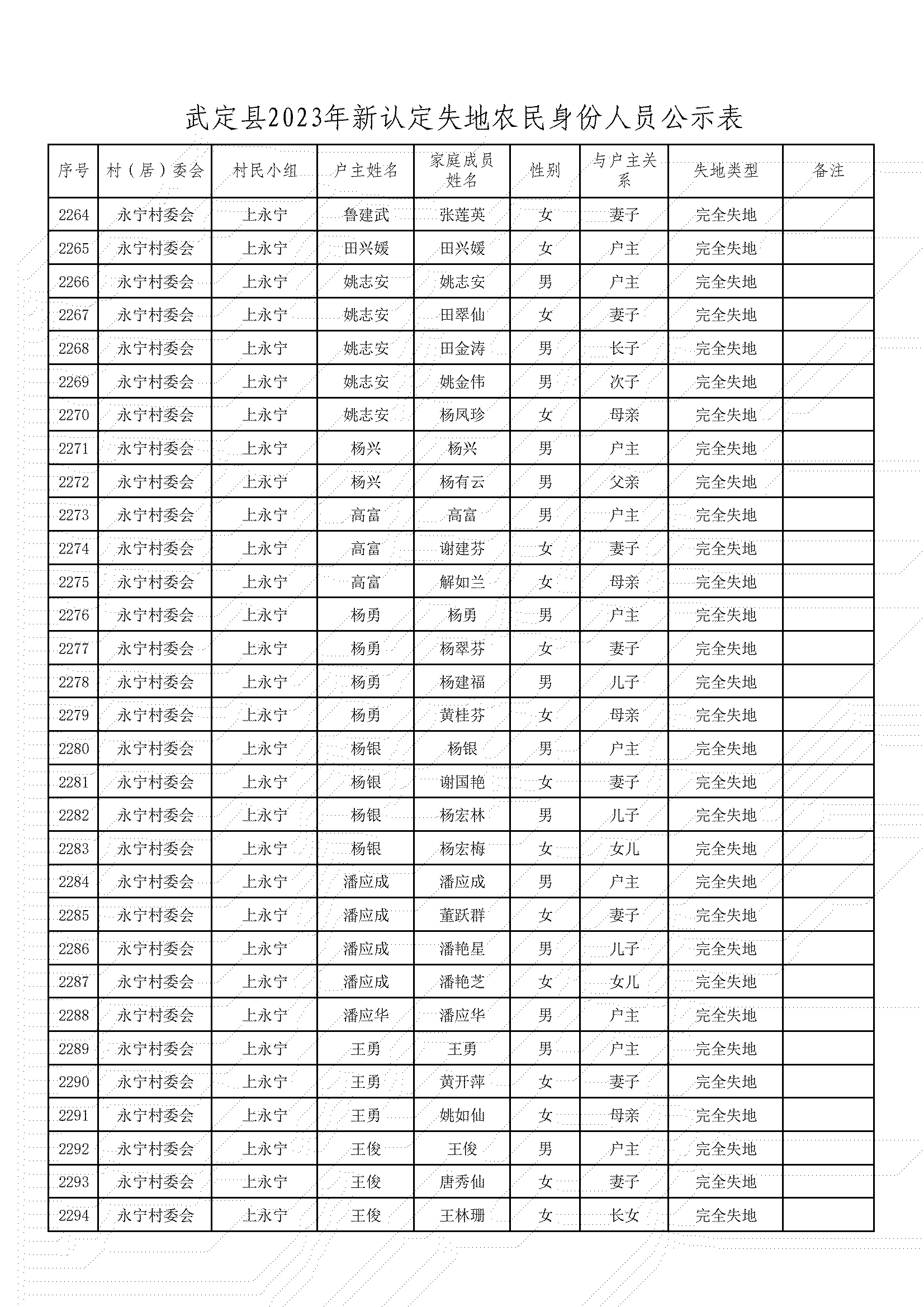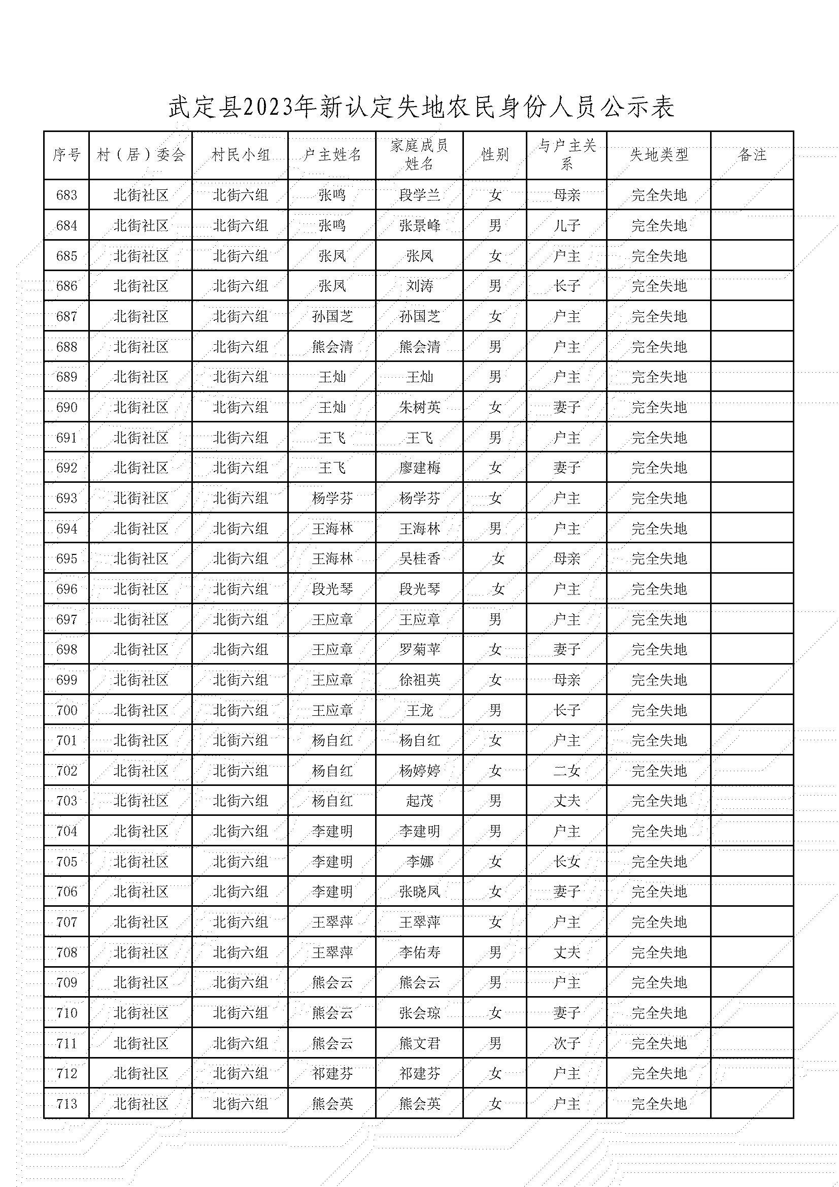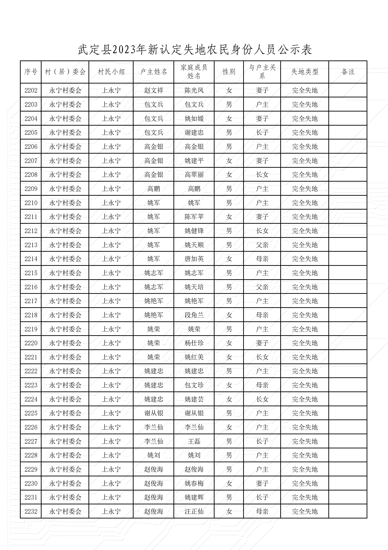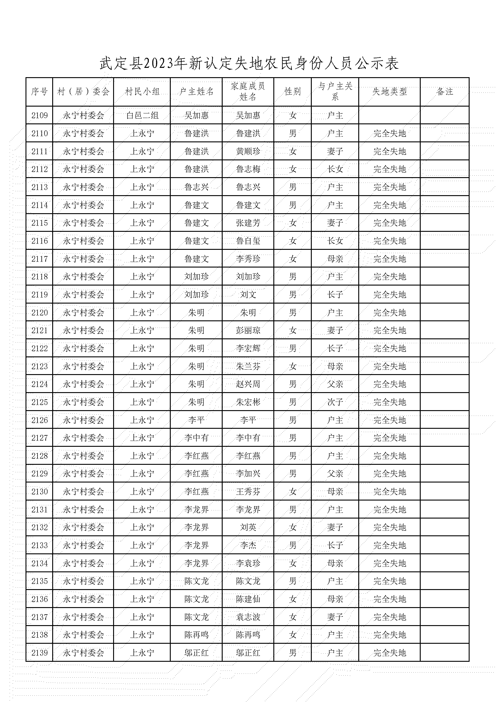 根据《武定县人民政府办公室印发武定县改革完善被征地农民基本养老保障工作实施办法的通知》(武政办发〔2020〕6号)文件精神,经村(居)委会、狮山镇、县公安局、县自然资源局、县农业农村局、县人社局对被征地农民土地征收、户籍人口、参加基本养老保险等情况进行审核,现将2023年符合认定为被征地农民身份的人员予以公示,接受社会监督。公示期从2023年12月18日至2023年12月22日,共5天。公示期间,如对公示对象有异议,请向武定县人力资源和社会保障局社会保险中心反映。