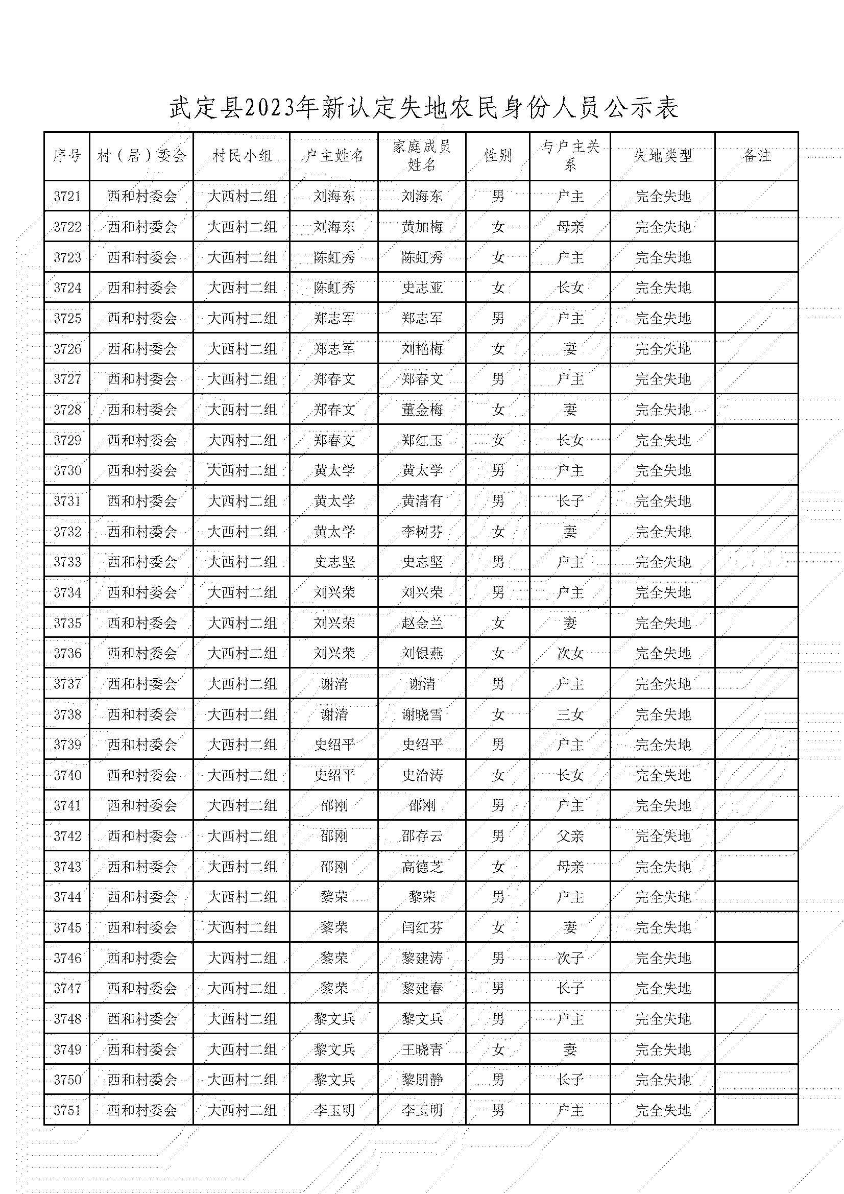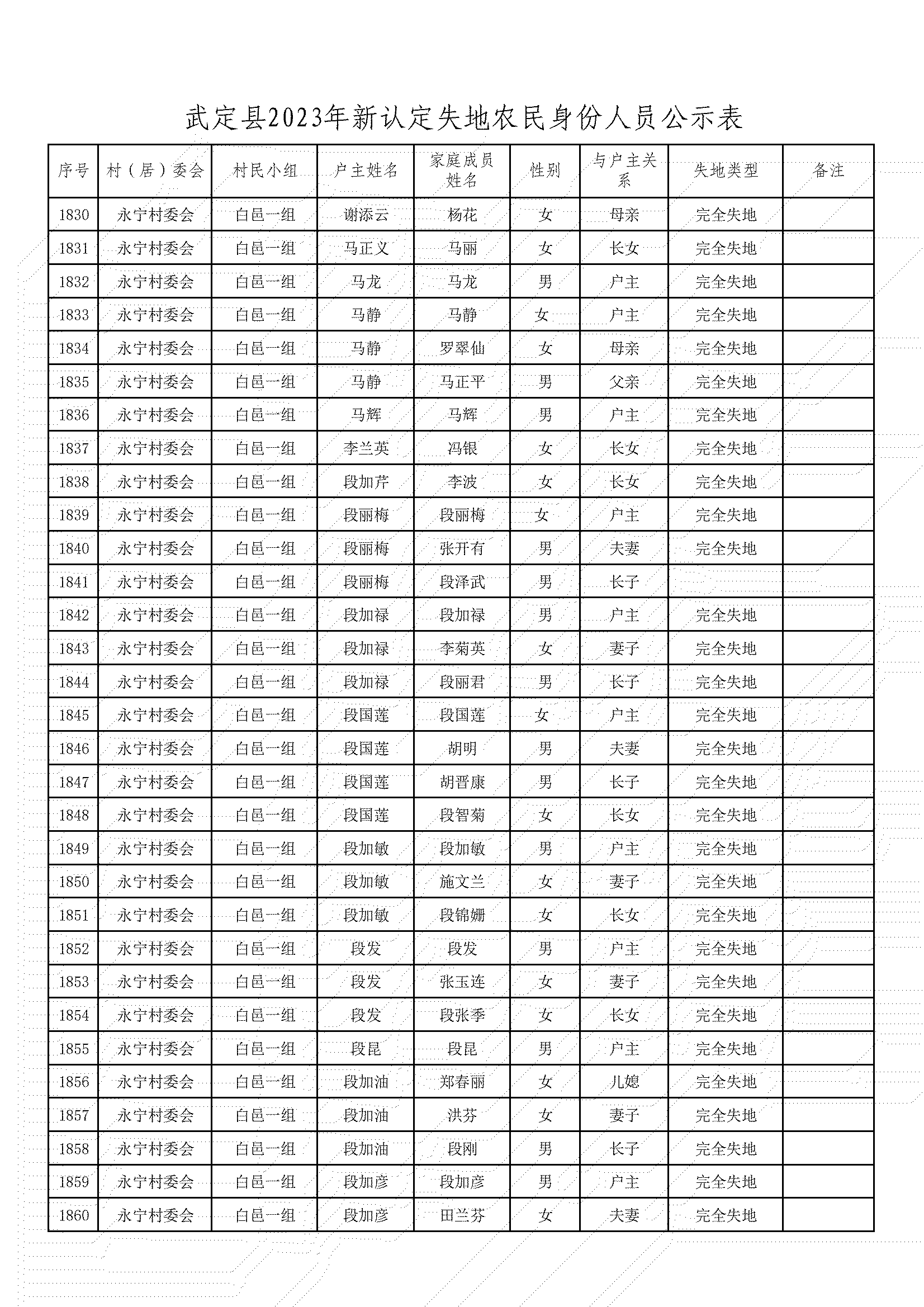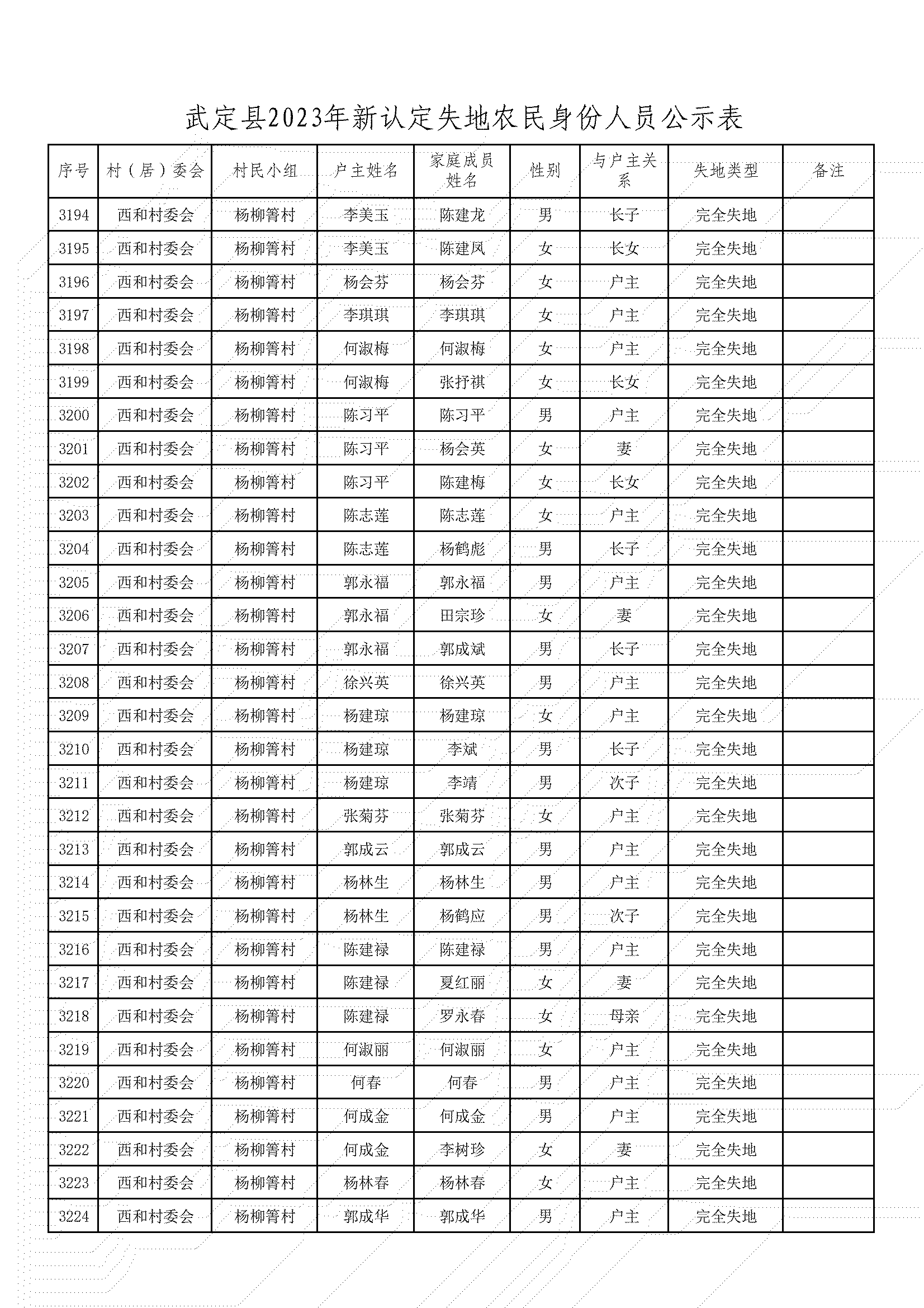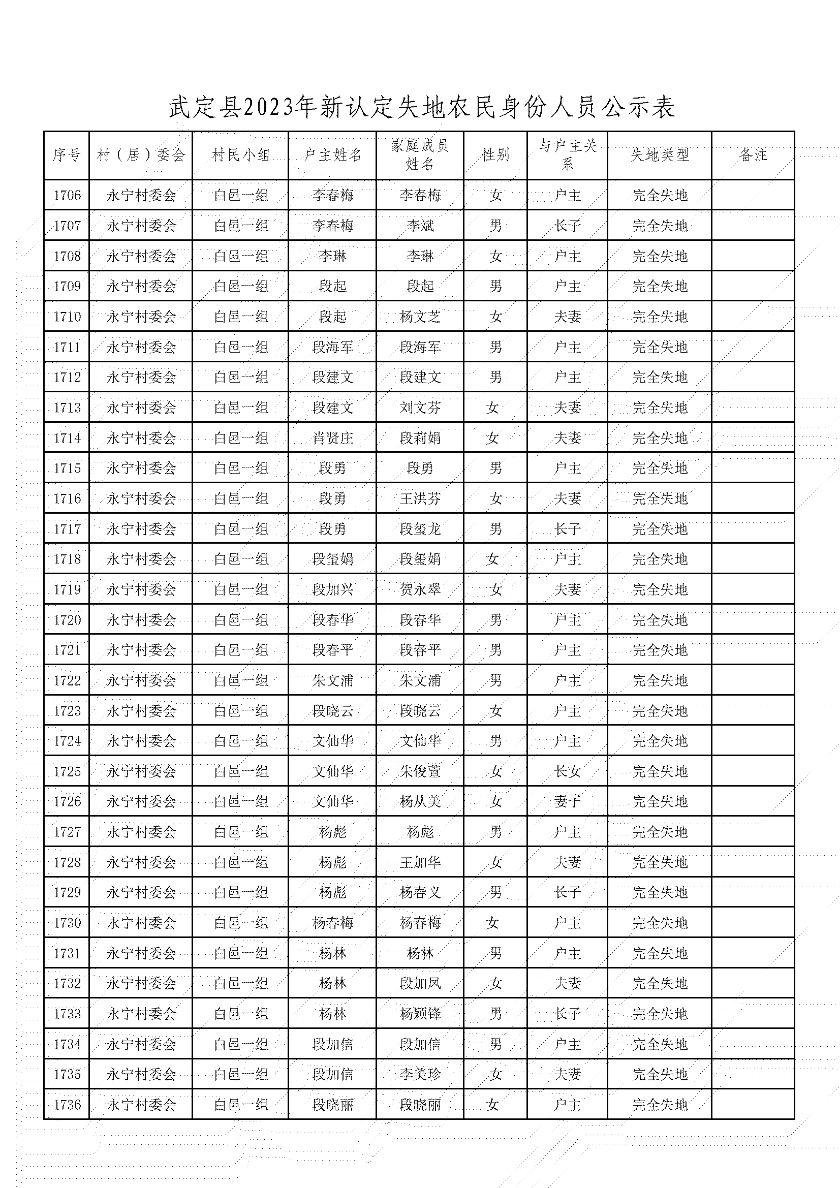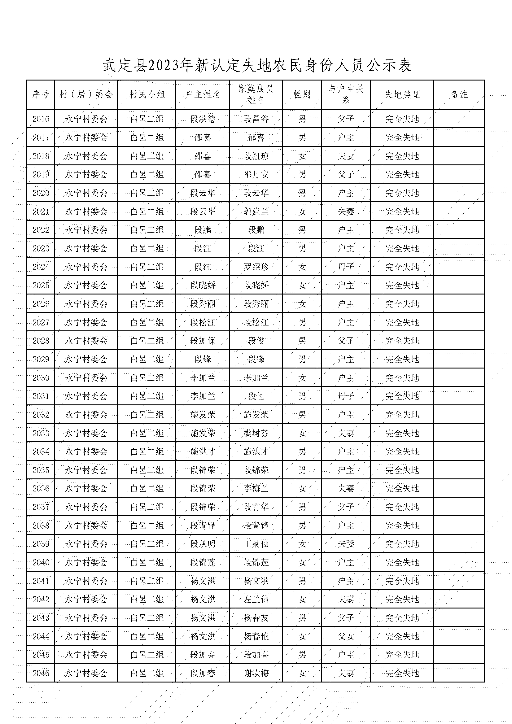 根据《武定县人民政府办公室印发武定县改革完善被征地农民基本养老保障工作实施办法的通知》(武政办发〔2020〕6号)文件精神,经村(居)委会、狮山镇、县公安局、县自然资源局、县农业农村局、县人社局对被征地农民土地征收、户籍人口、参加基本养老保险等情况进行审核,现将2023年符合认定为被征地农民身份的人员予以公示,接受社会监督。公示期从2023年12月18日至2023年12月22日,共5天。公示期间,如对公示对象有异议,请向武定县人力资源和社会保障局社会保险中心反映。