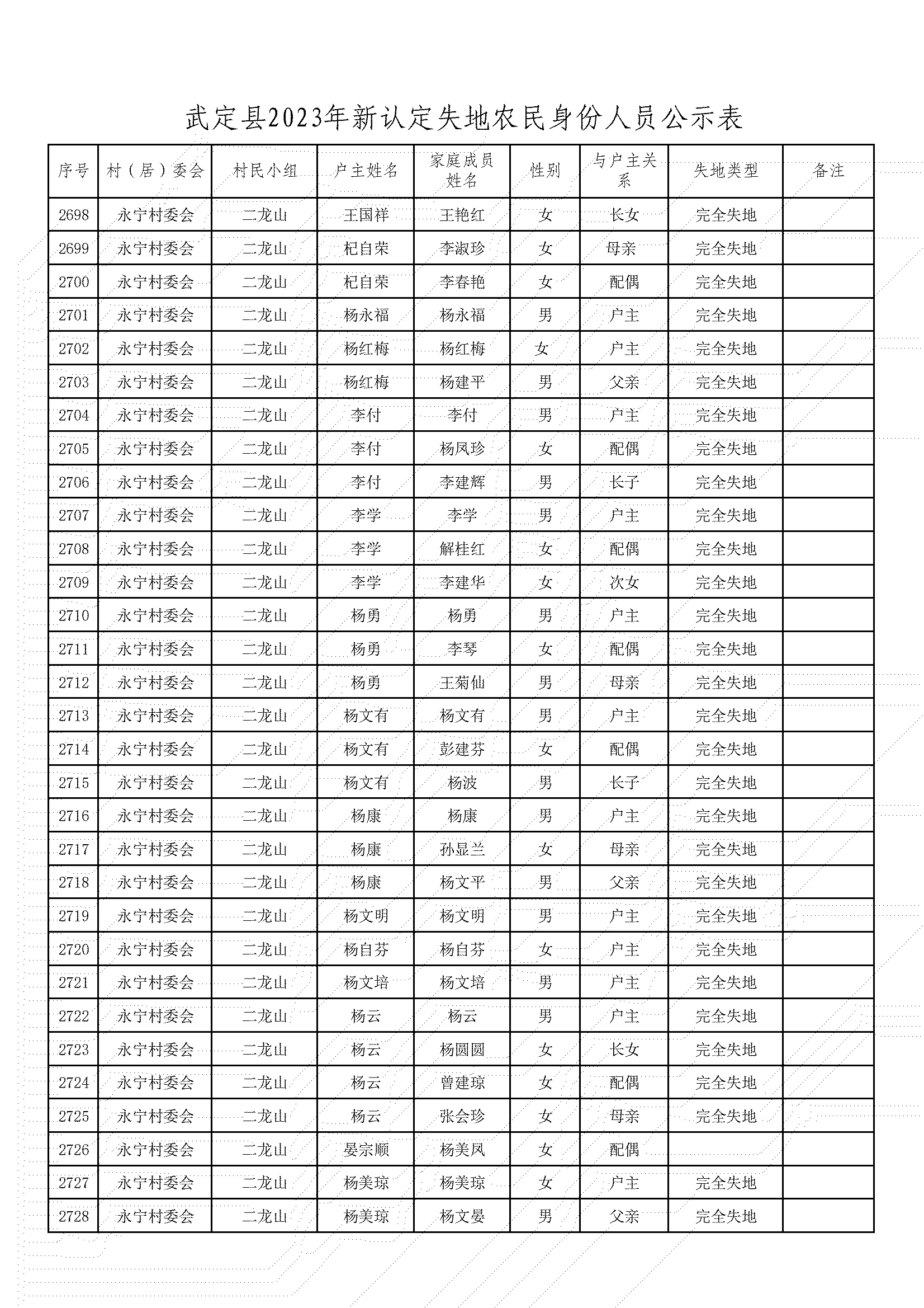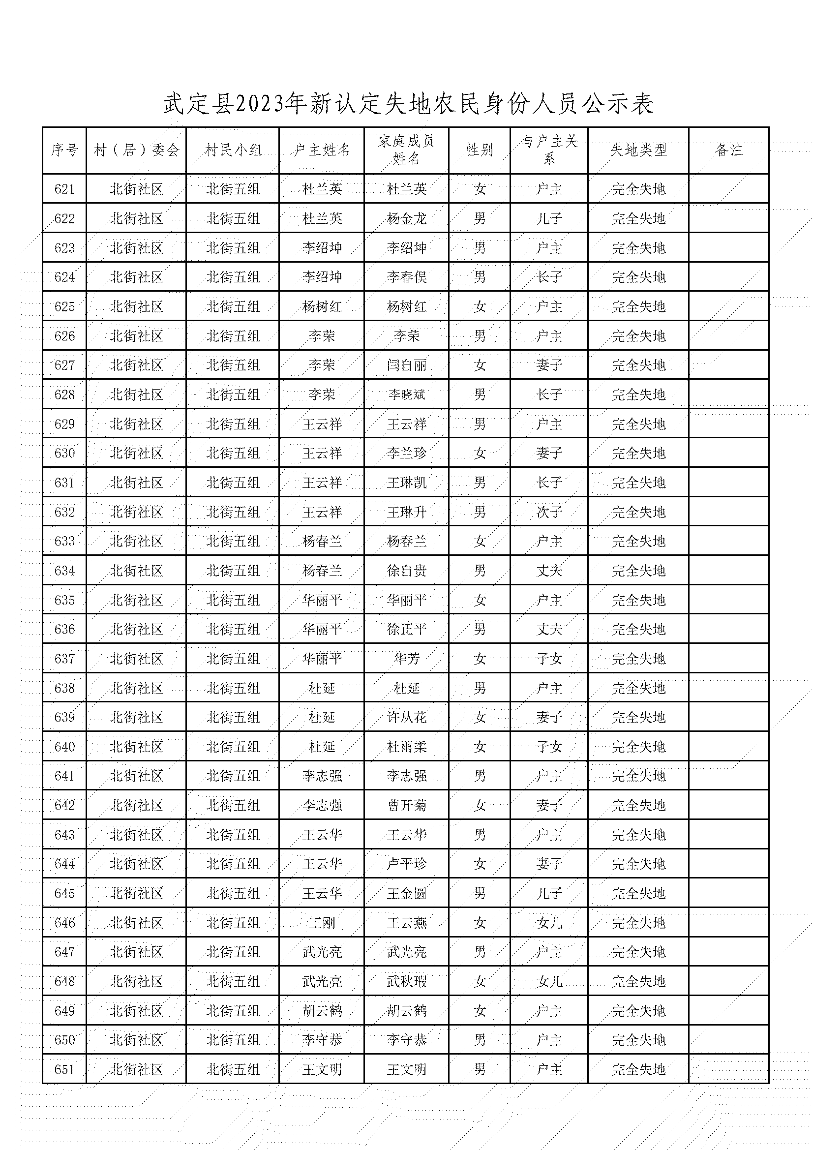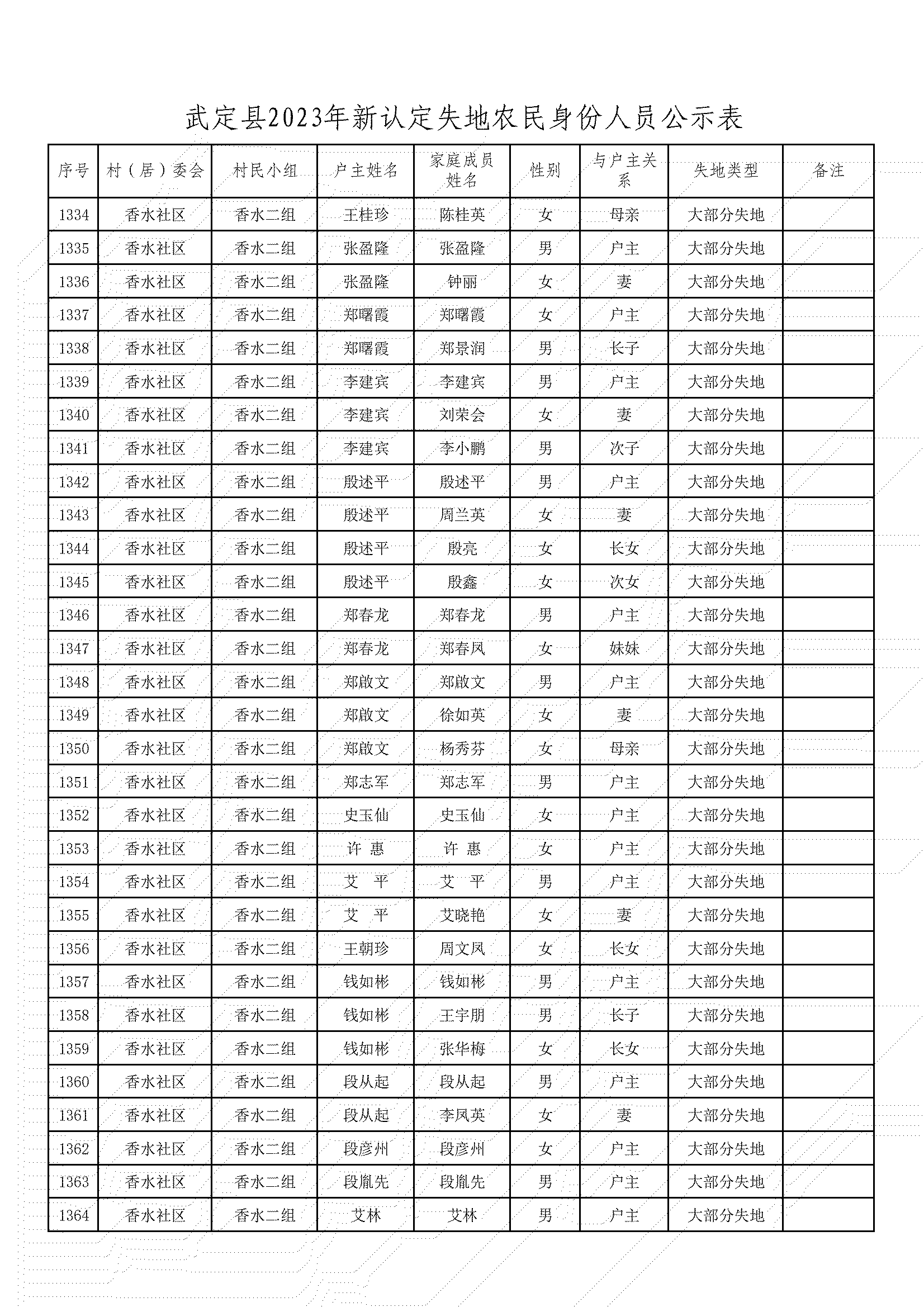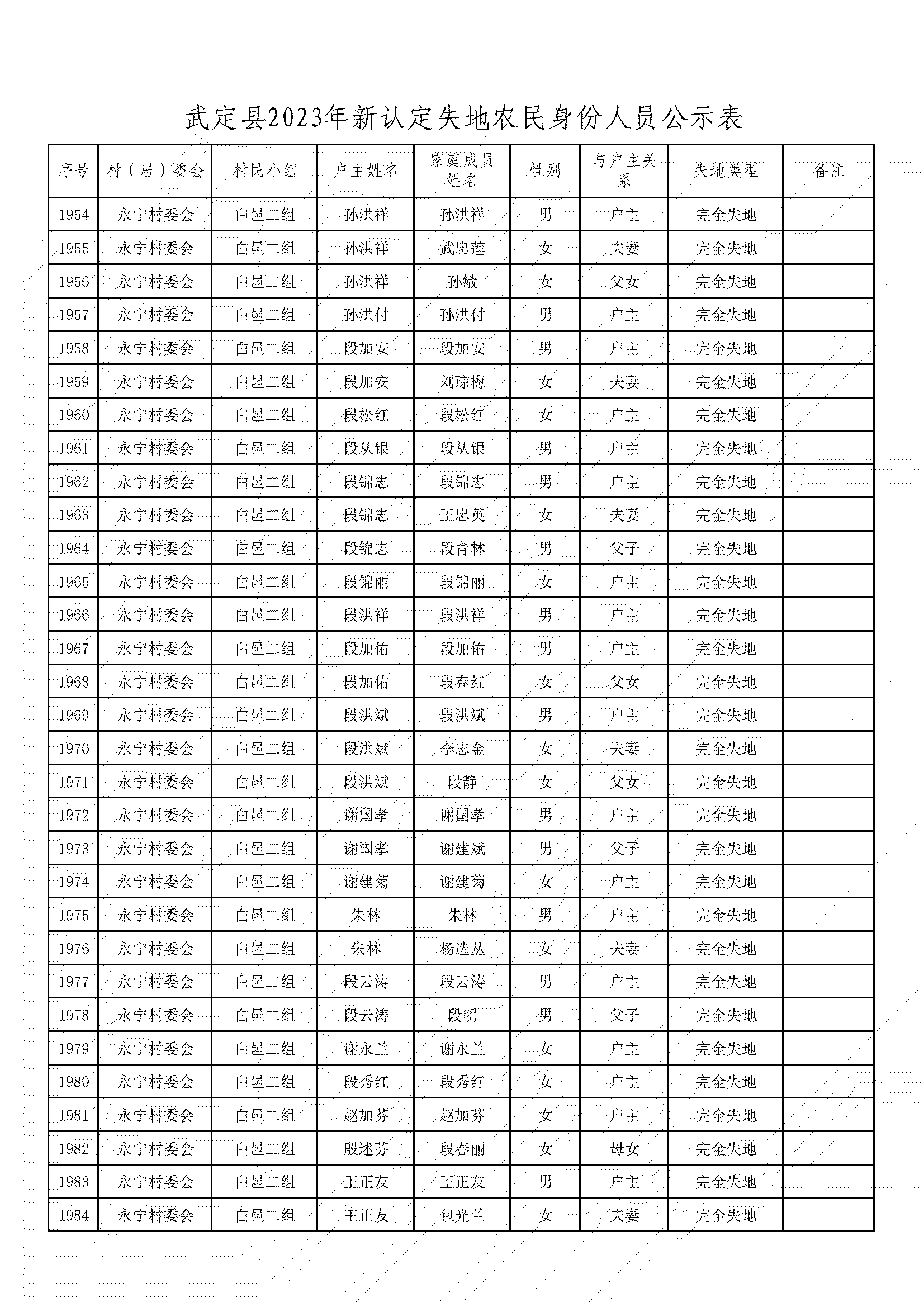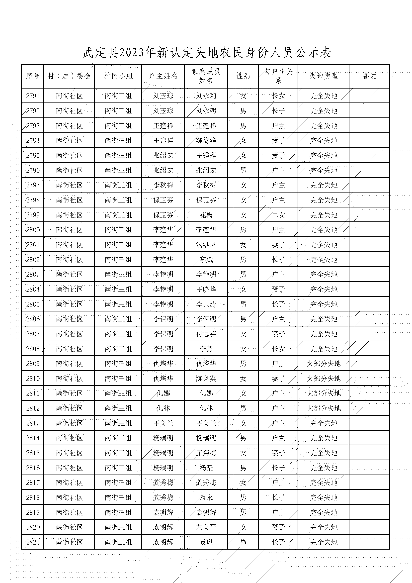 根据《武定县人民政府办公室印发武定县改革完善被征地农民基本养老保障工作实施办法的通知》(武政办发〔2020〕6号)文件精神,经村(居)委会、狮山镇、县公安局、县自然资源局、县农业农村局、县人社局对被征地农民土地征收、户籍人口、参加基本养老保险等情况进行审核,现将2023年符合认定为被征地农民身份的人员予以公示,接受社会监督。公示期从2023年12月18日至2023年12月22日,共5天。公示期间,如对公示对象有异议,请向武定县人力资源和社会保障局社会保险中心反映。