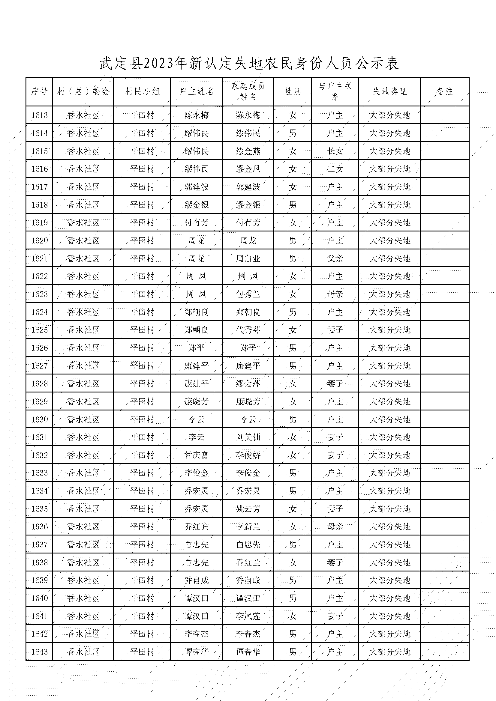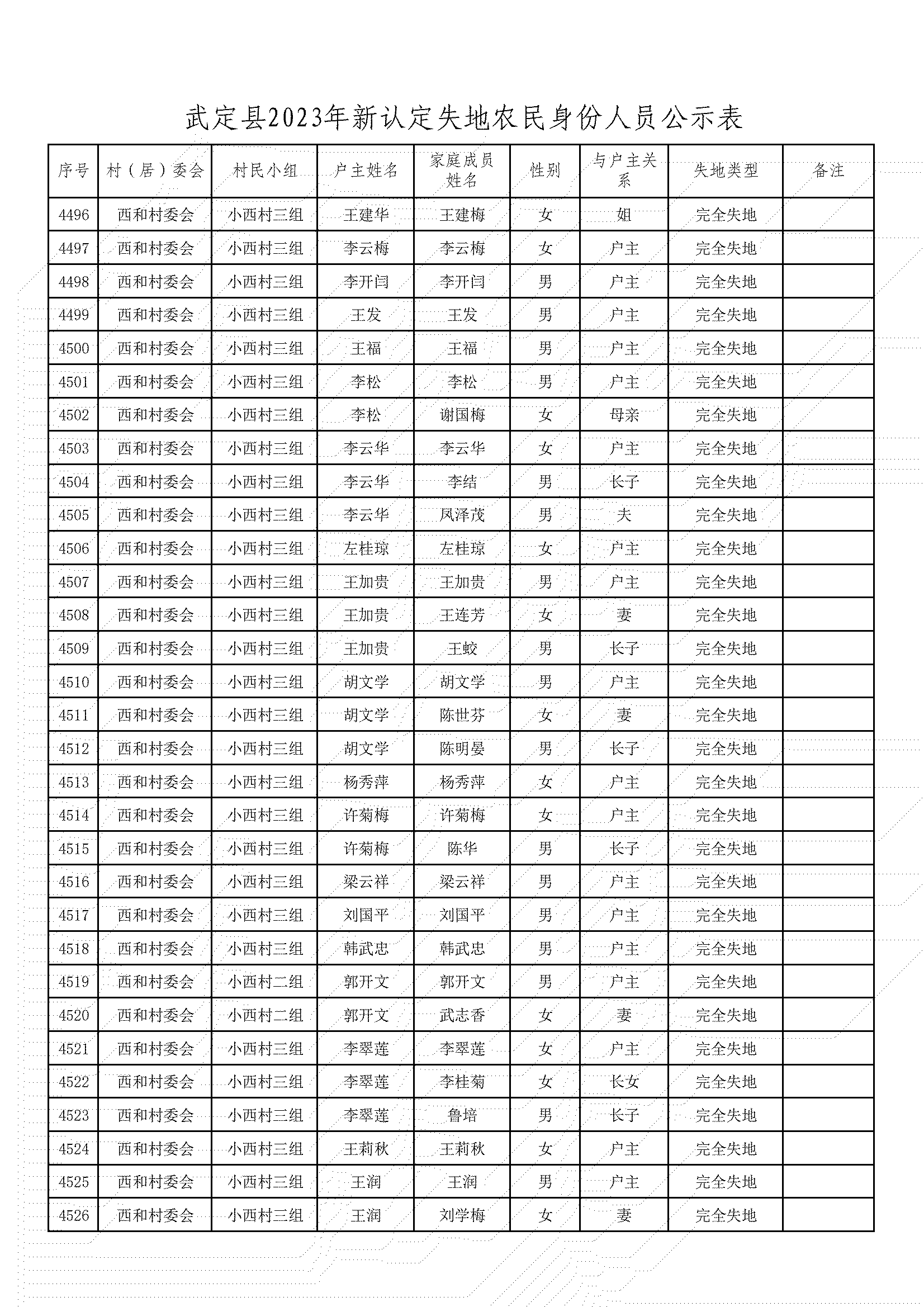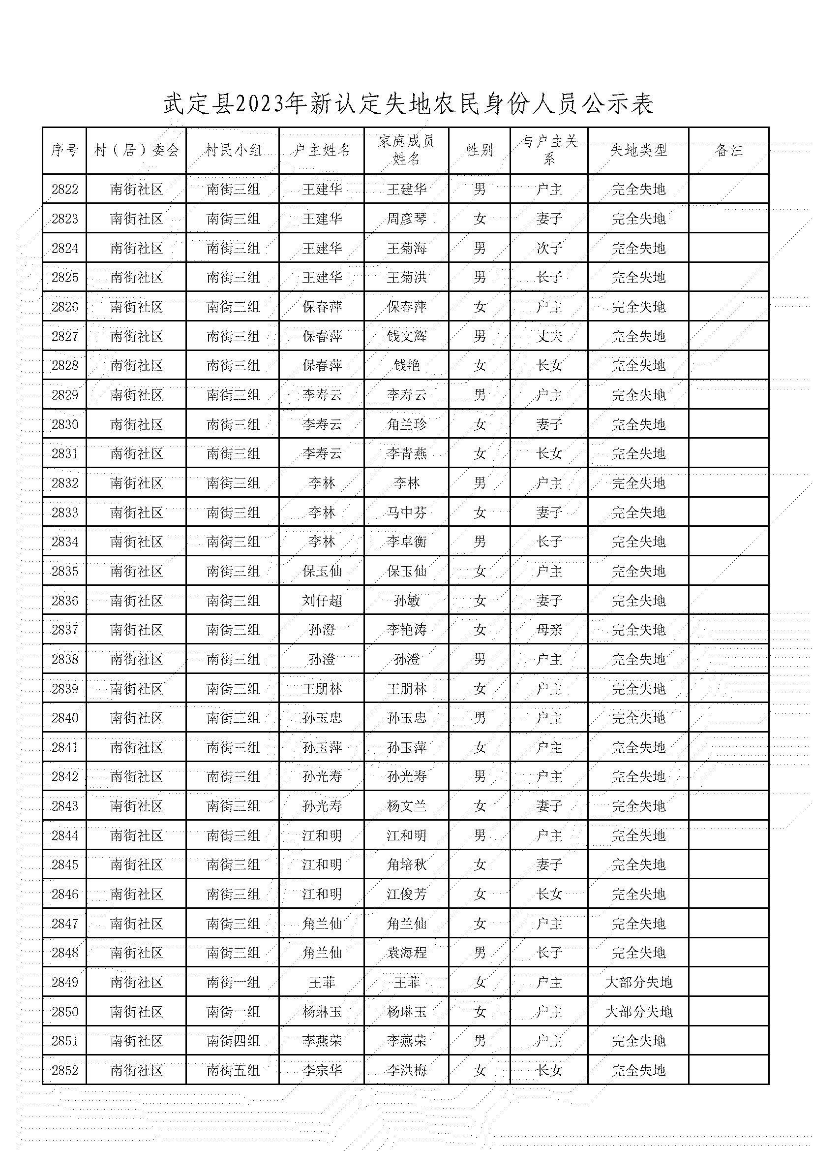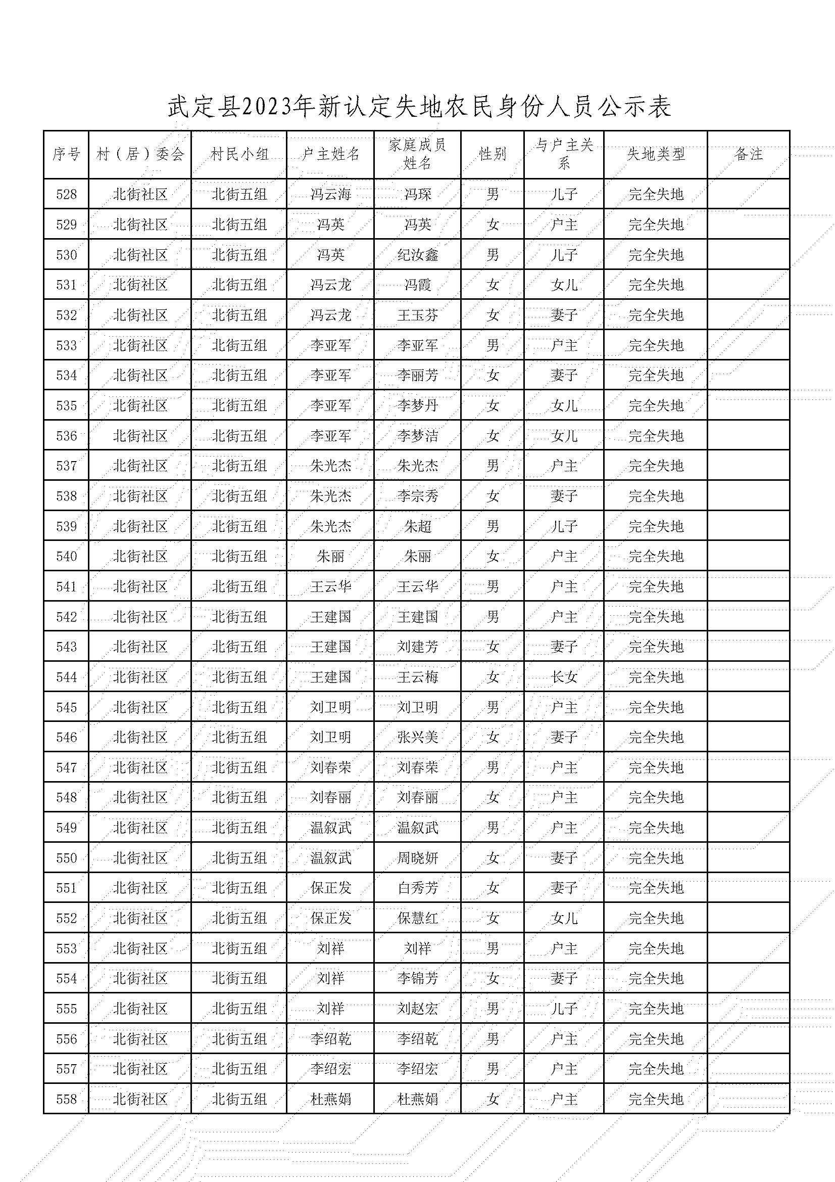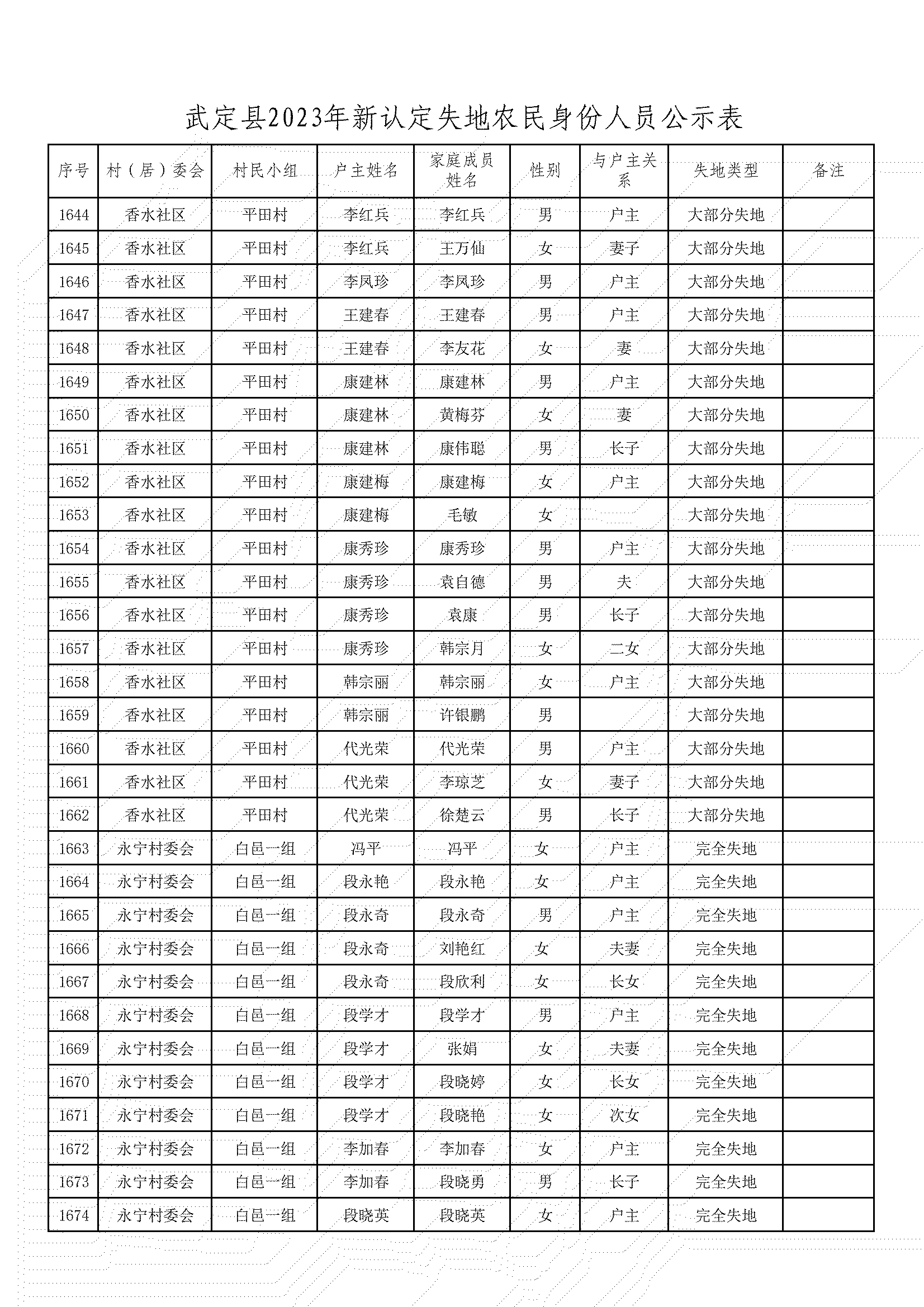 根据《武定县人民政府办公室印发武定县改革完善被征地农民基本养老保障工作实施办法的通知》(武政办发〔2020〕6号)文件精神,经村(居)委会、狮山镇、县公安局、县自然资源局、县农业农村局、县人社局对被征地农民土地征收、户籍人口、参加基本养老保险等情况进行审核,现将2023年符合认定为被征地农民身份的人员予以公示,接受社会监督。公示期从2023年12月18日至2023年12月22日,共5天。公示期间,如对公示对象有异议,请向武定县人力资源和社会保障局社会保险中心反映。
