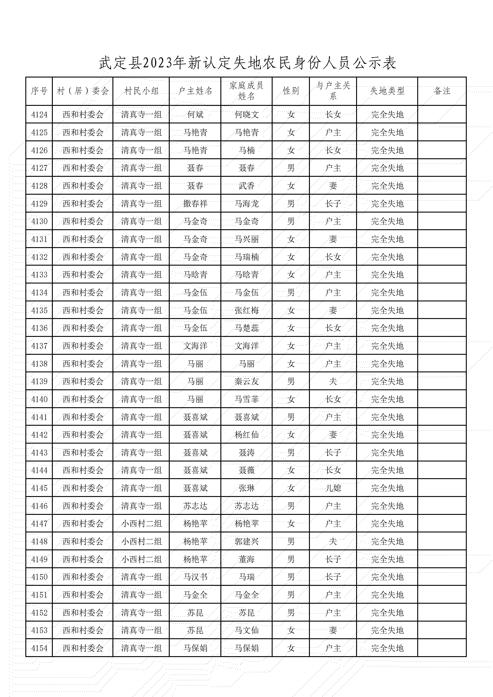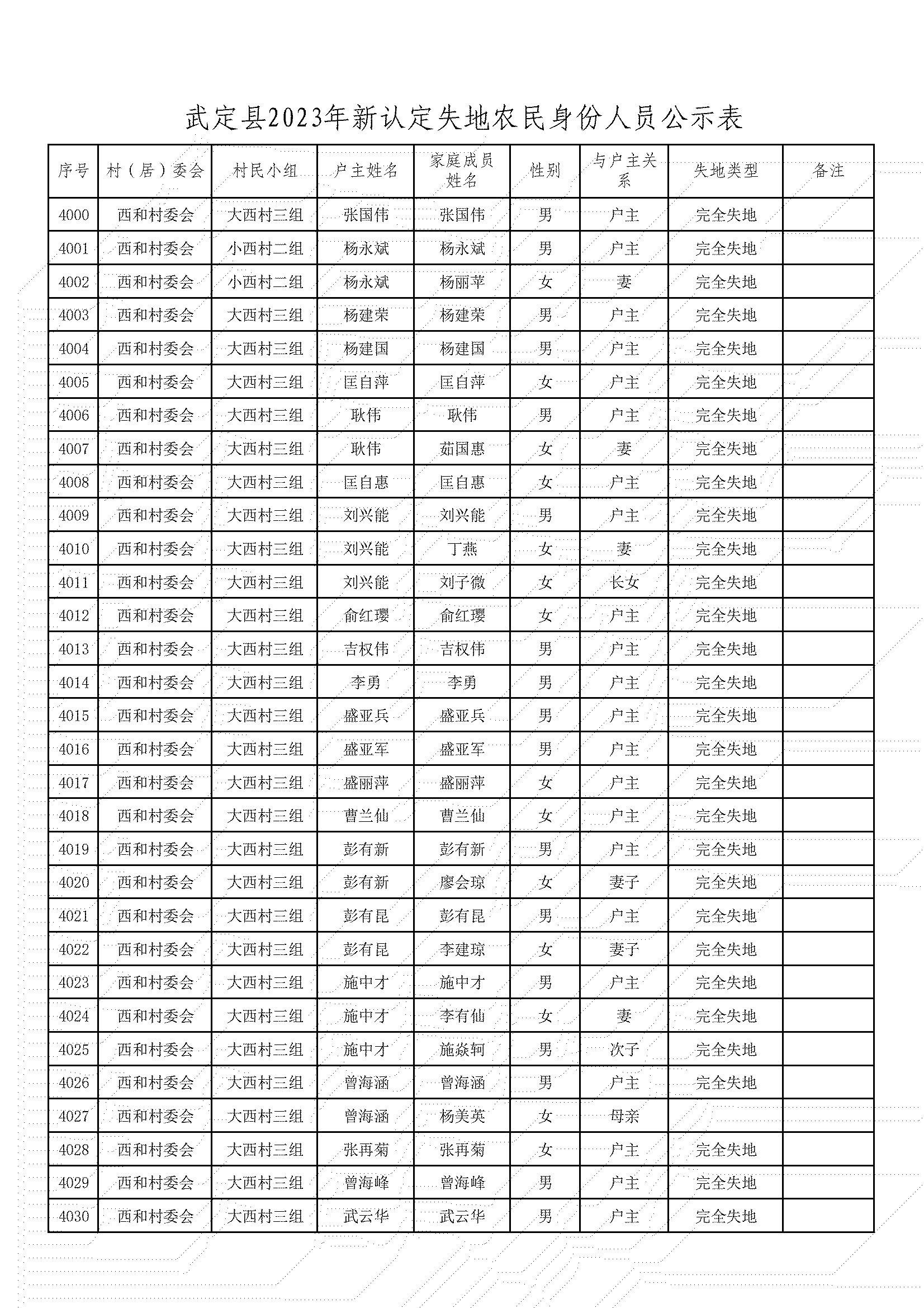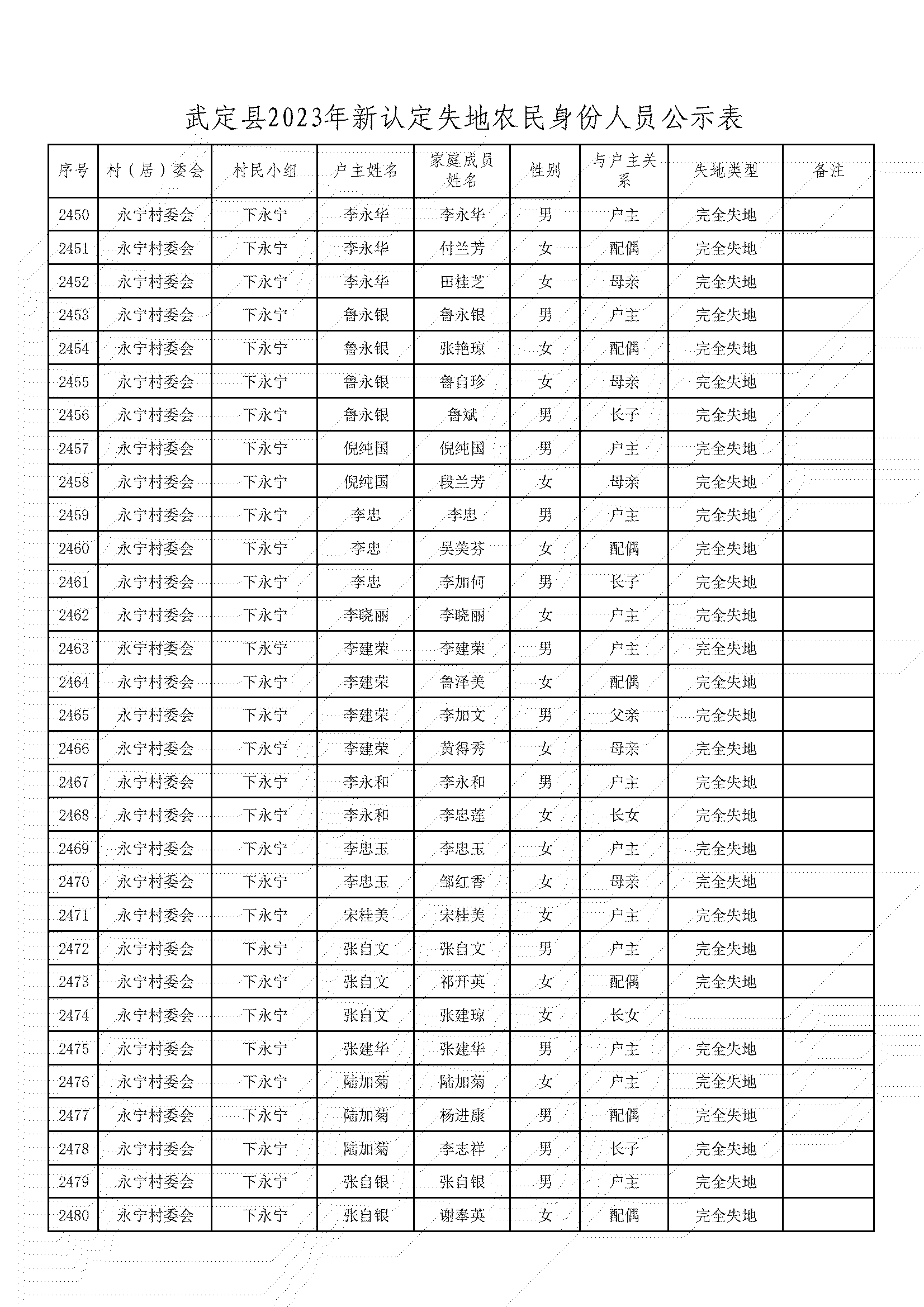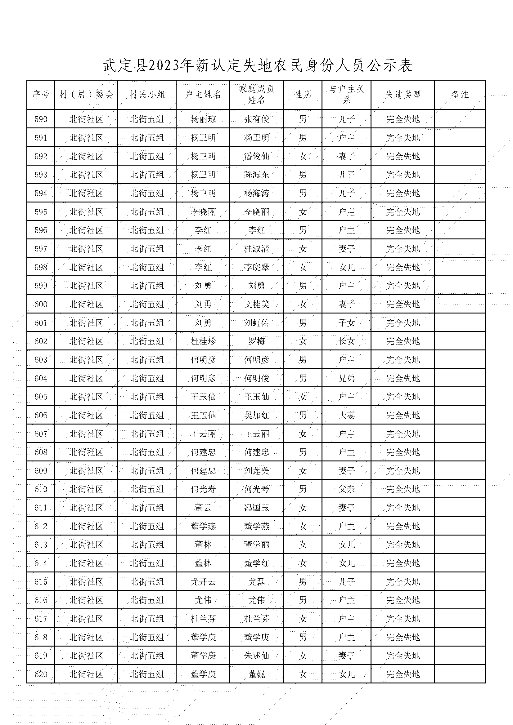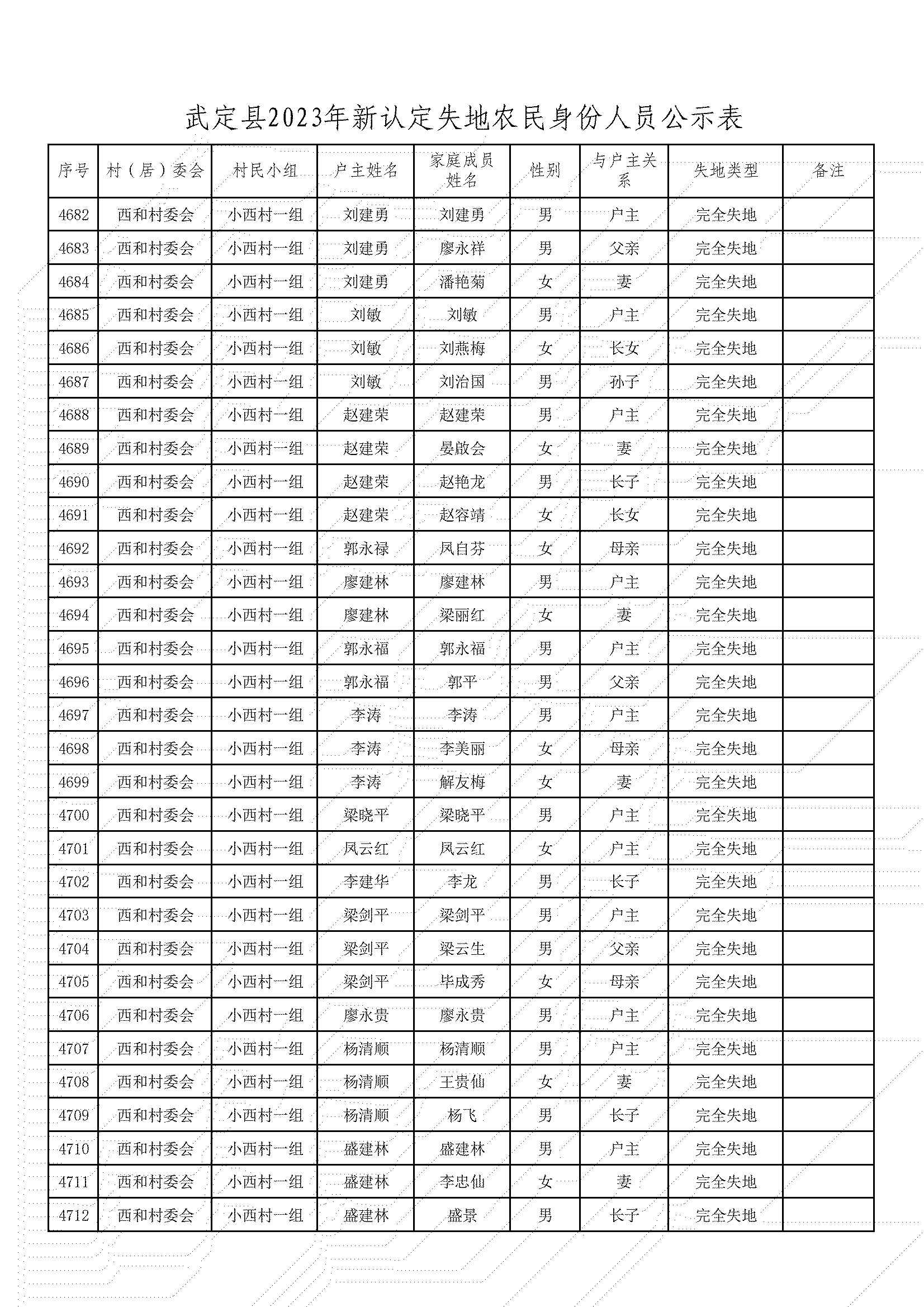 根据《武定县人民政府办公室印发武定县改革完善被征地农民基本养老保障工作实施办法的通知》(武政办发〔2020〕6号)文件精神,经村(居)委会、狮山镇、县公安局、县自然资源局、县农业农村局、县人社局对被征地农民土地征收、户籍人口、参加基本养老保险等情况进行审核,现将2023年符合认定为被征地农民身份的人员予以公示,接受社会监督。公示期从2023年12月18日至2023年12月22日,共5天。公示期间,如对公示对象有异议,请向武定县人力资源和社会保障局社会保险中心反映。