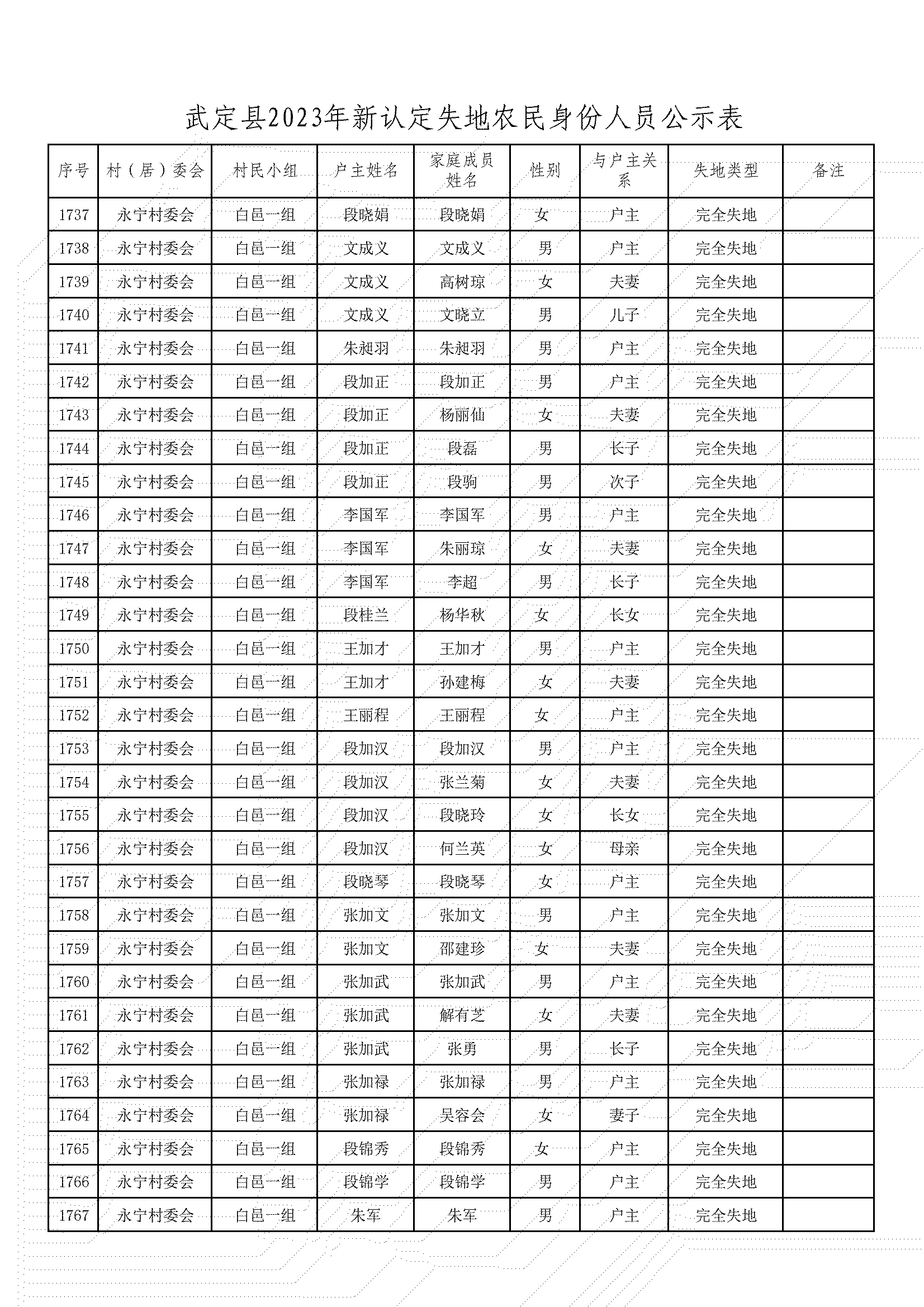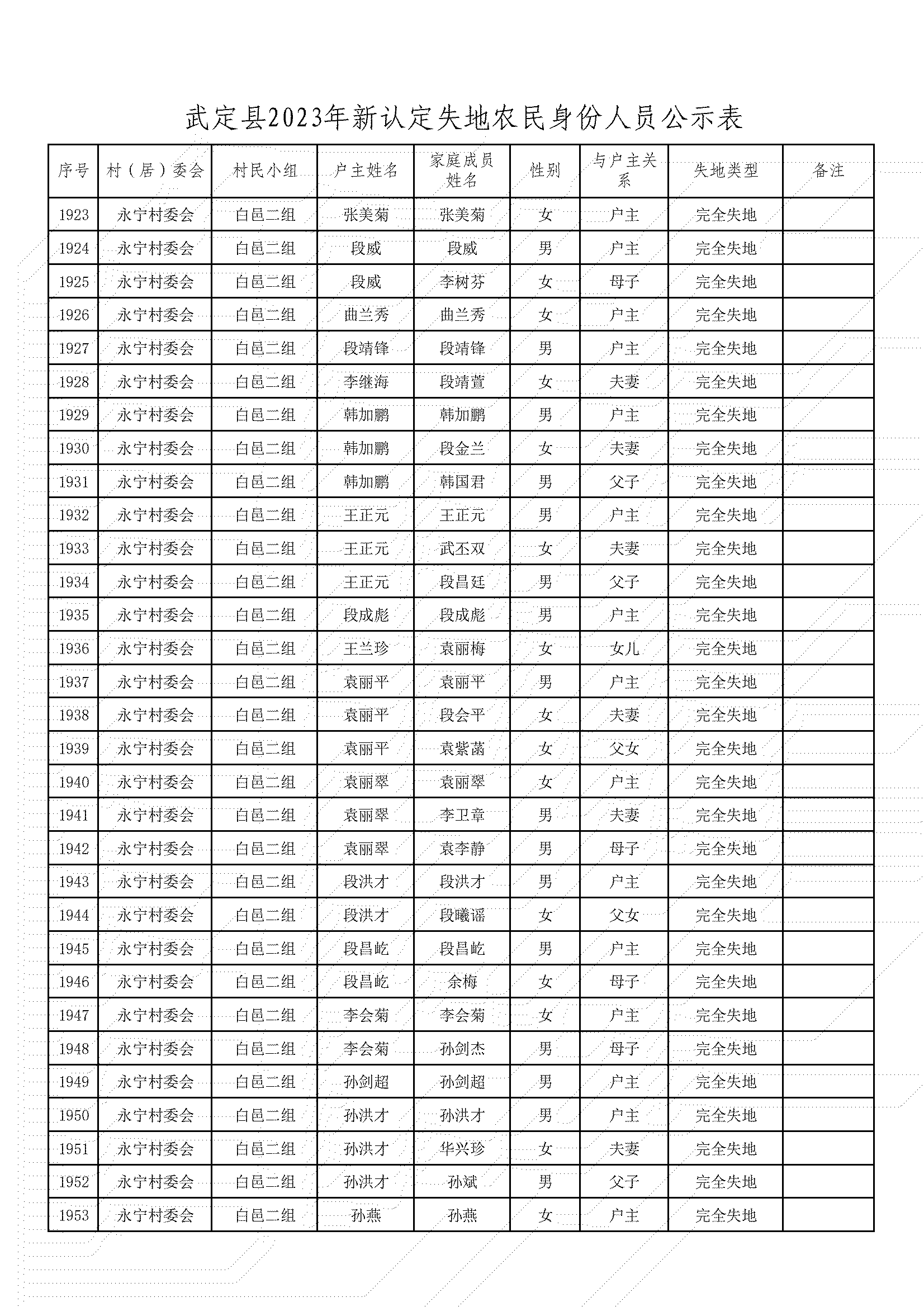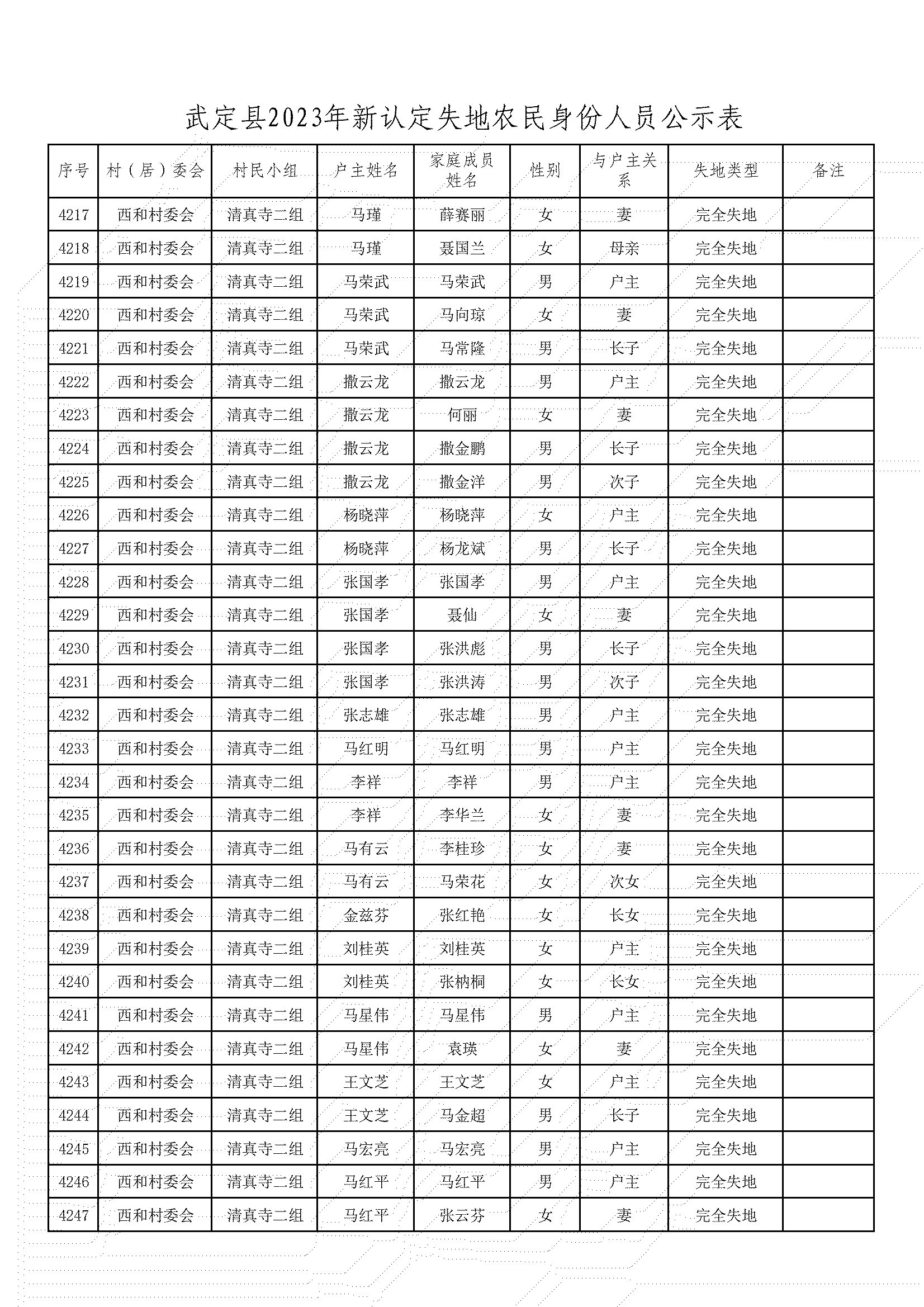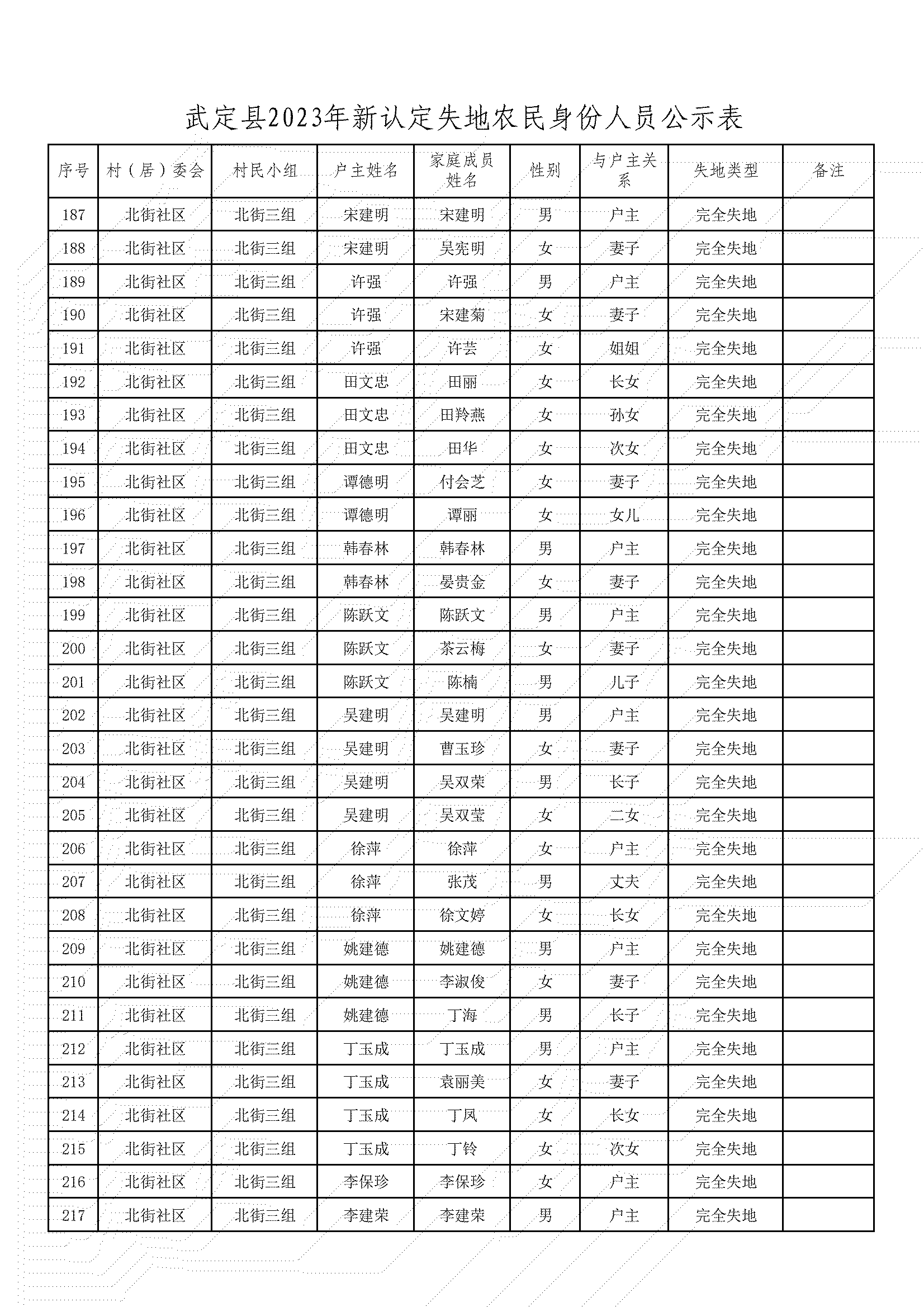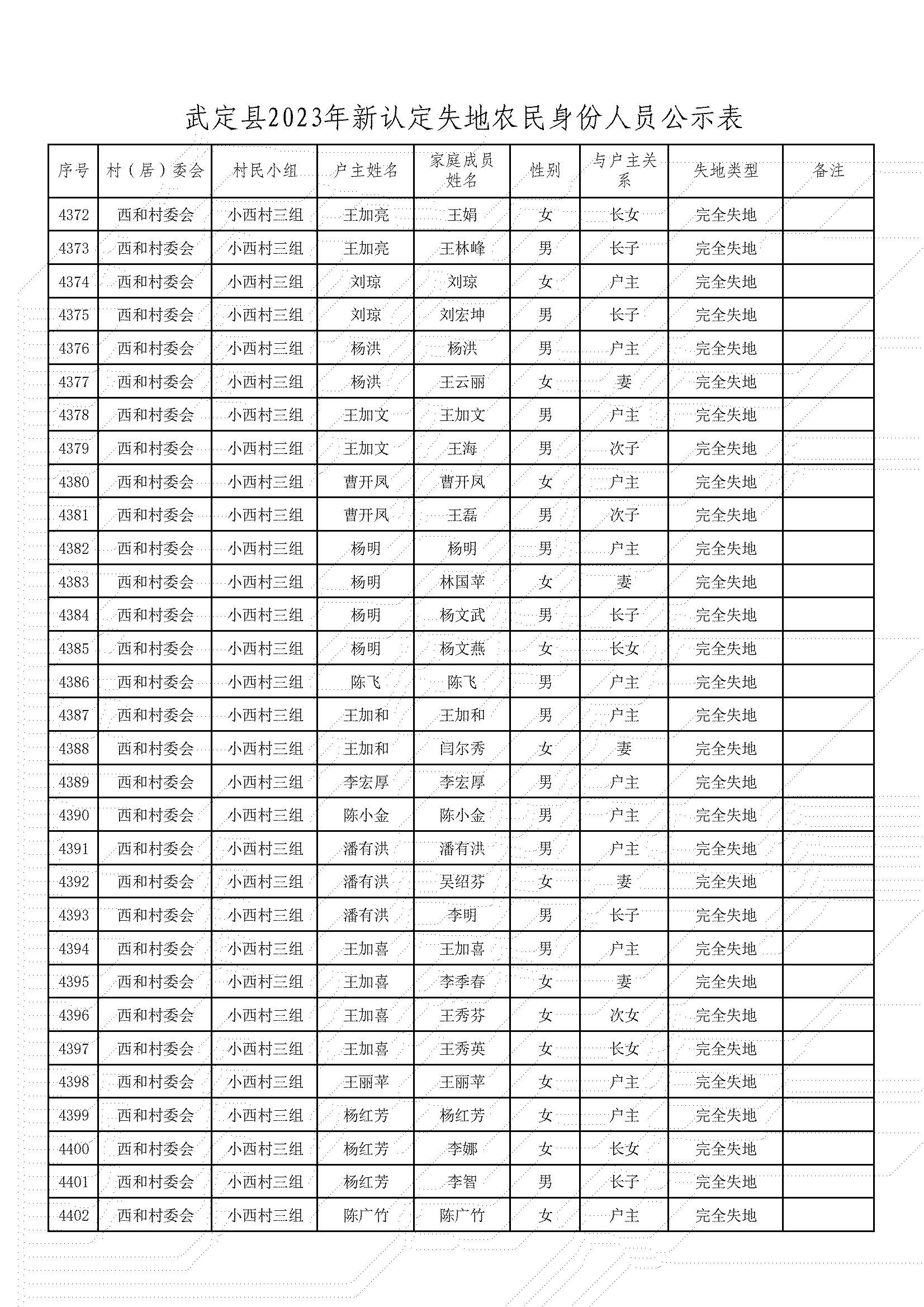 根据《武定县人民政府办公室印发武定县改革完善被征地农民基本养老保障工作实施办法的通知》(武政办发〔2020〕6号)文件精神,经村(居)委会、狮山镇、县公安局、县自然资源局、县农业农村局、县人社局对被征地农民土地征收、户籍人口、参加基本养老保险等情况进行审核,现将2023年符合认定为被征地农民身份的人员予以公示,接受社会监督。公示期从2023年12月18日至2023年12月22日,共5天。公示期间,如对公示对象有异议,请向武定县人力资源和社会保障局社会保险中心反映。