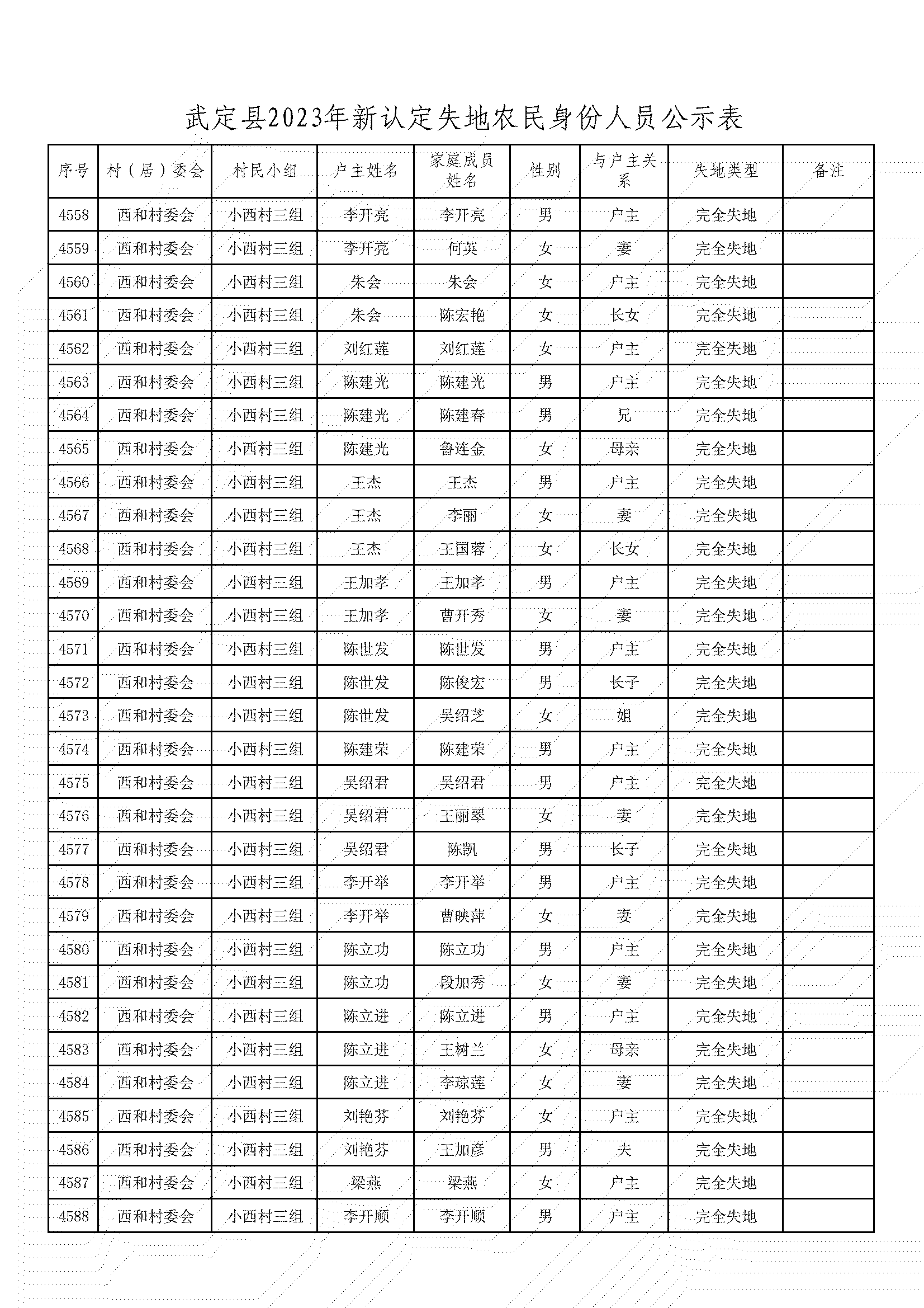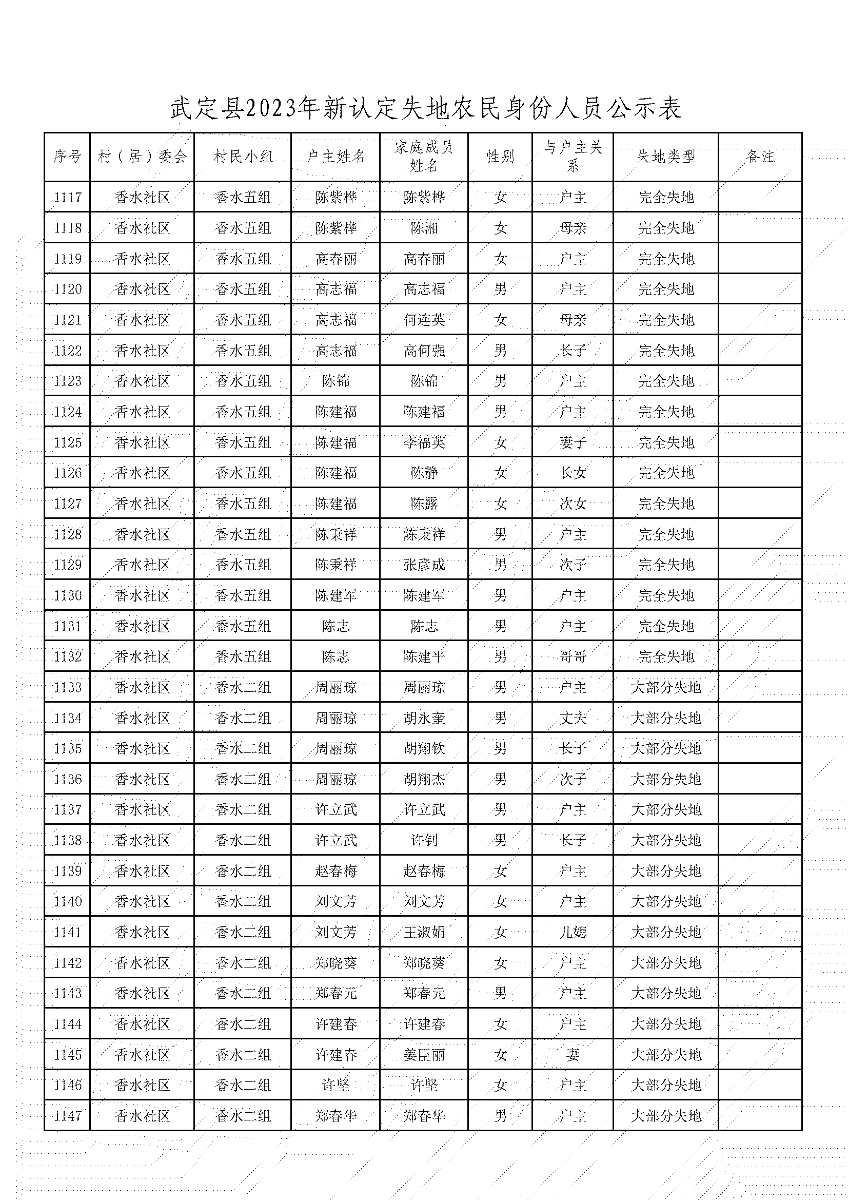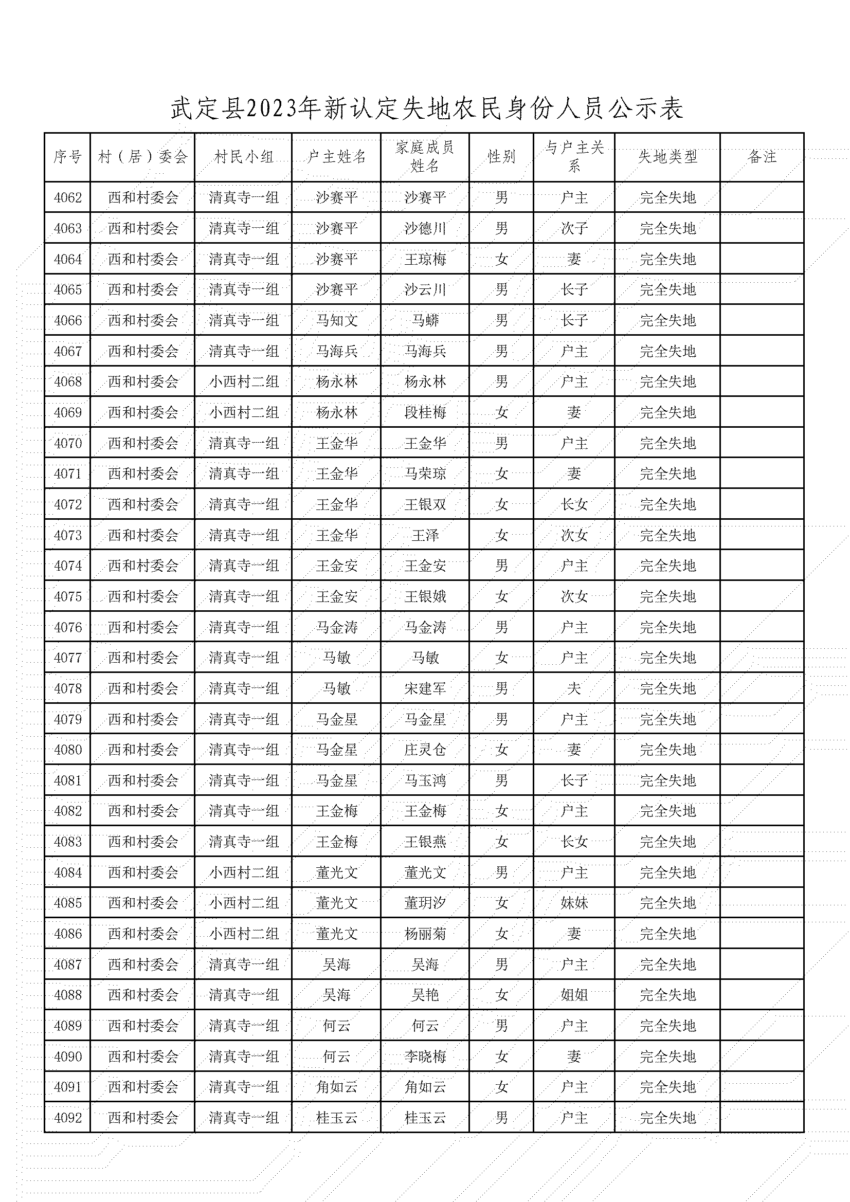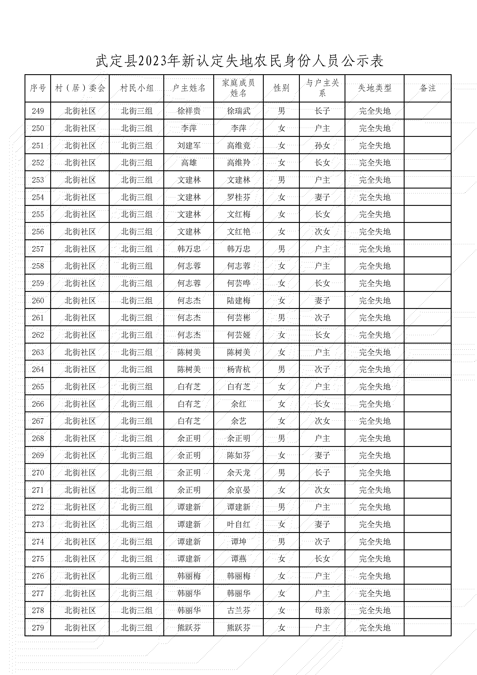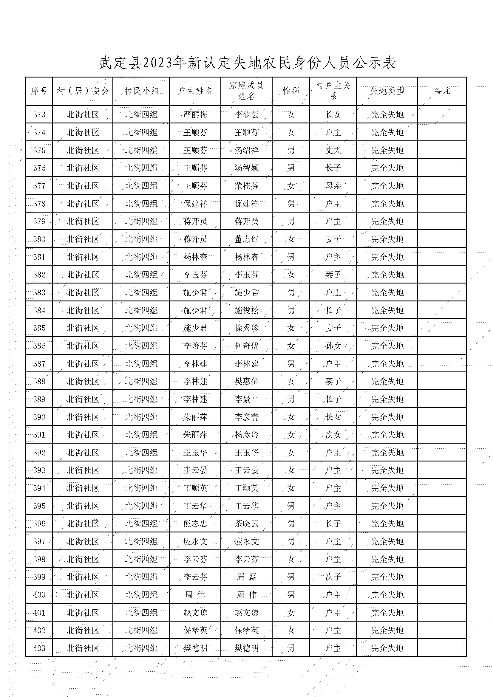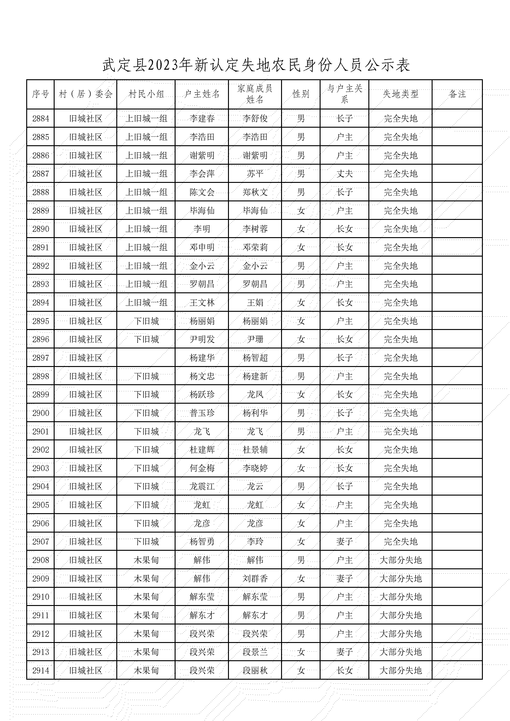 根据《武定县人民政府办公室印发武定县改革完善被征地农民基本养老保障工作实施办法的通知》(武政办发〔2020〕6号)文件精神,经村(居)委会、狮山镇、县公安局、县自然资源局、县农业农村局、县人社局对被征地农民土地征收、户籍人口、参加基本养老保险等情况进行审核,现将2023年符合认定为被征地农民身份的人员予以公示,接受社会监督。公示期从2023年12月18日至2023年12月22日,共5天。公示期间,如对公示对象有异议,请向武定县人力资源和社会保障局社会保险中心反映。