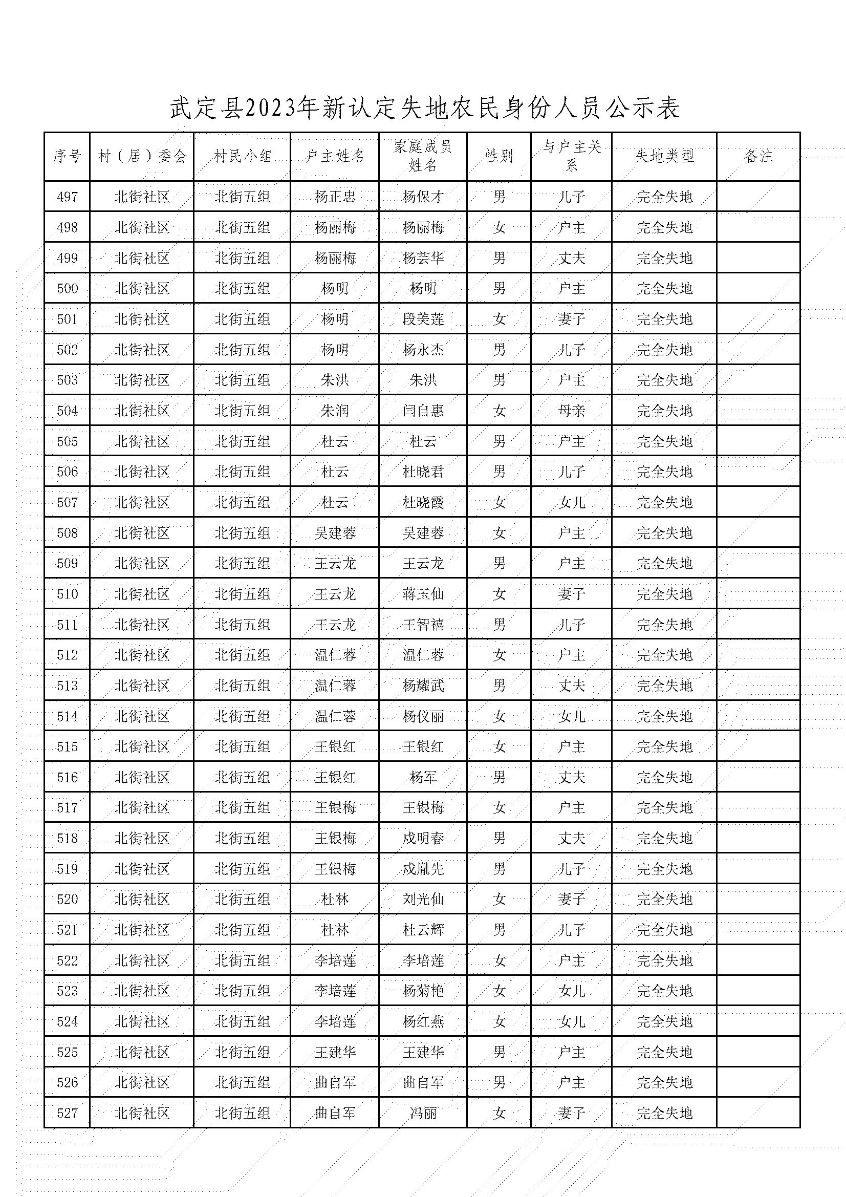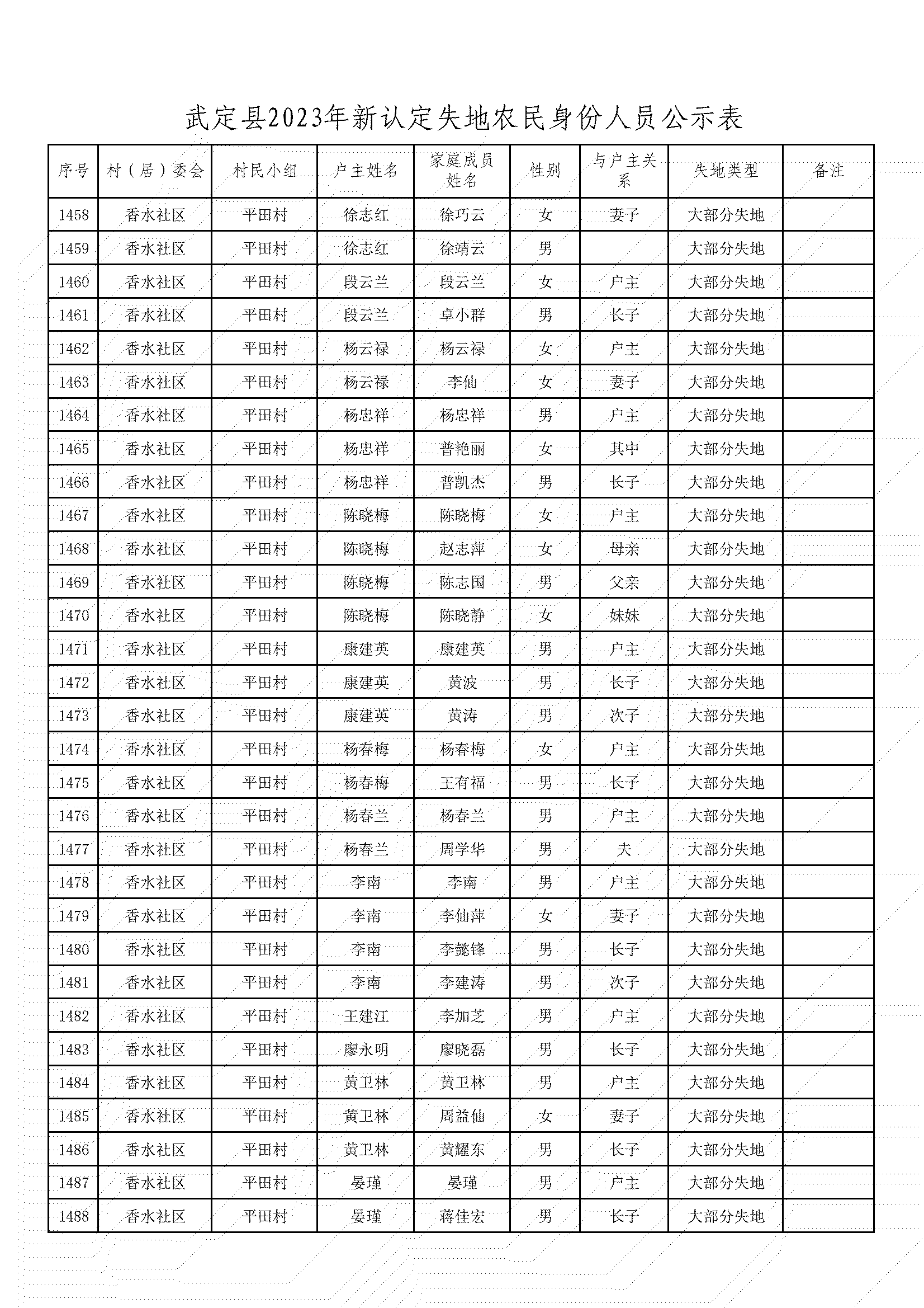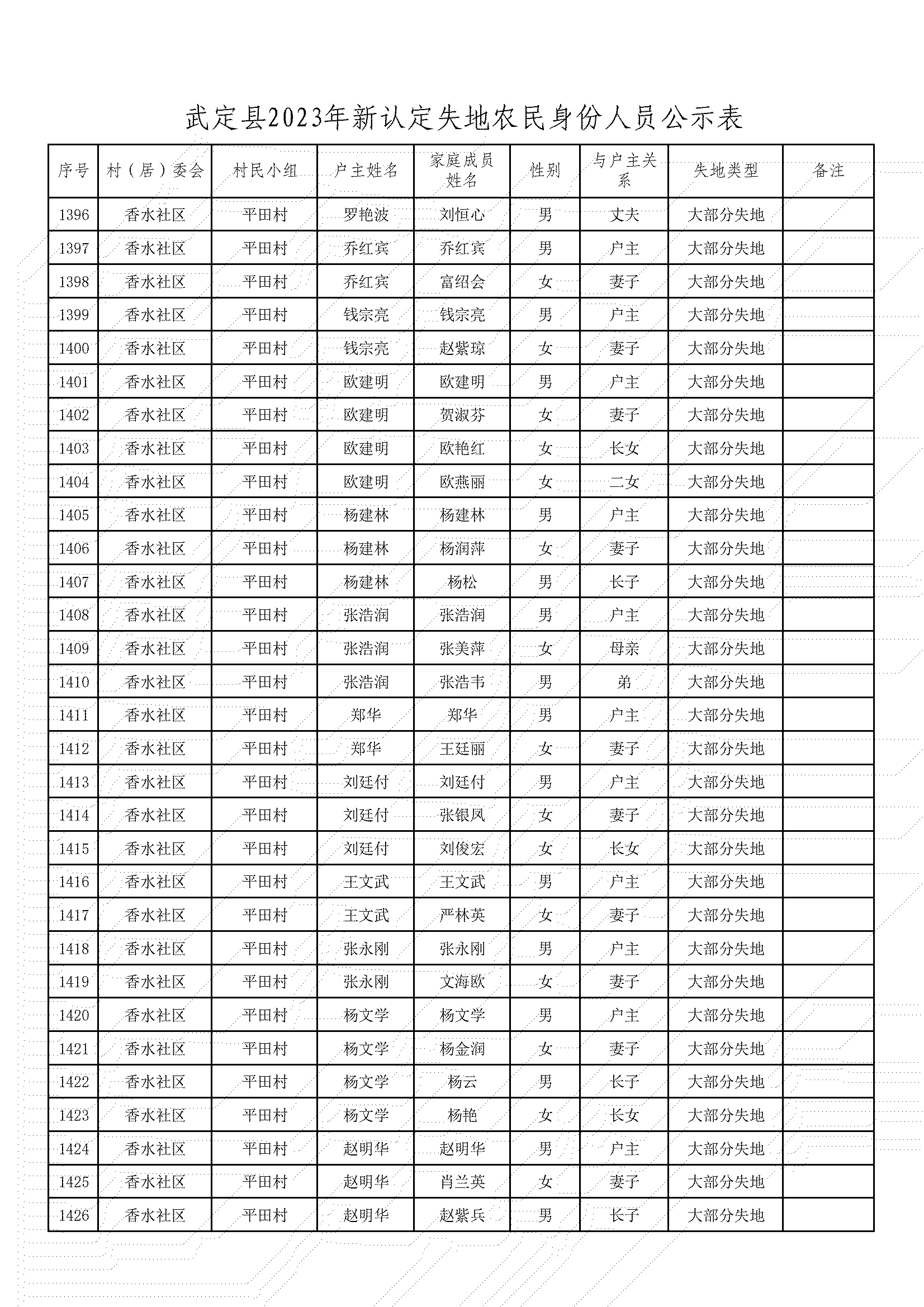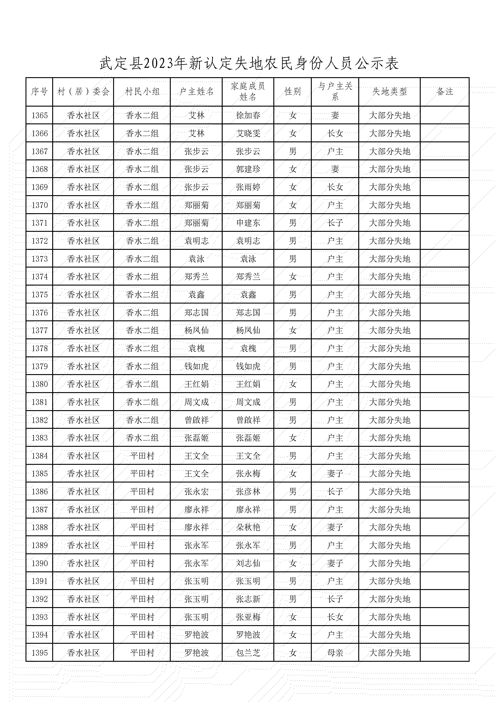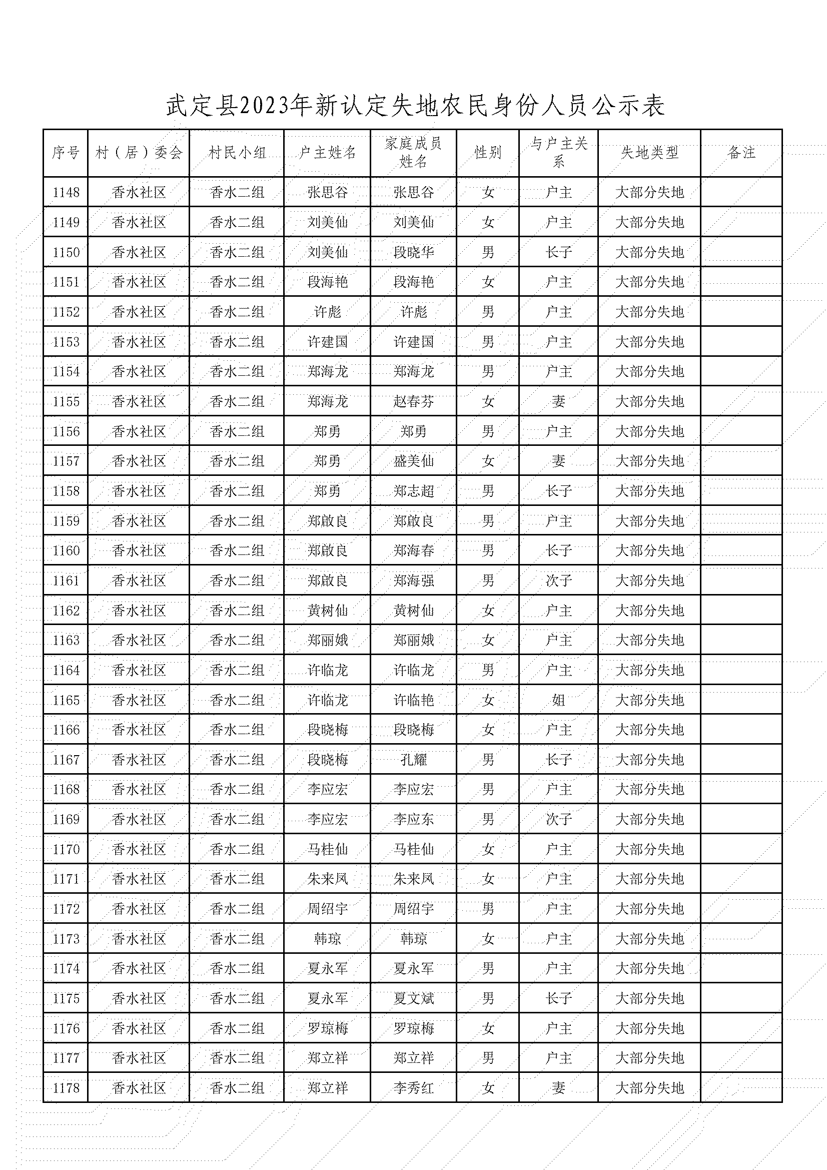 根据《武定县人民政府办公室印发武定县改革完善被征地农民基本养老保障工作实施办法的通知》(武政办发〔2020〕6号)文件精神,经村(居)委会、狮山镇、县公安局、县自然资源局、县农业农村局、县人社局对被征地农民土地征收、户籍人口、参加基本养老保险等情况进行审核,现将2023年符合认定为被征地农民身份的人员予以公示,接受社会监督。公示期从2023年12月18日至2023年12月22日,共5天。公示期间,如对公示对象有异议,请向武定县人力资源和社会保障局社会保险中心反映。