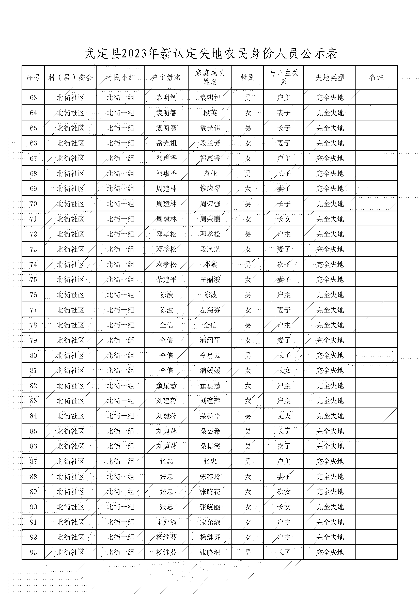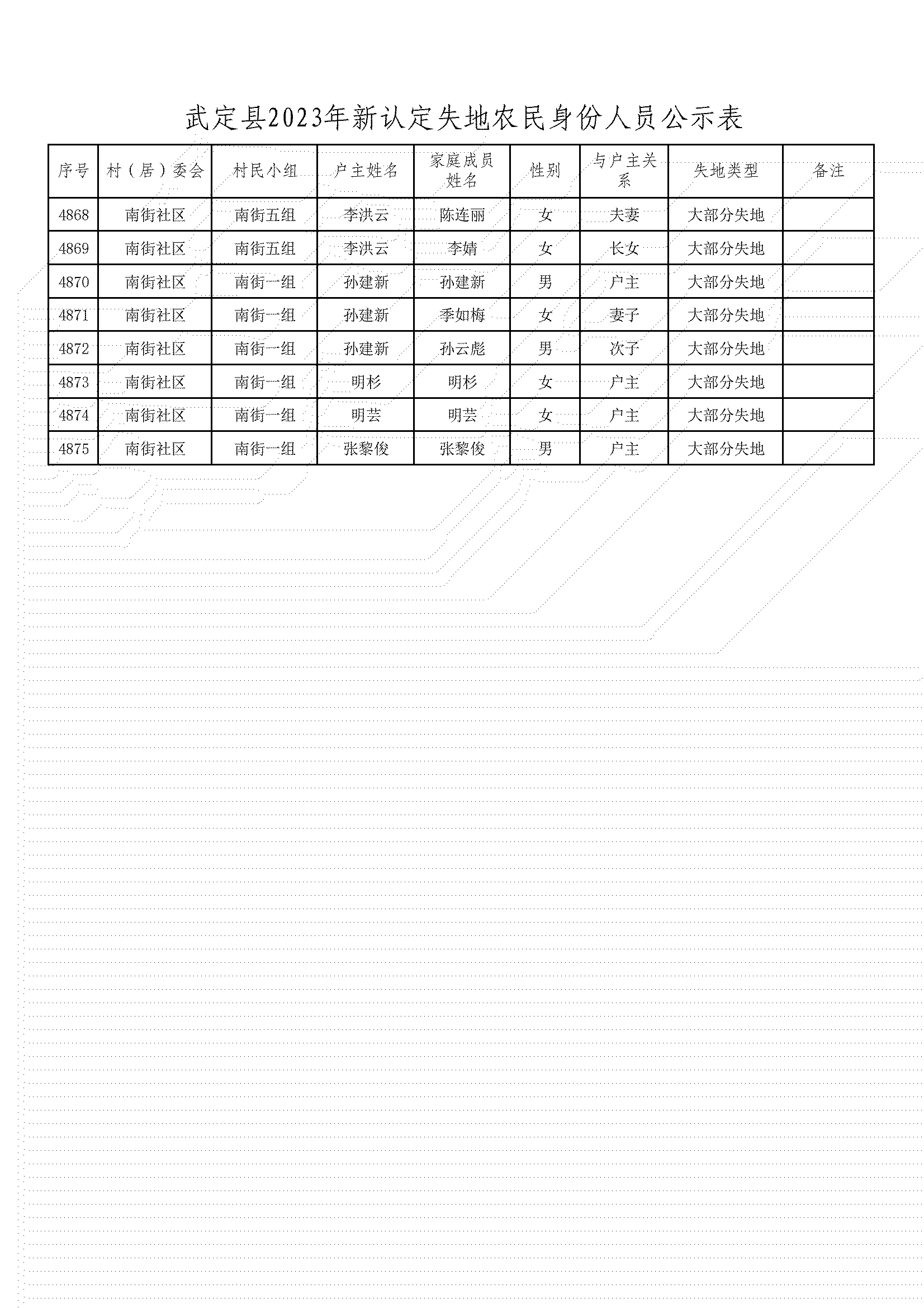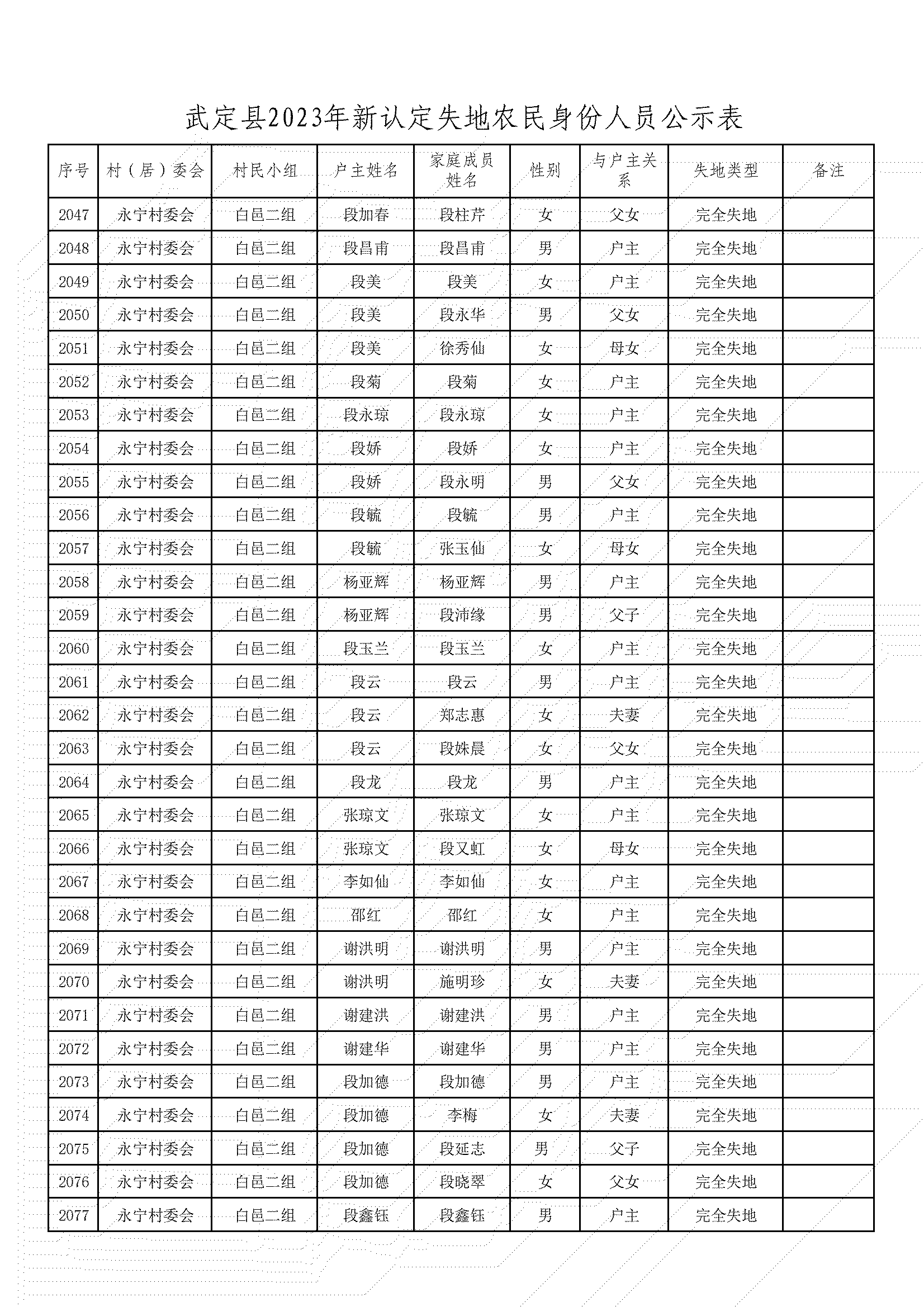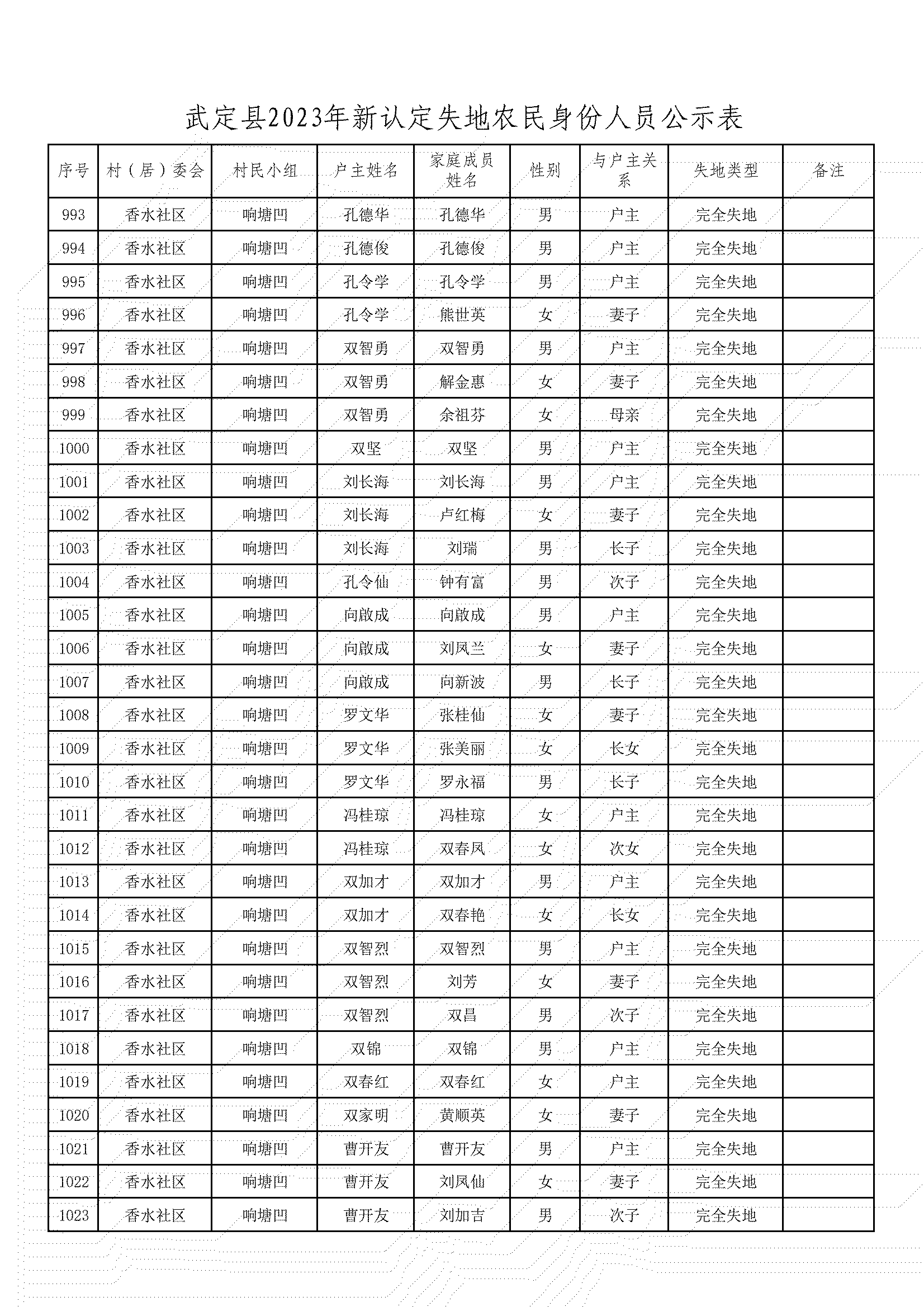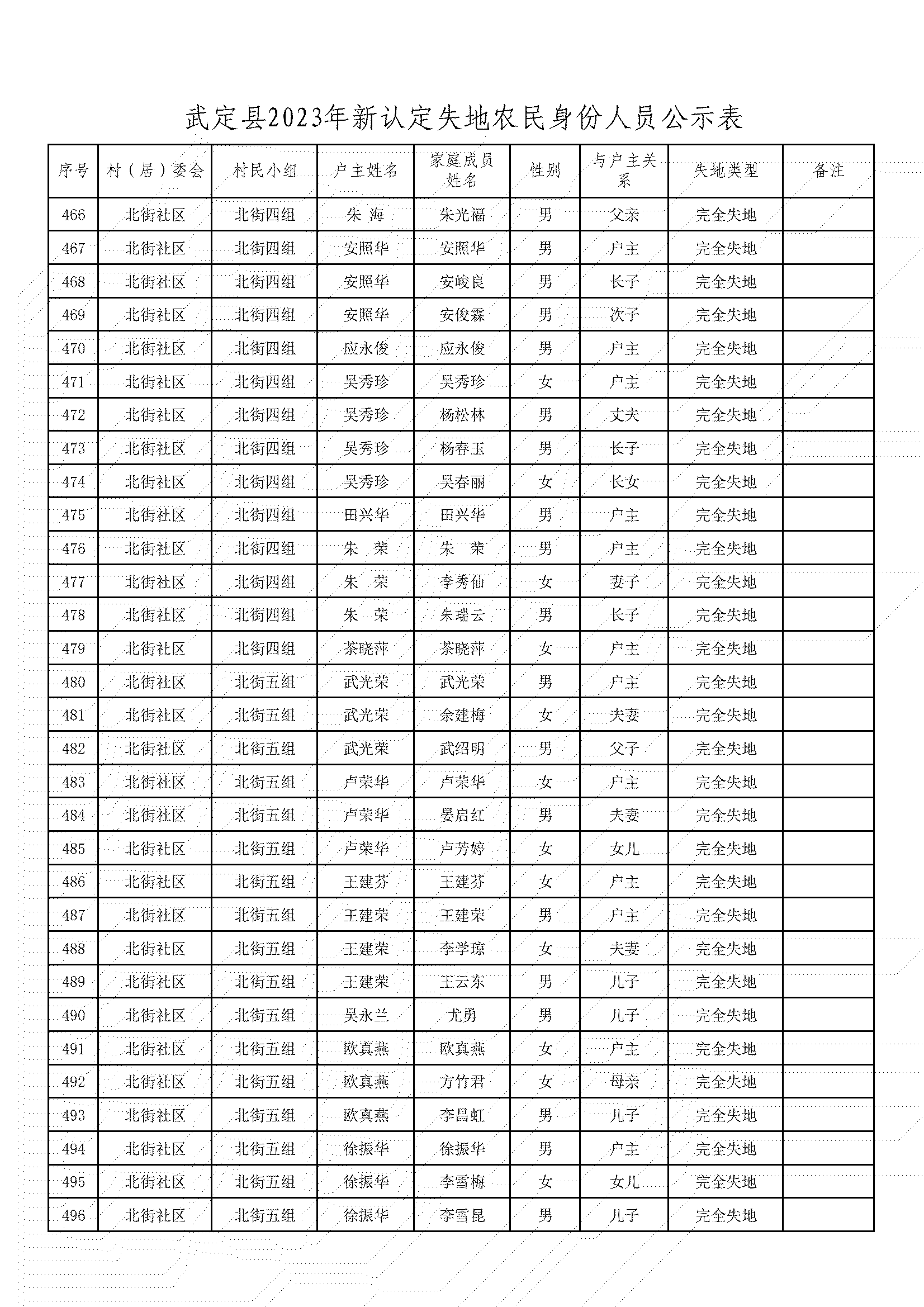 根据《武定县人民政府办公室印发武定县改革完善被征地农民基本养老保障工作实施办法的通知》(武政办发〔2020〕6号)文件精神,经村(居)委会、狮山镇、县公安局、县自然资源局、县农业农村局、县人社局对被征地农民土地征收、户籍人口、参加基本养老保险等情况进行审核,现将2023年符合认定为被征地农民身份的人员予以公示,接受社会监督。公示期从2023年12月18日至2023年12月22日,共5天。公示期间,如对公示对象有异议,请向武定县人力资源和社会保障局社会保险中心反映。