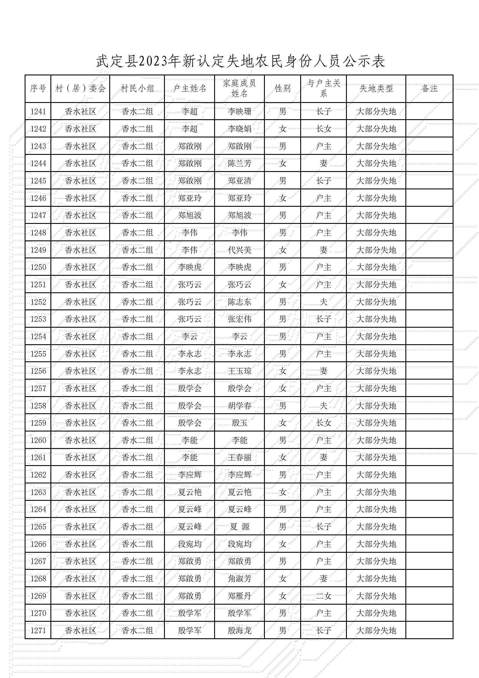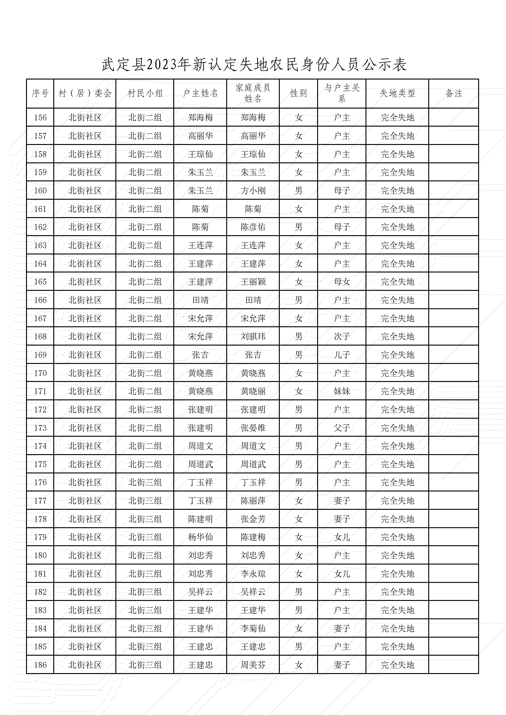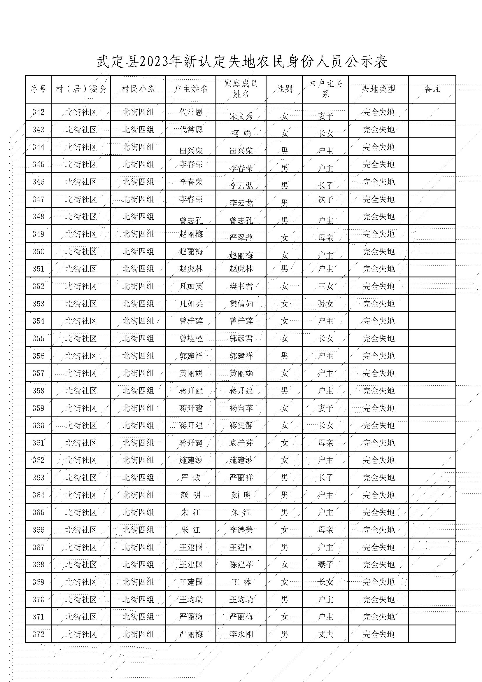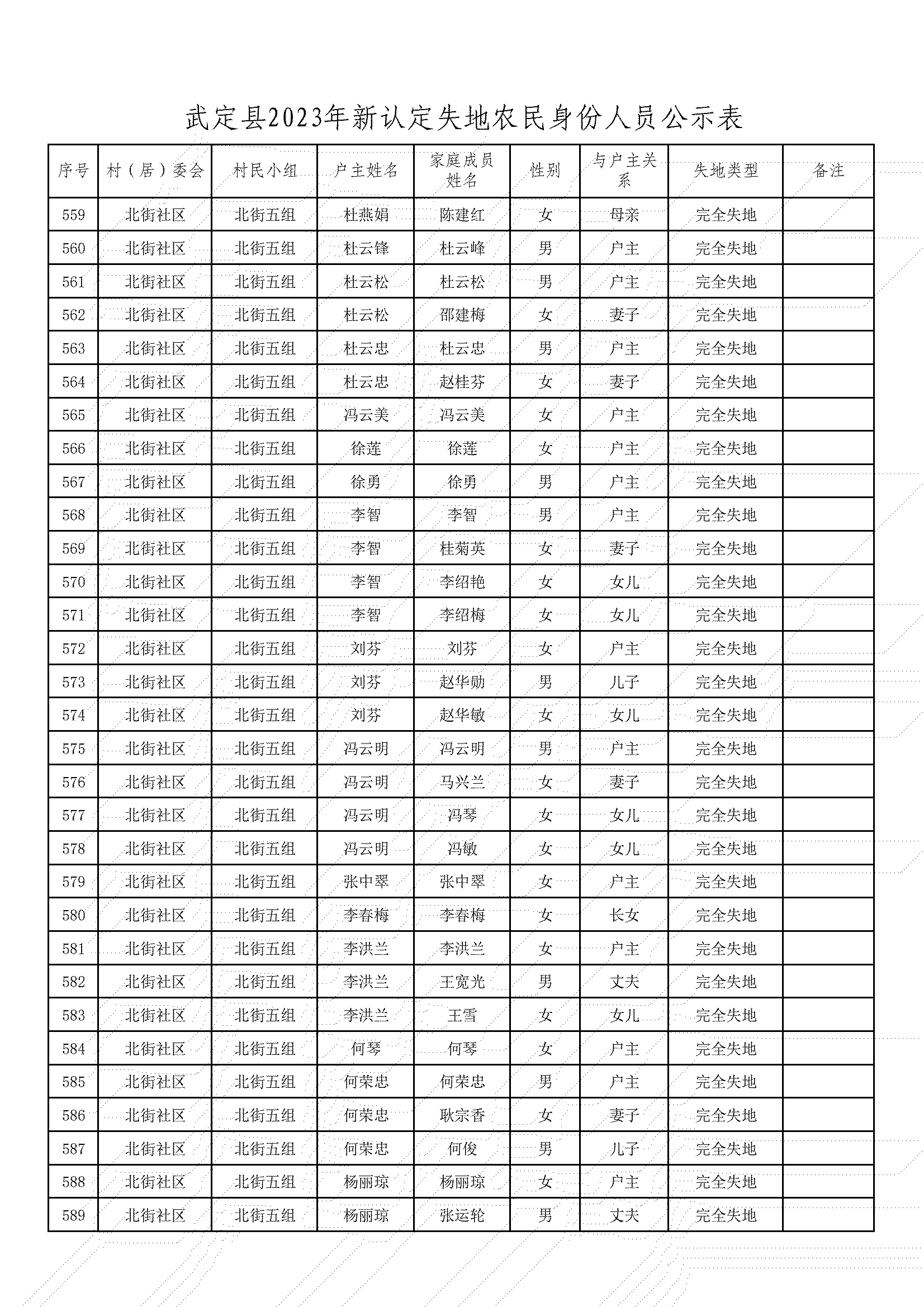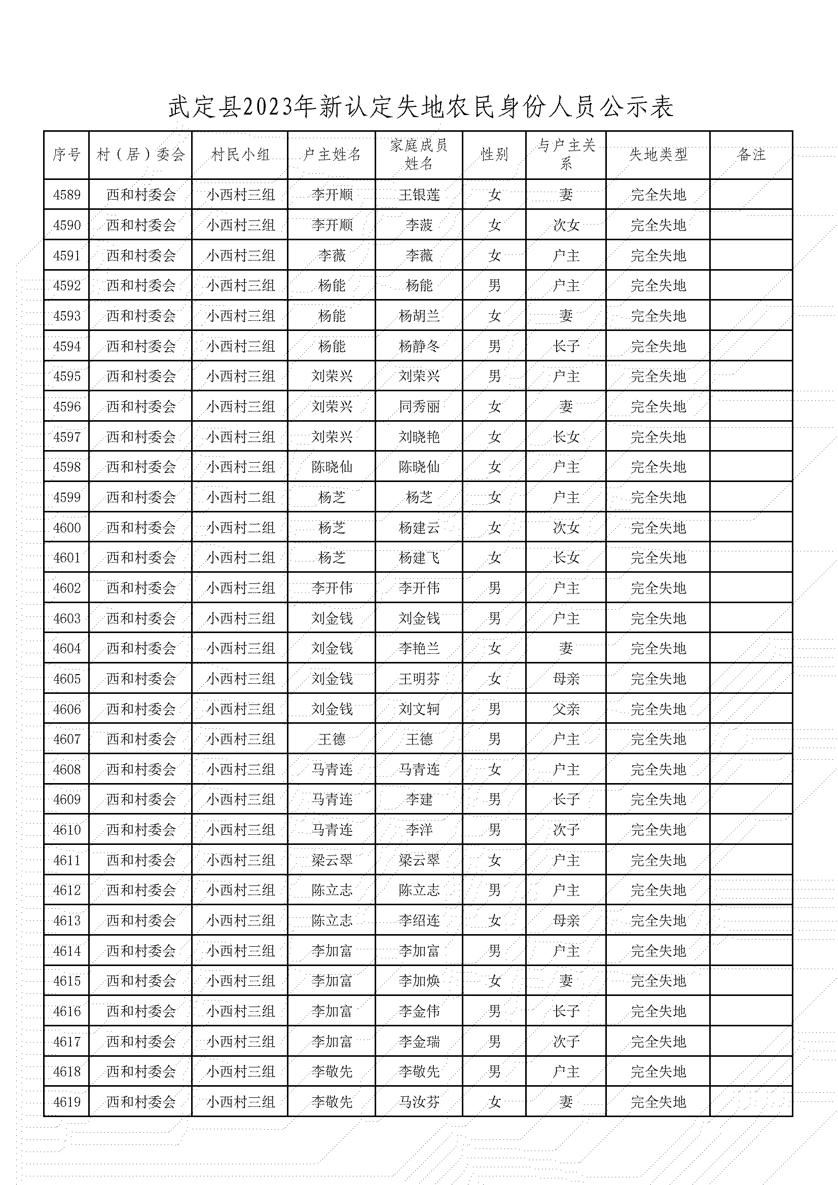 根据《武定县人民政府办公室印发武定县改革完善被征地农民基本养老保障工作实施办法的通知》(武政办发〔2020〕6号)文件精神,经村(居)委会、狮山镇、县公安局、县自然资源局、县农业农村局、县人社局对被征地农民土地征收、户籍人口、参加基本养老保险等情况进行审核,现将2023年符合认定为被征地农民身份的人员予以公示,接受社会监督。公示期从2023年12月18日至2023年12月22日,共5天。公示期间,如对公示对象有异议,请向武定县人力资源和社会保障局社会保险中心反映。