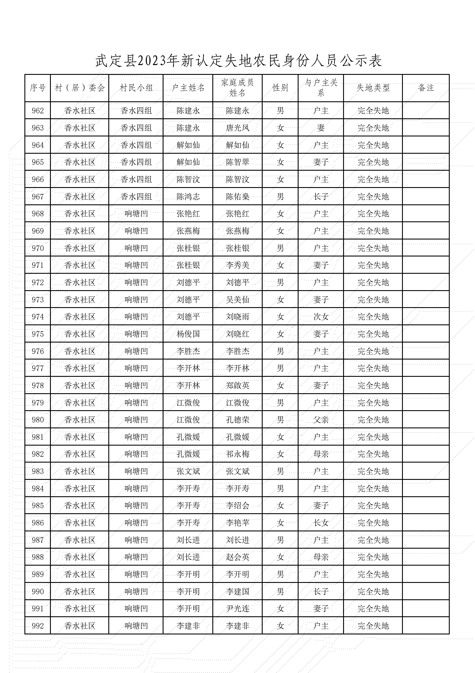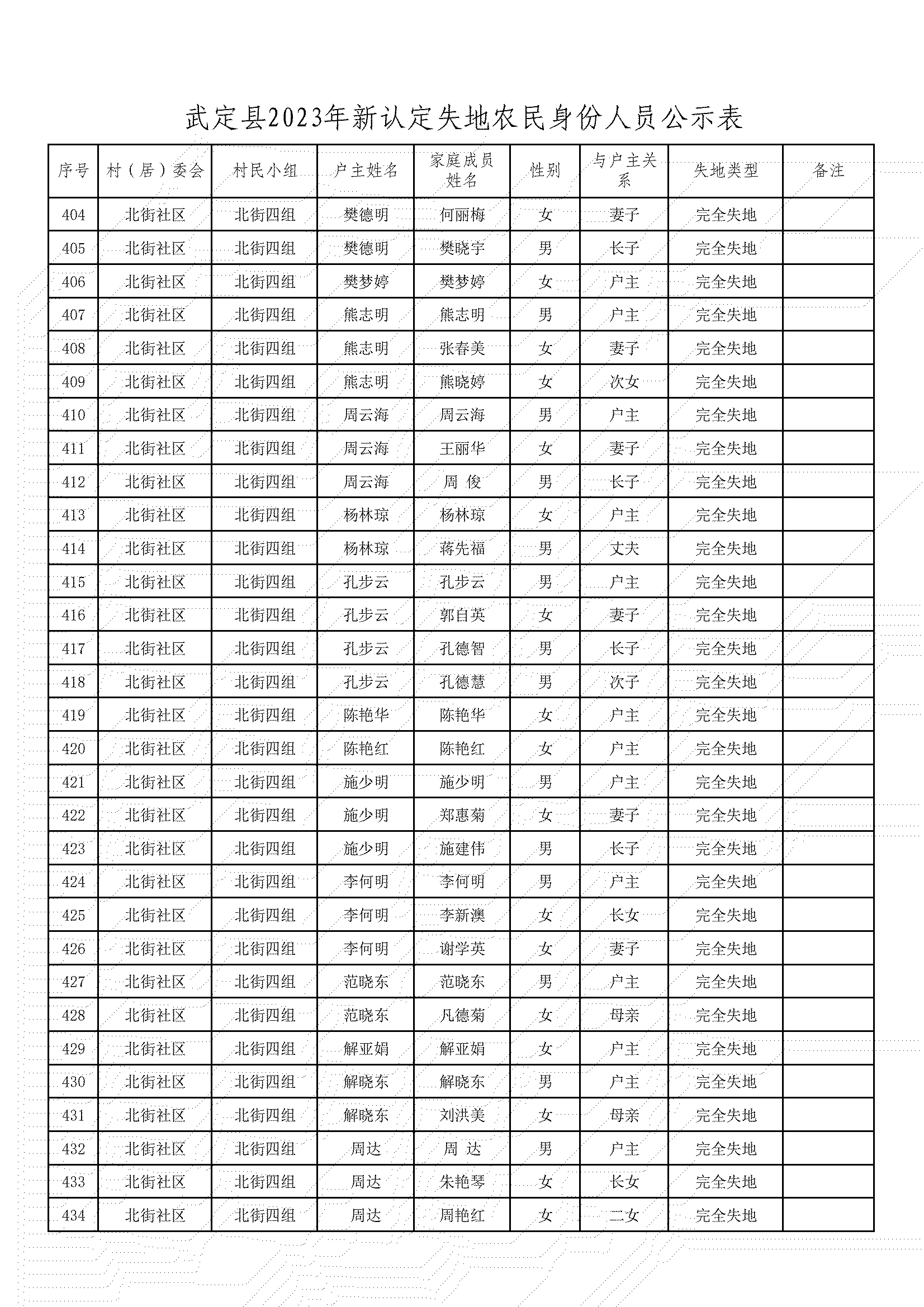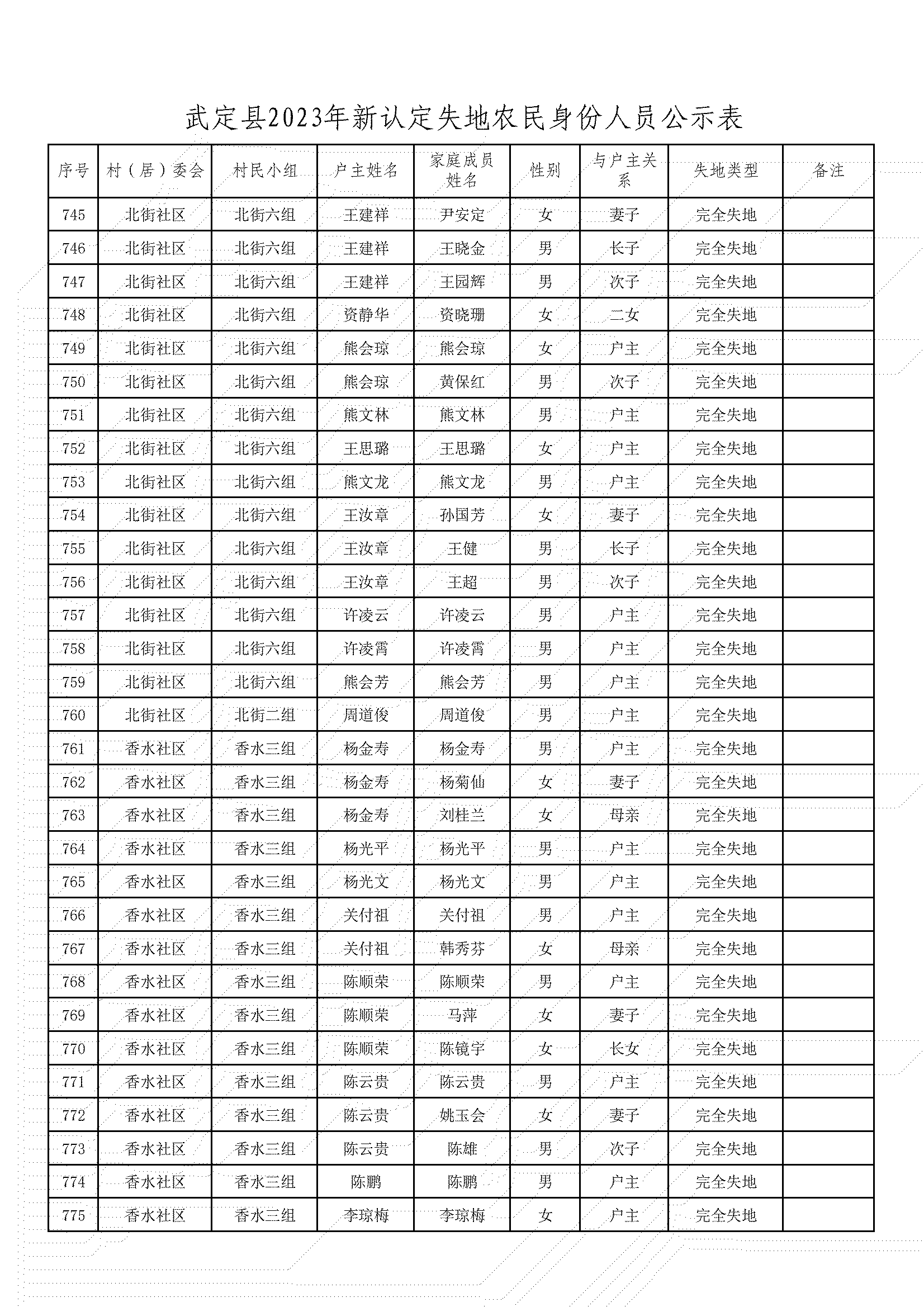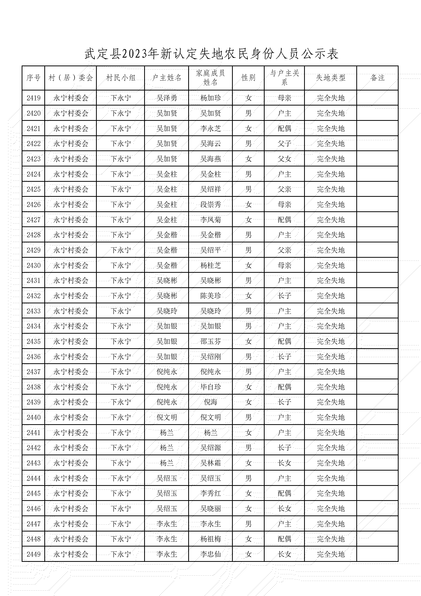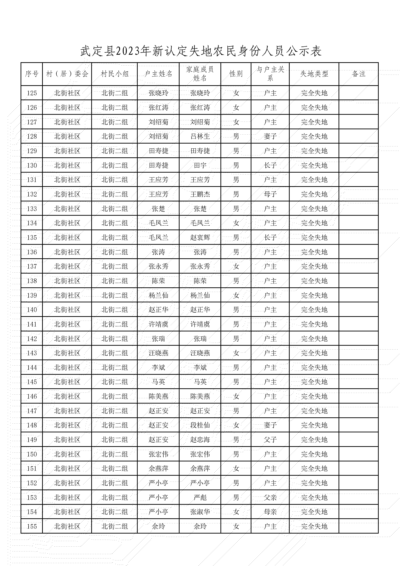 根据《武定县人民政府办公室印发武定县改革完善被征地农民基本养老保障工作实施办法的通知》(武政办发〔2020〕6号)文件精神,经村(居)委会、狮山镇、县公安局、县自然资源局、县农业农村局、县人社局对被征地农民土地征收、户籍人口、参加基本养老保险等情况进行审核,现将2023年符合认定为被征地农民身份的人员予以公示,接受社会监督。公示期从2023年12月18日至2023年12月22日,共5天。公示期间,如对公示对象有异议,请向武定县人力资源和社会保障局社会保险中心反映。