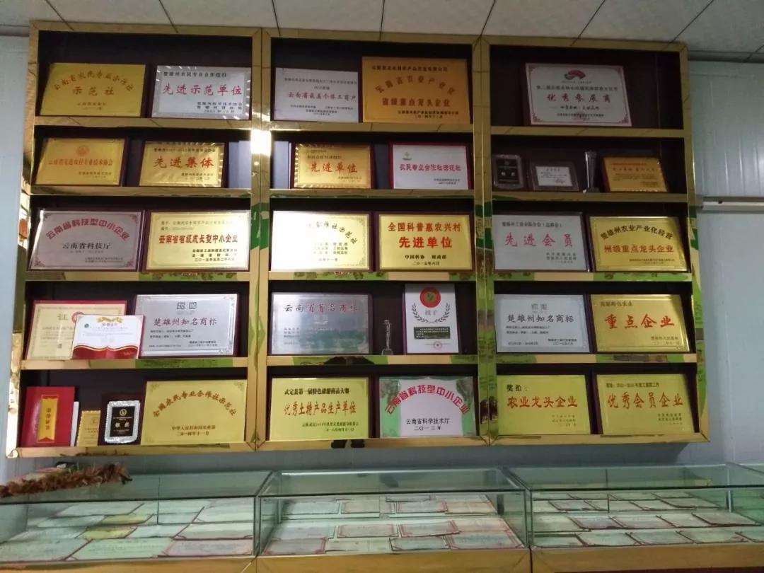 云南武定永银农产品开发有限公司已通过HACCP管理体系认证;荣获云南省著名商标、云南名牌产品、中国昆明国际农业博览会优质农产品(武狮火腿、武定壮鸡);是云南省食品安全示范单位;云南省农业产业化重点龙头企业;国家农民合作社示范社;全国科普惠农兴村先进单位;楚雄州脱贫攻坚工作“扶贫明星企业”;“全国万企帮万村”精准扶贫行动楚雄州示范企业等60余项殊荣。