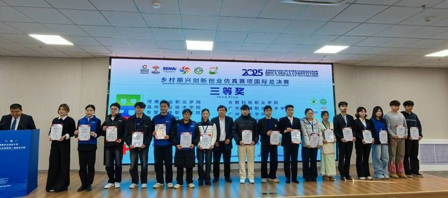 11月17日,2025年金砖国家未来技能和技术挑战赛乡村振兴创新创业仿真赛项国际总决赛在鄂尔多斯圆满落幕。来自云南武定乡村振兴学院(武定县职业高级中学)的叶玖呈、王淇民、胡金会三位同学组成的“环宇兴农”队经过激烈角逐,从国内外众多参赛队伍中脱颖而出,最终荣获该赛项国际总决赛三等奖,成为全国唯一 一支晋级国际总决赛的中职学校参赛队。