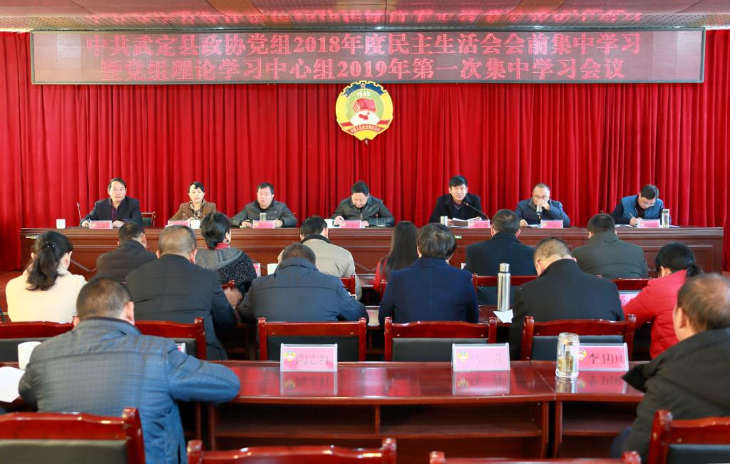2019年1月11日,武定县政协党组召开2018年度民主生活会会前集中学习暨党组理论学习中心组2019年第一次集中学习会议,深入学习贯彻习近平新时代中国特色社会主义思想,高度聚焦2018年度民主生活会主题,树牢“四个意识”,坚定“四个自信”,坚决做到“两个维护”,进一步统一思想,打牢开好民主生活会的思想基础。