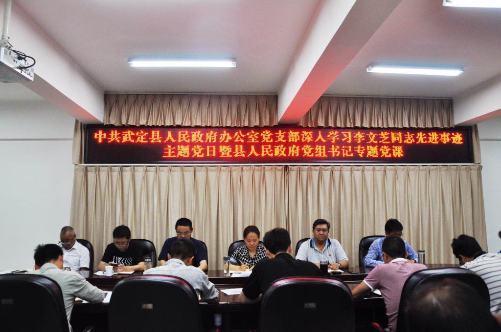 2019年5月7日晚,县政府办公室党支部组织全体干部职工开展深入学习李文芝同志先进事迹主题党日暨县人民政府党组书记专题党课活动,充分发挥先进典型的示范和激励作用,县人民政府县长李坚,副县长杨汉霄、张剑波、自学良、王炳华、林昆以普通党员的身份参加了主题党日活动。