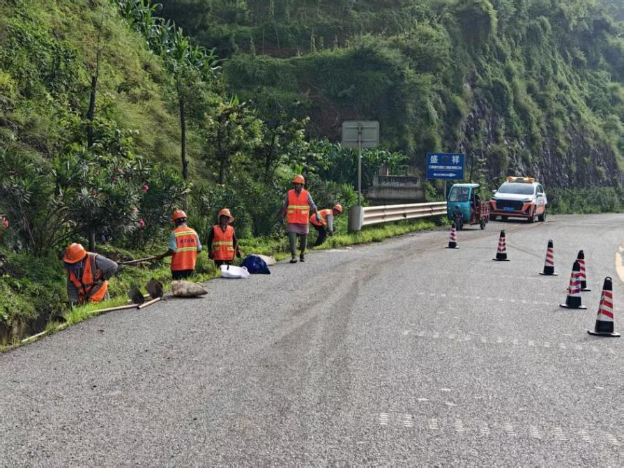 连日来,该路段受持续降雨影响发生坍塌,土石阻塞路面,对通行安全构成严重威胁。时值火把节,县交通运输局立即启动应急预案,科学制定清理方案,第一时间调集人员与机械赶赴现场开展清障工作。同时联合省交通综合行政执法局楚雄支队武定大队开展现场交通疏导保通工作。截至7月17日上午11时,全部坍塌土石清理完毕,边沟顺利疏通,危险路段同步设置安全警示设施,双向车道恢复正常通行能力。此次应急抢险累计投入人员30余人次,各类机械5台次,圆满完成路面安全保畅任务。