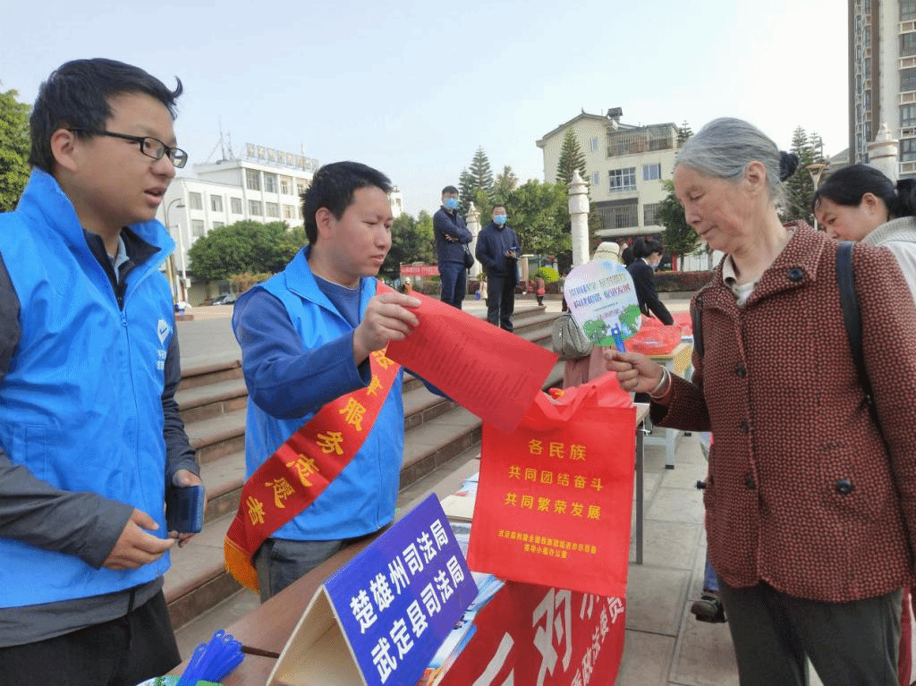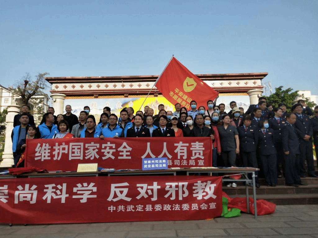 2021年4月11日上午,武定县委普法办联合县委政法委、县委办公室、县人民法院、县人民检察院、县司法局、县委统战部、县民族宗教局、县税务局等多家单位在武定县体育广场组织开展“4·15”全民国家安全教育日普法宣传活动。深入宣传习近平总书记关于总体国家安全观和国家安全工作的重要论述,充分认识坚持总体国家安全观、维护国家安全的丰富内涵和重大意义。着重宣传国家安全法、反间谍法、反恐怖主义法、核安全法、网络安全法等涉国家安全法律,突出宣传传染病防治法、突发事件应对法、野生动物保护法、国境卫生检疫法等法律法规,切实增强全民国家安全意识和法治意识。