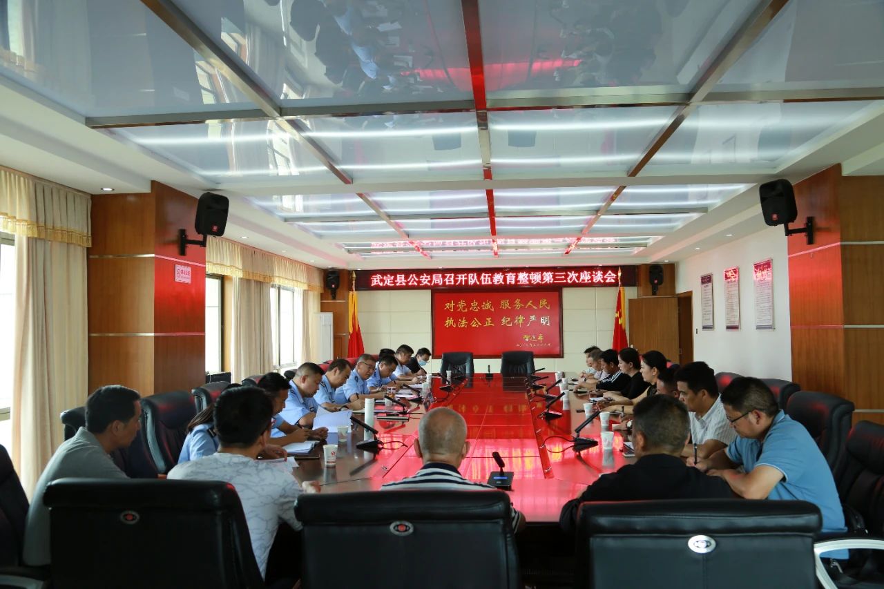 7月7日上午,武定县公安局召开全县公安机关队伍教育整顿第三次座谈会,县级机关“两代表一委员”、企业代表、党风政风警风监督员代表、社区干部代表、管理服务对象以及群众代表20余人应邀参加座谈会,武定县公安局党委副书记、政委闫开华代表局党委向与会代表作报告,县局各部门主要负责人参会。