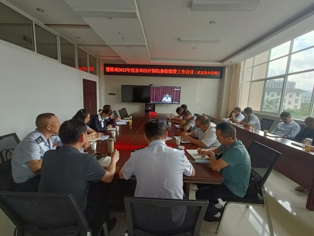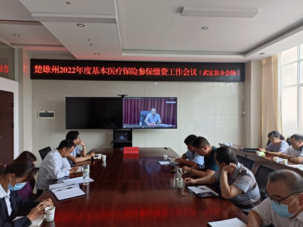 为全面总结2021年全州基本医疗保险参保工作,安排部署2022年基本医疗保险参保缴费工作,8月26日,州医疗保障局、州税务局联合召开全州2022年基本医疗保险参保征缴工作视频会议。武定县医疗保障局、武定县税务局、中国农业银行武定支行、武定县农村信用联合社等单位主要领导和分管领导、相关股室负责人及经办工作人员在武定县分会场参加会议。