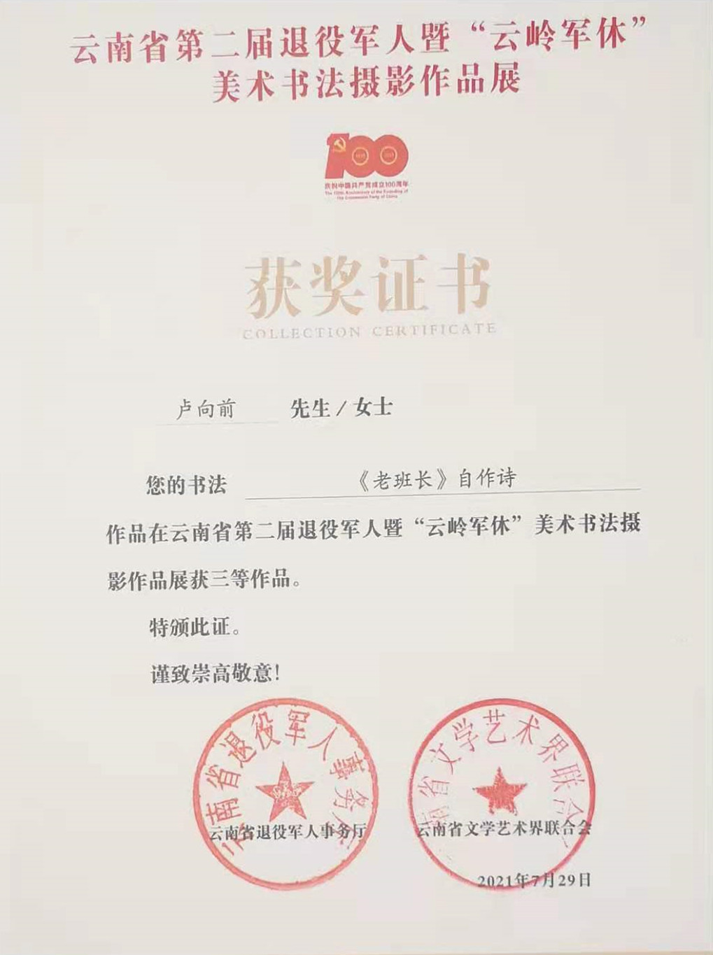 近日,由云南省退役军人事务厅云南省文学艺术界联合会共同举办的第二届“云岭军休”美术书法摄影作品展系列活动中,武定县退役军人事务局选送的书法作品“老连长”自作诗获得三等奖。