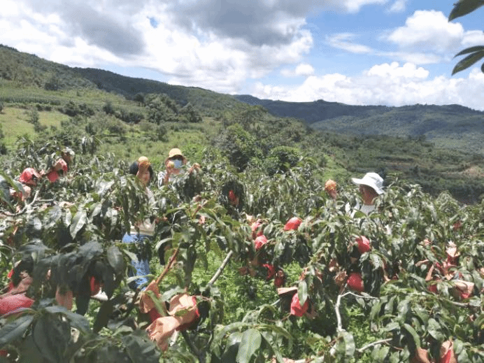 椅子甸村委会毕祖村历来有种植林果的传统,但是一直没有找到适合当地气候、土壤的林果品种,种植出来的林果品质不好,卖不上好价钱,乡村振兴的任务十分艰巨,群众渴望找到一条增收致富的路子。在脱贫攻坚产业发展中,武定县农业农村局开展党员科技骨干联系服务企业活动,与企业共谋因地制宜发展产业之计。云南兴牧养殖有限公司在椅子甸村委会毕祖村建立种养殖基地,在发展黑山羊养殖的同时,发展100亩优质黄桃种植,带动群众脱贫致富。县农业农村局以党史学习教育为契机,充分发挥基层党支部先锋模范作用,以“党建+科技服务”积极组织农业科技人员深入挂包联系企业开展“四万三进”和“我为群众办实事”活动,加强对种植园黄桃种植技术的指导、服务。我为群众办实事硕果累累。看着眼前茂密的桃树枝上早已挂满如杯子般大的黄桃,有的表皮已经微微泛红,长势喜人。基地负责人王兴鸿介绍说:“今年我们种植的黄桃,产量有望突破15000公斤,收入可达30万元。为有效利用这里得天独厚的自然资源、气候条件、地理优势,下一步,我们将扩大优质黄桃种植,计划增加种植500亩。”