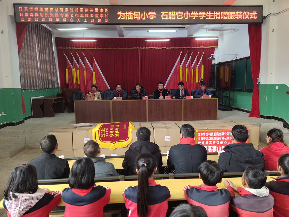 捐赠仪式由插甸小学高兰珍校长主持。少先队员代表为来宾敬献了红领巾;插甸镇党委副书记镇长宋春宇同志为本次活动致了欢迎辞;甘肃春风纺织集团有限公司李恩孝董事长作了讲话;武定县高桥镇爱心人士赵建友先生对广大学子们提出了殷切希望;武定县教育体育局书记局长祖正文代表武定县接受江苏华恒科技发展有限公司张建英董事长、甘肃春风纺织集团有限公司李恩孝董事长、武定县高桥镇爱心人士赵建友捐赠毛衣1620件,价值486000元。