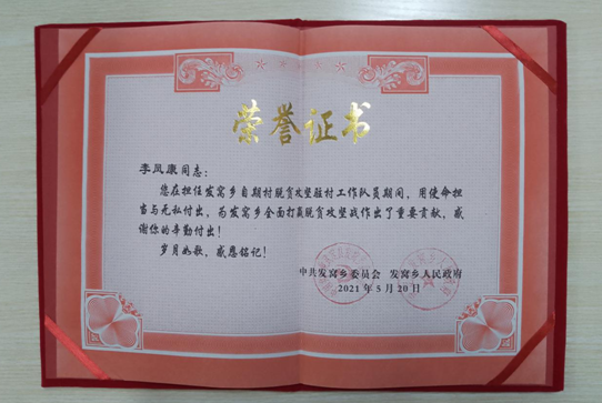 2021年7月12日早,武定县政务服务管理局刚上班的李凤康股长就收到发窝乡党委、发窝乡人民政府专门派人送来的《荣誉证书》。原来,李凤康同志在2015年3月至2017年3月期间,在发窝乡自期村委会担任脱贫攻坚驻村工作队员。在此期间,该村委会脱贫攻坚工作成效显著,为发窝自期村委会脱贫攻坚取得最后胜利打下了坚实基础。成绩的背后,确实凝聚着一批又一批驻村工作队员辛勤的汗水。这本发窝乡党委、乡人民政府送来的《荣誉证书》显得更加的厚重与珍贵,这是乡党委、政府对李凤康同志2年来工作的充分肯定。岁月如歌,感恩铭记。