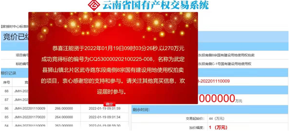 在武定县公共资源交易中心和云南金槌拍卖有限公司精心组织和周密安排下,经过1月19日、20日两天角逐,8宗国有建设用地使用权在379轮次激烈竞价后完美成交:总参考起拍价304.8万元,总成交价1495万元,共增值1190.2万元;成交均价18629.98元/㎡,拍卖溢价率达390.49%,创武定县国有产权交易历史新高。其中,第一宗地单宗交易起拍价44万元,成交价270万元,拍卖溢价率高达513.6%,创武定国有产权交易溢价率之最,迎来武定县2022年产权电子化交易开门红!【武定县政务服务管理局 赵赟平 张勇】
