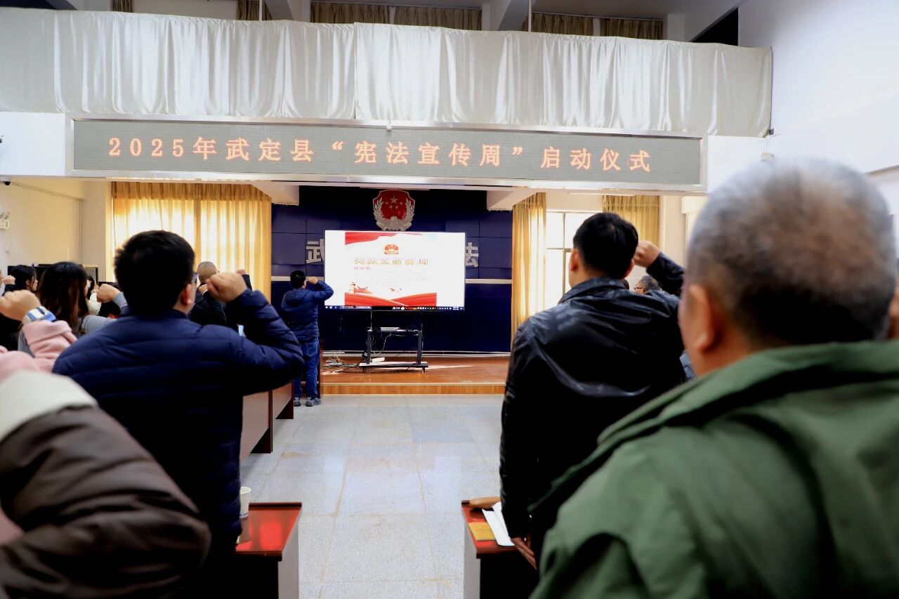 12月2日下午,在县司法局党组书记、局长的带领下,宪法宣誓活动正在此进行。该次会议以县人大、政协、县委宣传部、县级部分执法单位、群团组织、政法干警、新闻媒体记者、律师等各方代表、县委普法与依法治理工作领导小组成员,以及县司法局全体干部职工约80人共同参加了“武定县2025年‘宪法宣传周’启动仪式”。