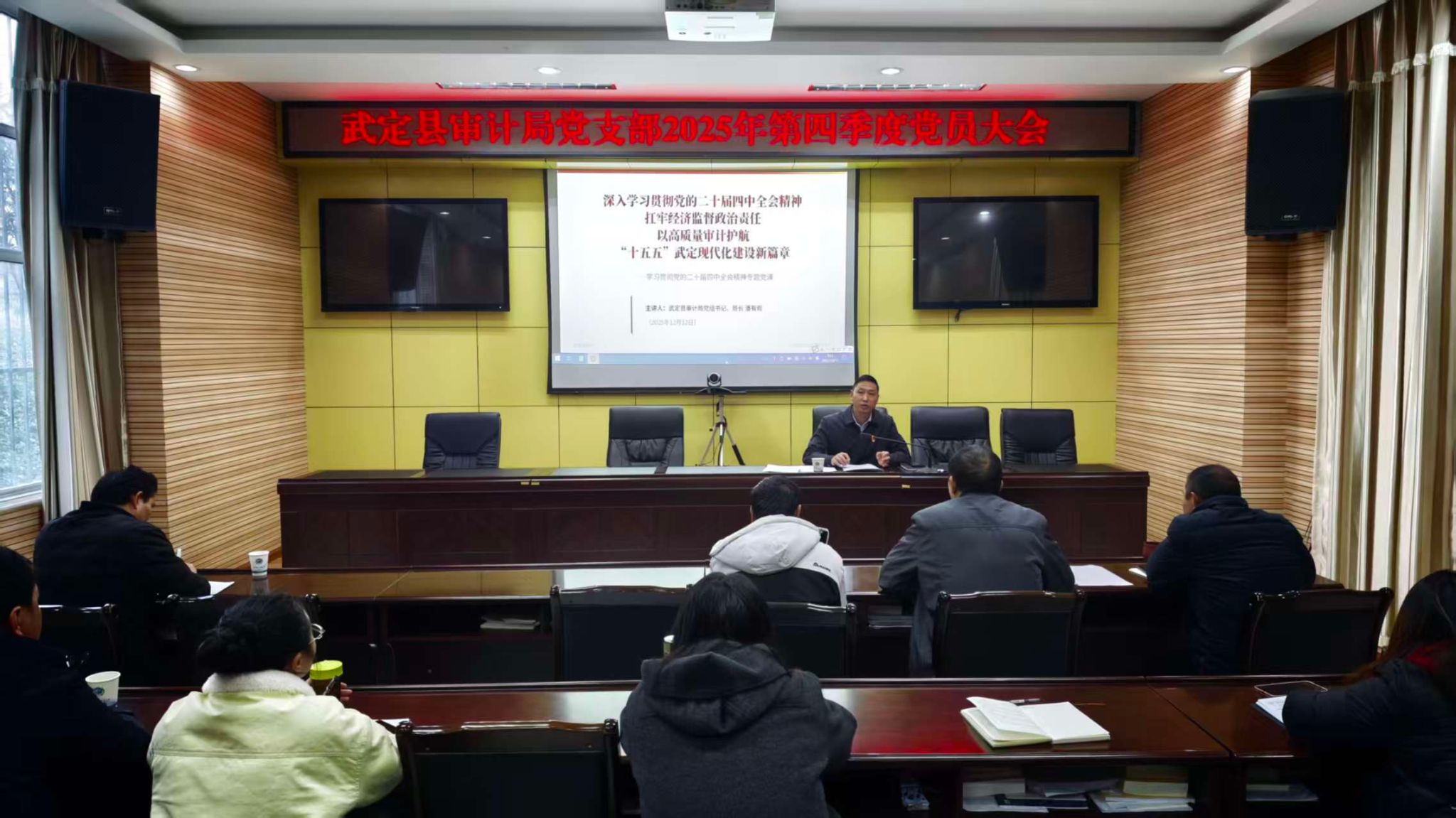 近日,武定县审计局党支部召开第四季度党员大会,专题学习贯彻党的二十届四中全会精神,局党组书记、局长潘有观为全体党员干部讲授专题党课。