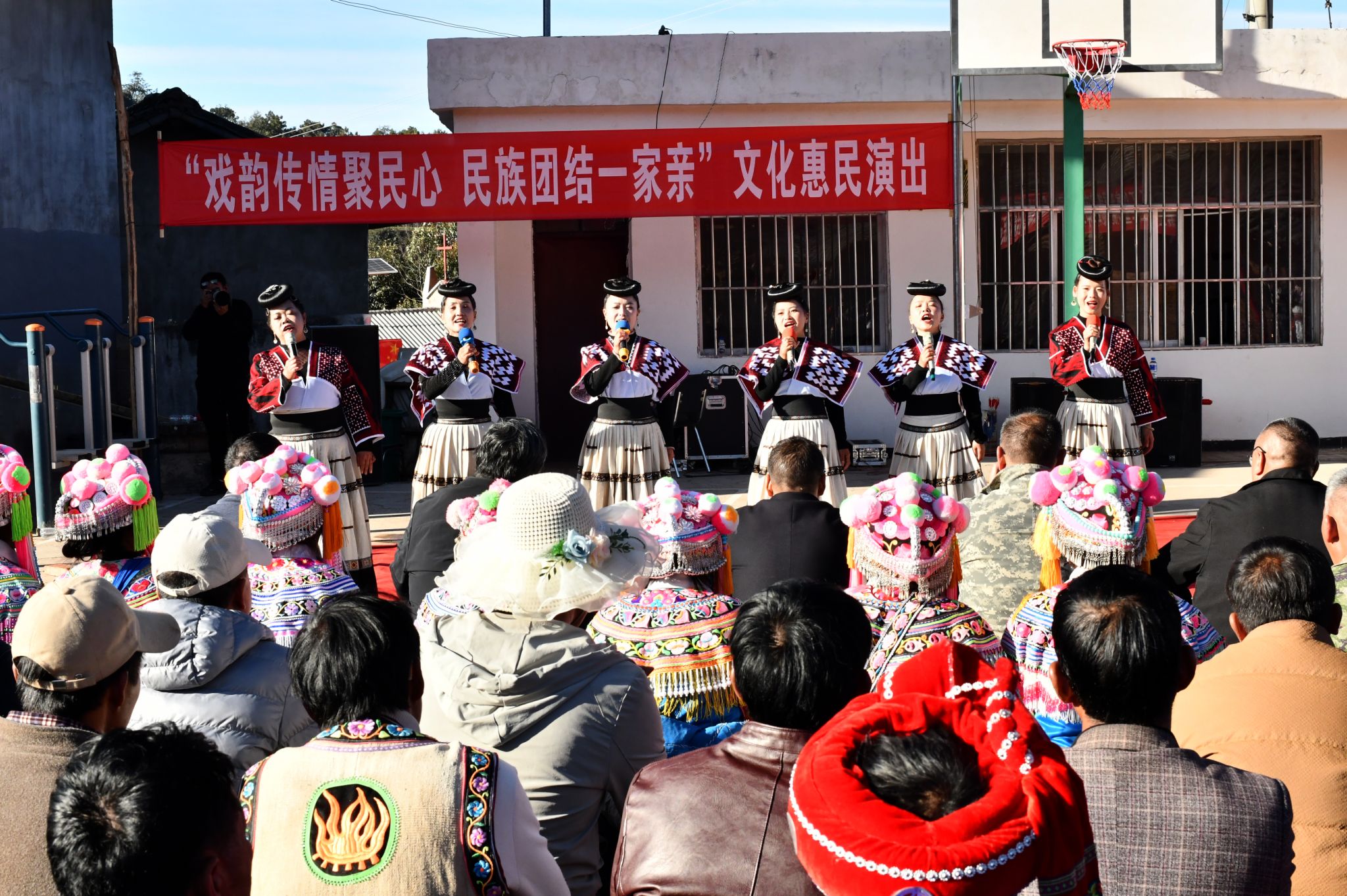 文体活动进村寨,同心互动添活力。武定县政协组织政协委员和界别群众在半山村委会老王坡村开展以“全会精神润同心民族篮球聚合力”“篮球友谊赛”和“戏韵传情聚民心、民族团结一家亲”文化惠民为主题的演出活动,委员们以文化浸润的方式铸牢中华民族共同体意识,歌曲《幸福里的人们》、歌伴舞《苗山情》等精彩节目,获得阵阵热烈的掌声。活动最后,“委员群众同吃一顿饭”,委员与群众围坐一起,共享家常便饭,畅谈家乡发展变化,主动倾听群众心声诉求,共商建设美丽家园、促进民族团结之计。