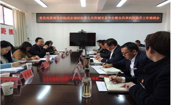 2022年3月2日下午,云南省发改委交易监督处丁宁处长一行到武定县公共资源交易中心开展工作调研,楚雄州展改革委副主任王文书、州公共资源交易中心副主任李育钦陪同。在武定县人民政府办公室主任钱国臣引导下,调研组一行对武定交易中心业务股室、评标区、监控区等进行全方位视察,卢海燕局长作了精细讲解,调研座谈会在武定县政务服务管理局二楼视频会议室举行,王文书副主任主持。