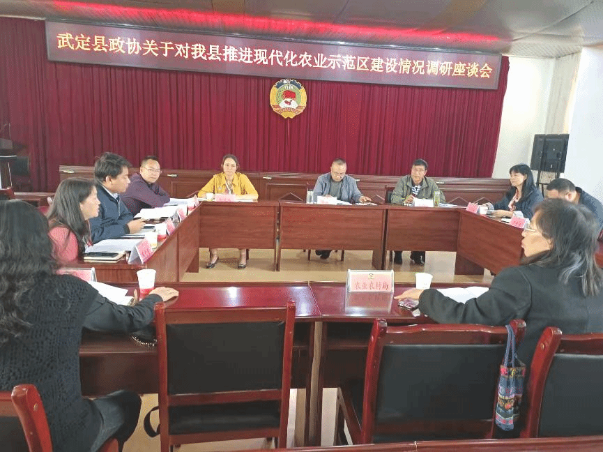 李建云副主席在县政协会议室主持召开调研座谈会,座谈会上,县农业农村局副局长张文武汇报了武定县现代农业示范园区建设推进情况,与会人员结合部门实际为武定县推进现代农业示范区建设建言献策。