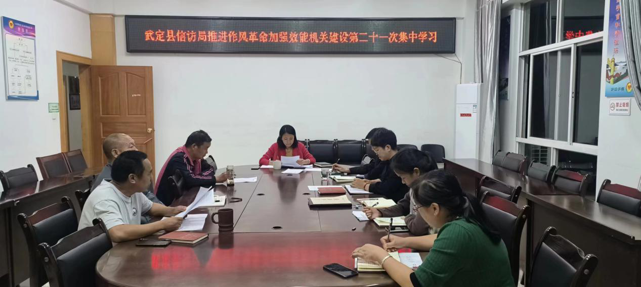 2022年9月26日,武定县信访局召开党组理论学习中心组2022年第六次集中学习暨推进作风革命加强效能机关建设第二十一次集中学习,专题学习了中央纪委国家监委加强对“一把手”和领导班子监督工作座谈推进会精神,以及《中共中央关于加强对“一把手”和领导班子监督的意见》《中共云南省委关于加强对“一把手”和领导班子监督的实施意见》精神。局党组书记王晓萍主持会议,局全体职工参加会议,局班子成员杨学能、闫开琳作交流发言,王晓萍书记作总结并开展集体廉政提醒谈话。