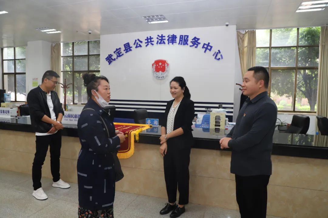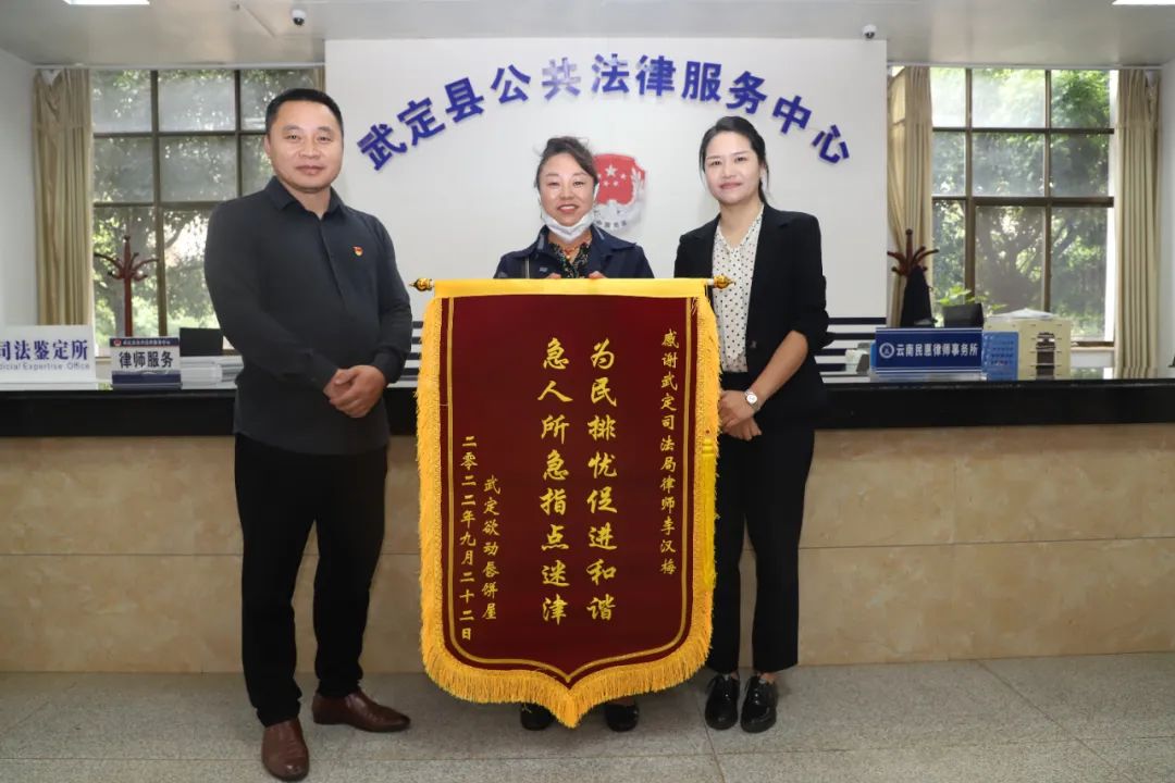2022年9月23日一早,武定某饼屋老板赵女士来到武定县公共法律服务中心,把一面绣有“为民解忧促进和谐 急人所急指点迷津”的锦旗送到云南民惠律师事务所李汉梅律师的手中,以此表示对武定县司法局法律援助工作予以肯定、和对李汉梅律师的衷心感谢。