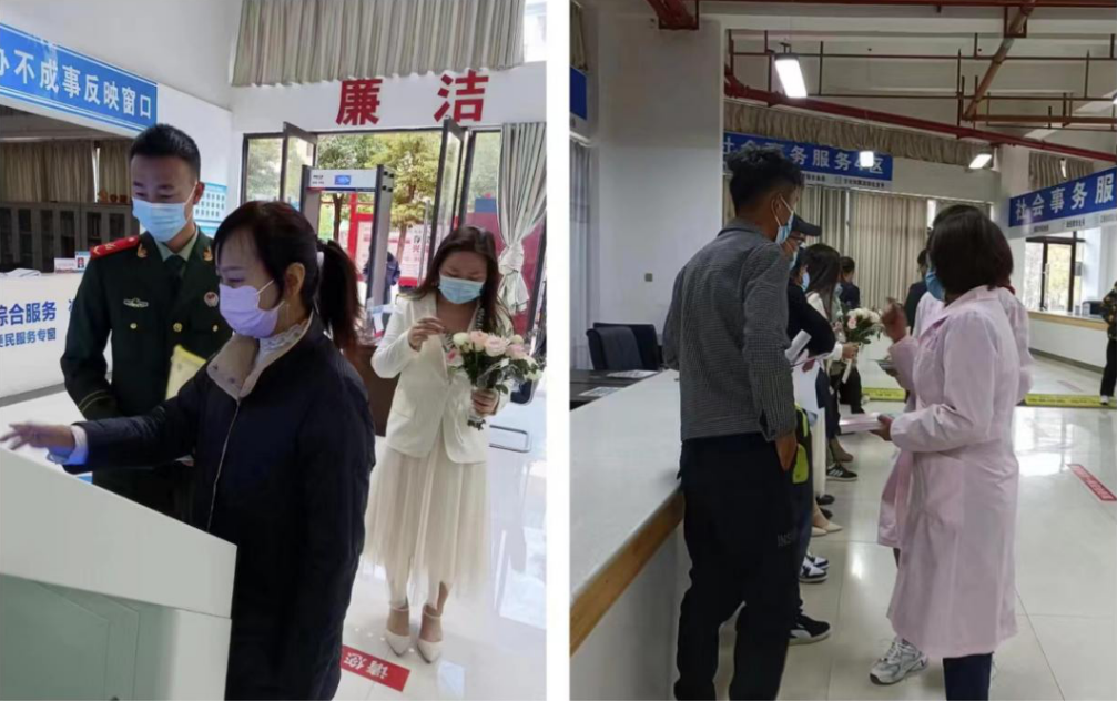 一大早就有多对准新人来到婚姻登记处门口等候,脸上洋溢着满满的幸福。工作人员秉持礼貌服务,“请XX号到婚姻XX号窗口办理业务”的提示音一整天都在登记大厅里回荡,他们为所有登记结婚的新人提供了热情贴心的服务。