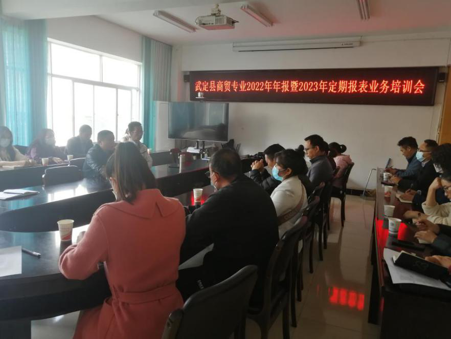 武定县统计局于近日召开商贸专业2022年年报及2023年定期报表业务培训会。县工信商务科技局、县统计局相关领导和专业人员、限额以上商贸企业(个体)统计员参加培训。