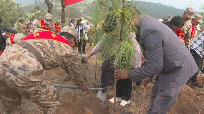 植树现场,新兵们把吃苦耐劳精神投入到紧张的植树劳动中,大家手拿工具、互帮互助、密切配合,认真按照每一道植树工序要求,扶苗栽植的、铲土填坑的、培土压实的,提桶浇水的,虽然鞋上沾满了泥土,但脸上尽是笑容,一派的繁忙景象把旁边石头上“参军林”三个鲜红的大字映衬得格外明亮闪光。